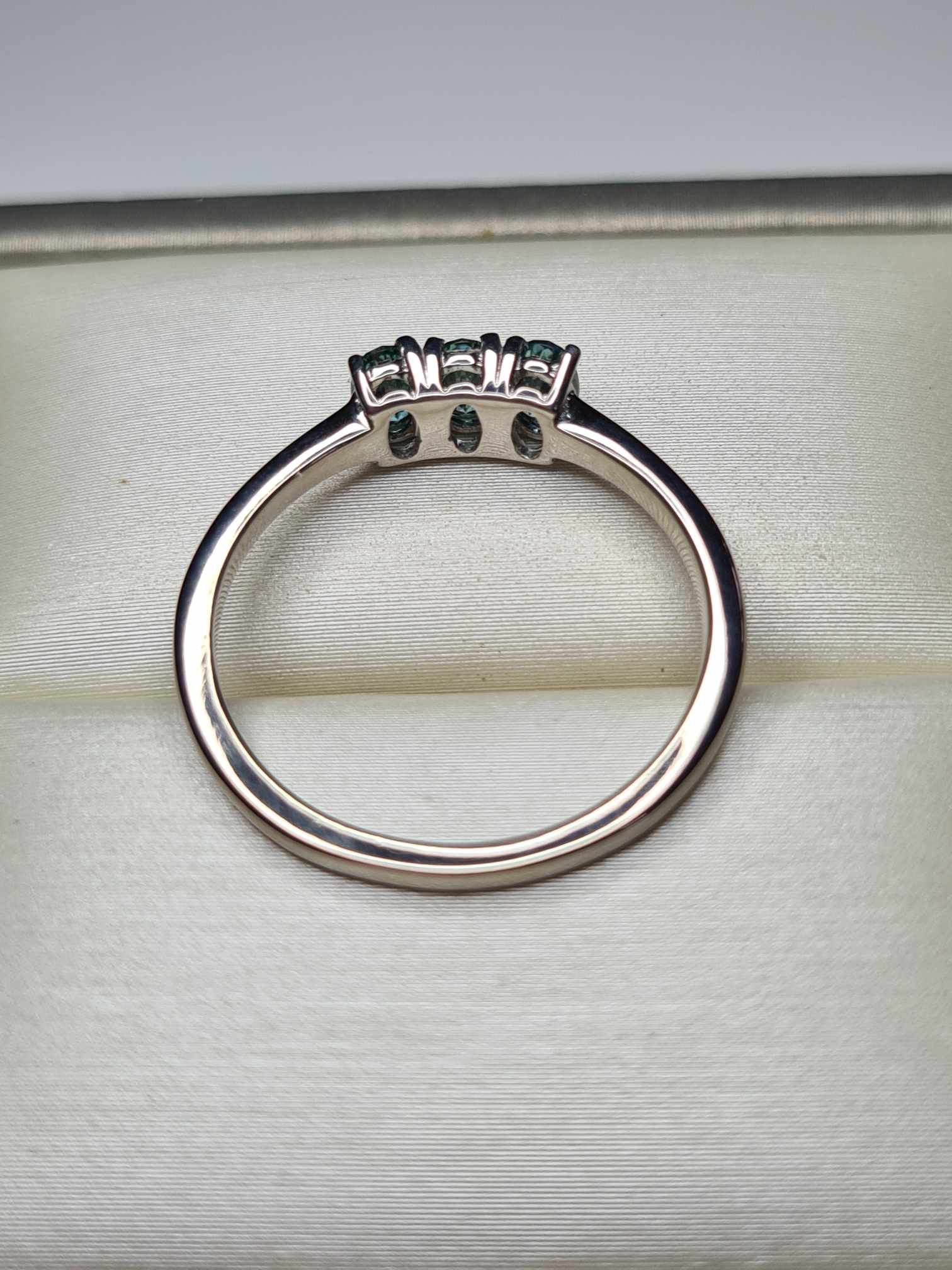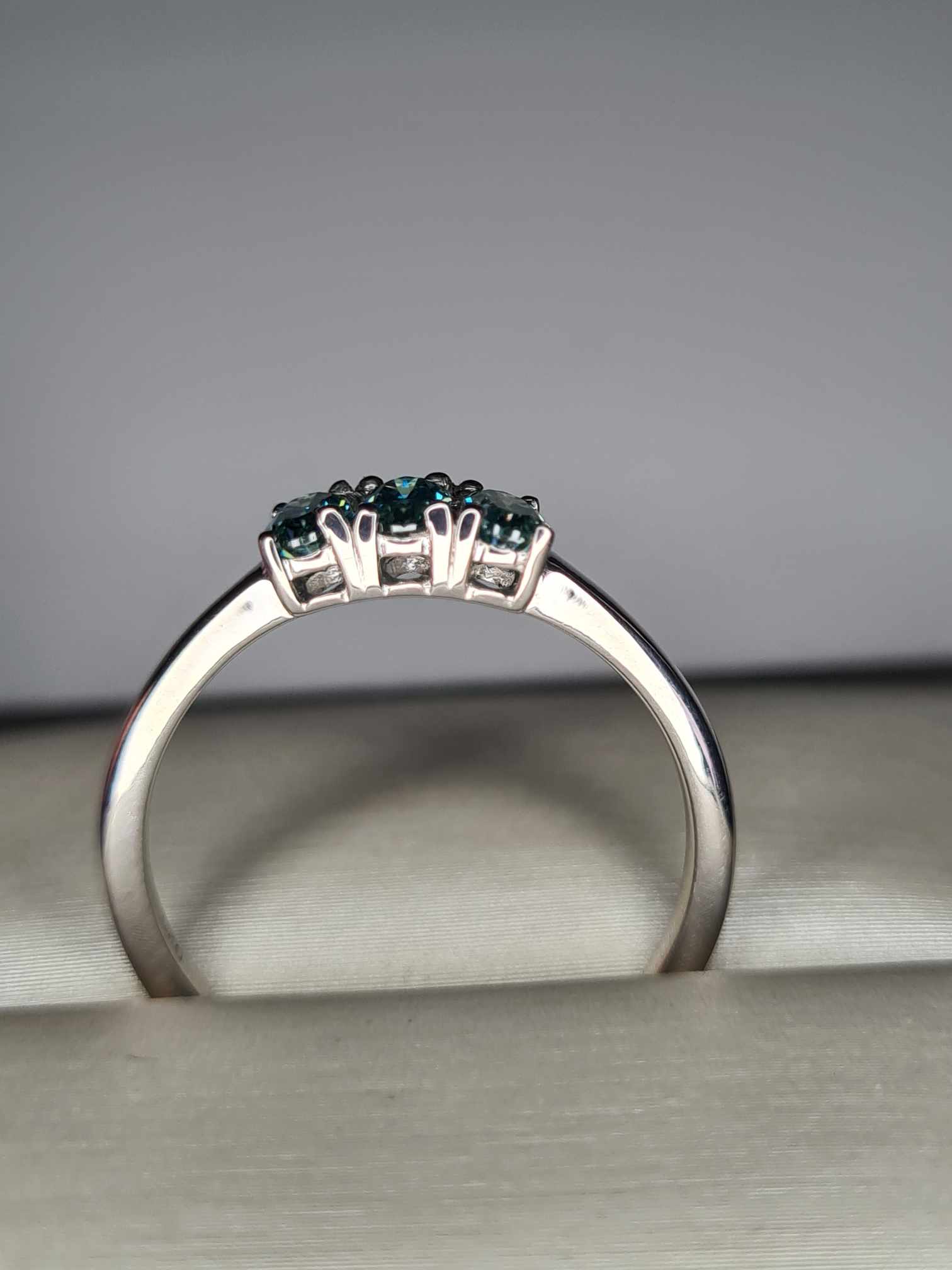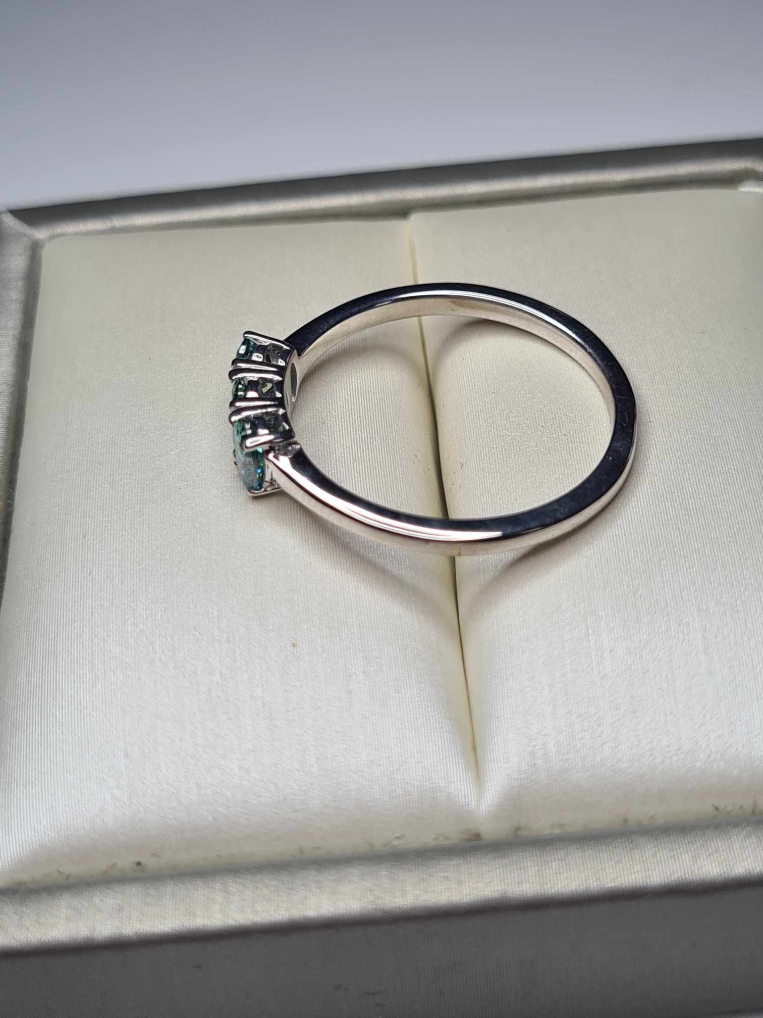Stunning light blue moissanite with hints of green, perfect for daily or engagement wear