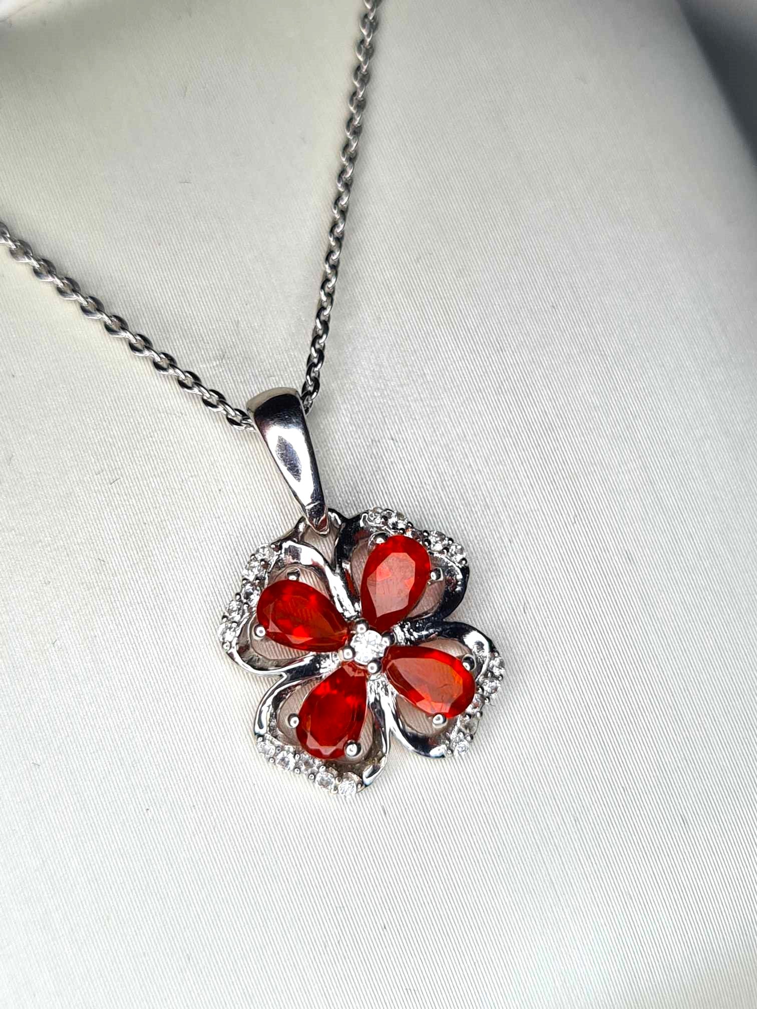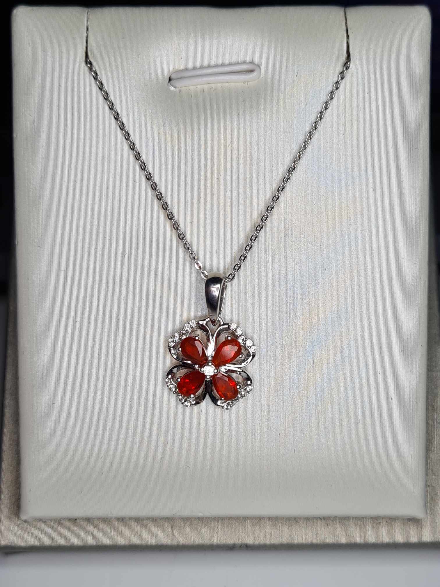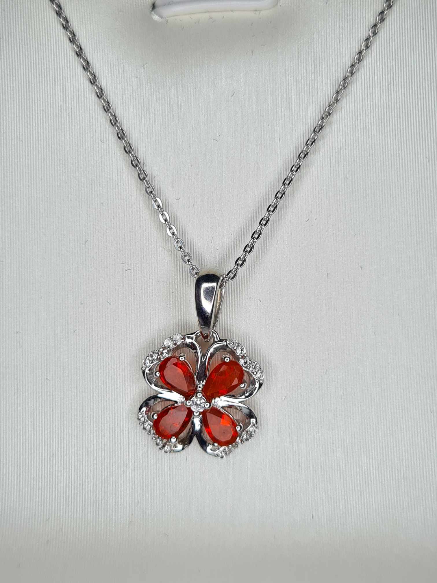 Introducing our 0.790ct. Fire Opal & Natural Zircon Clover Necklace in Platinum Overlay 925 Sterling Silver—an exquisite piece that radiates beauty and sophistication, adding a touch of glamour to your jewellery collection. This necklace is not just an accessory; it's a stunning fusion of vibrant Fire Opal and sparkling Natural Zircon, crafted with precision and passion.