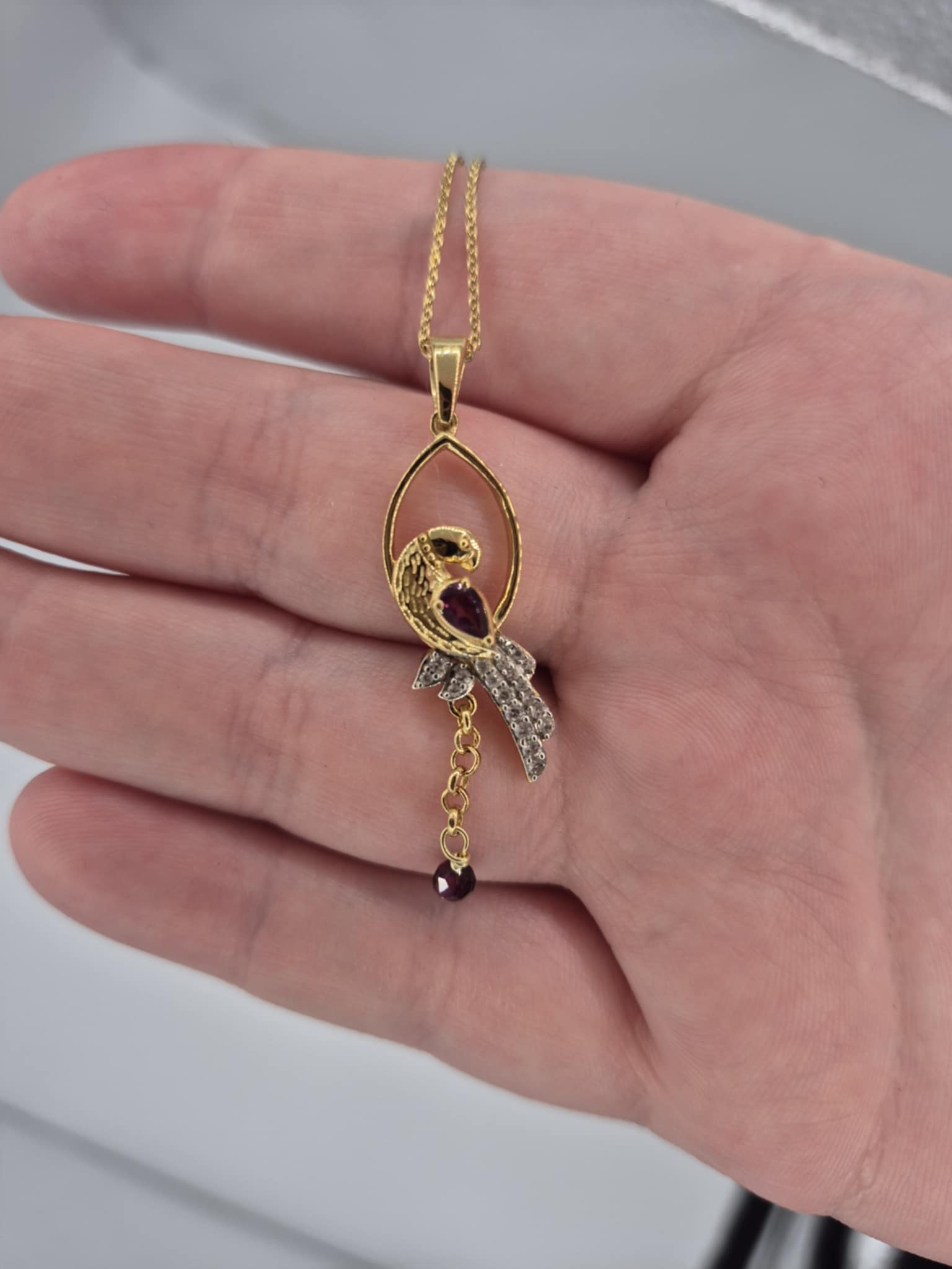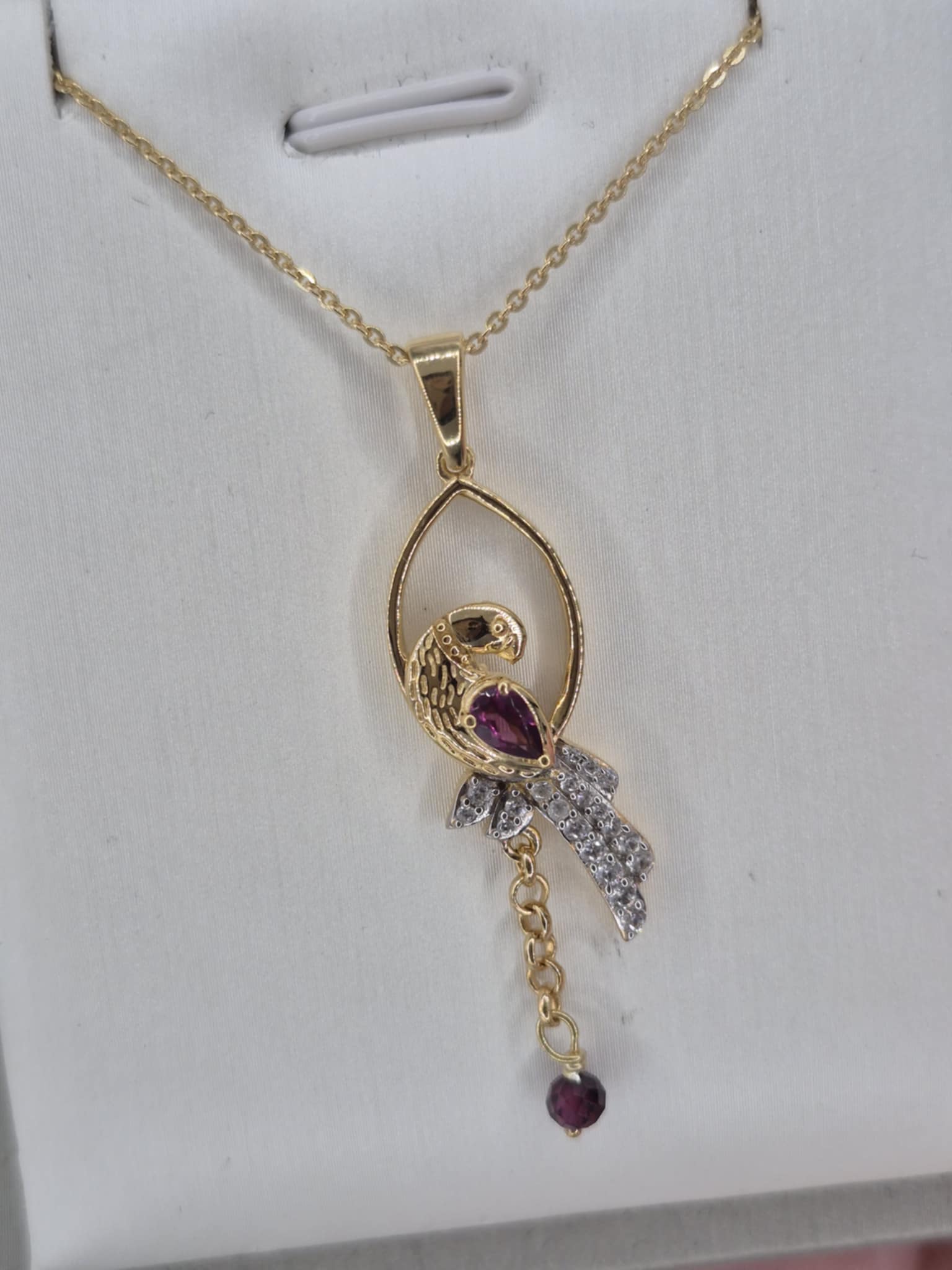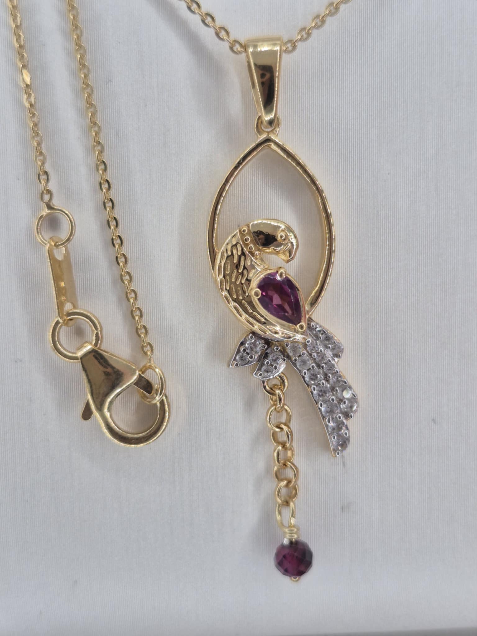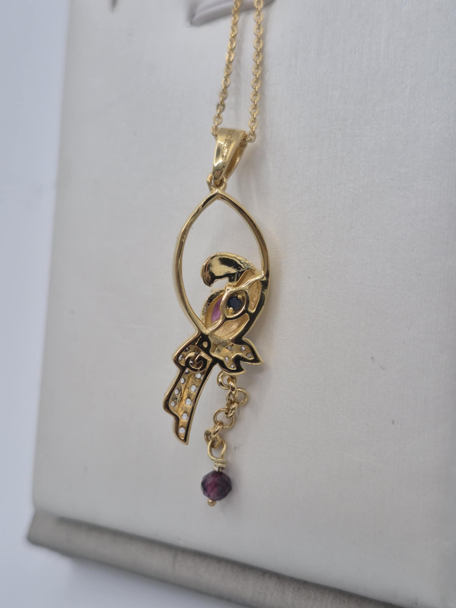 0.910ct. Rhodolite Garnet, White Zircon, Blue Sapphire Bird Necklace in 18K Gold Overlay 925 Sterling Silver