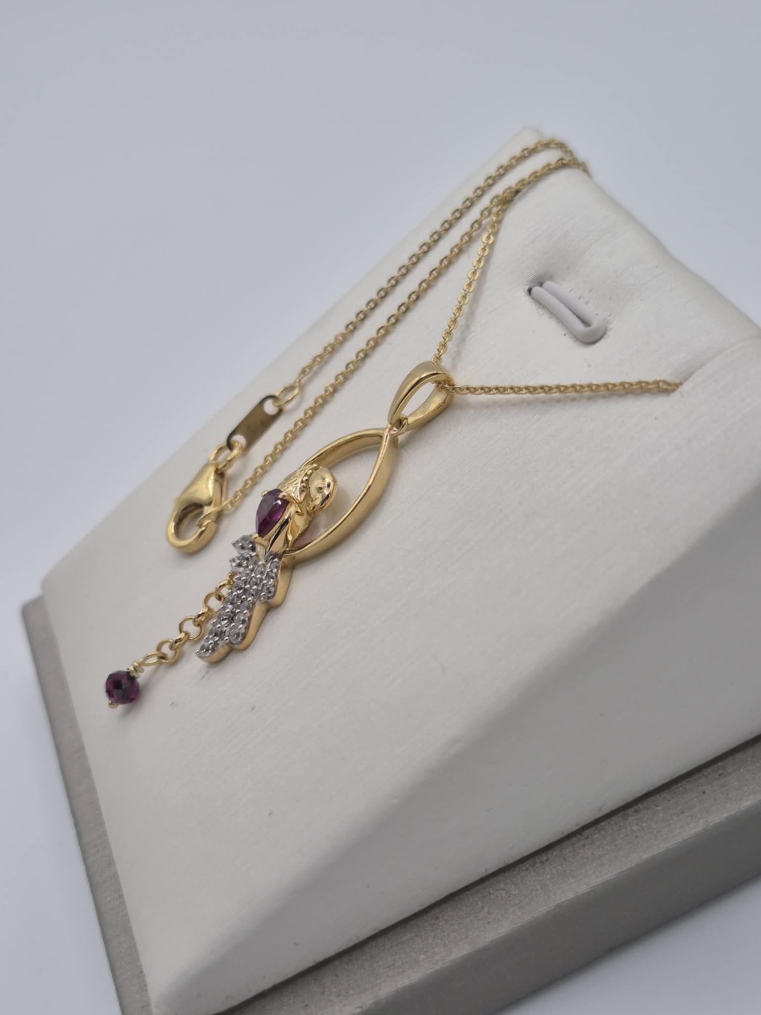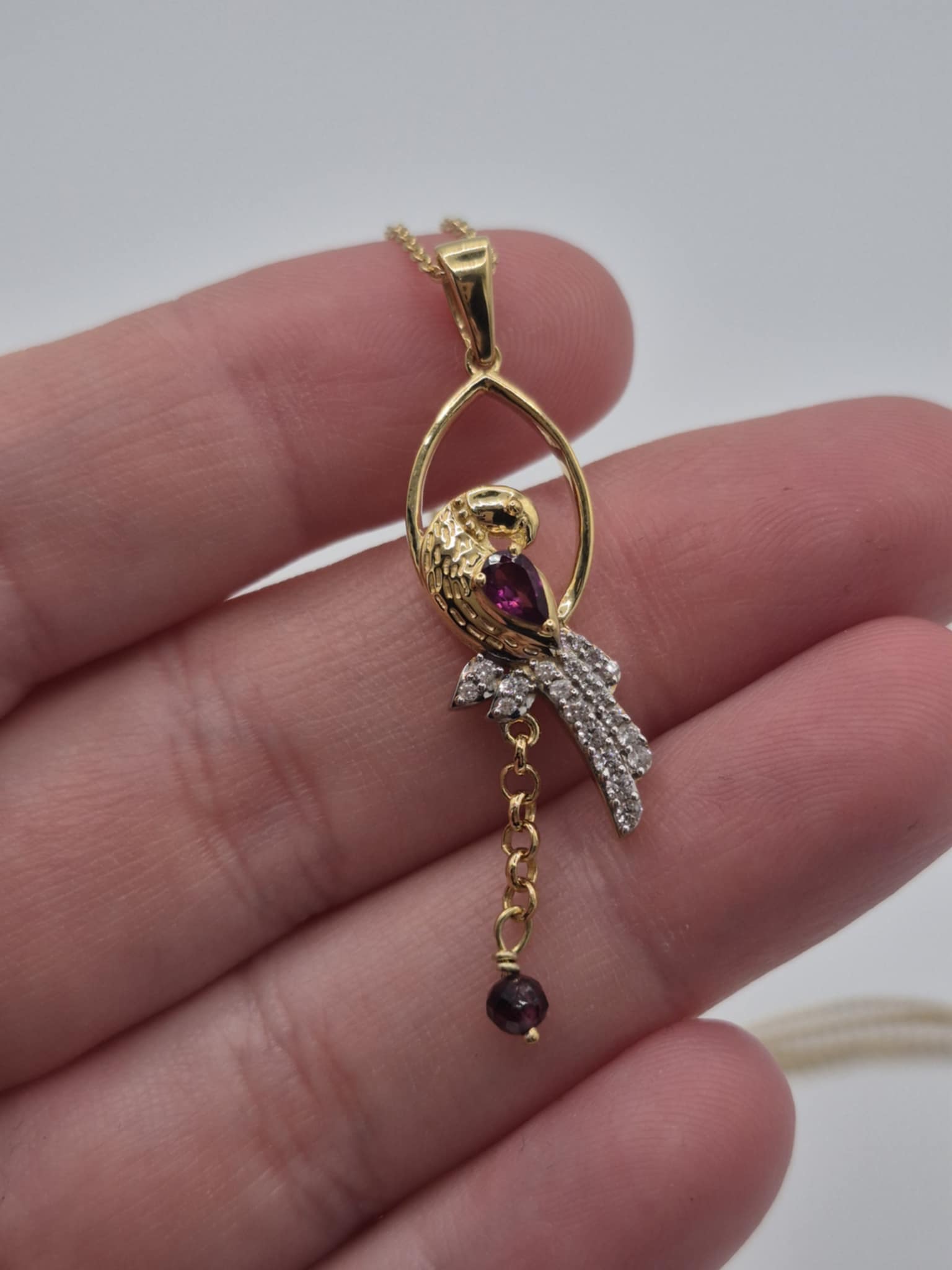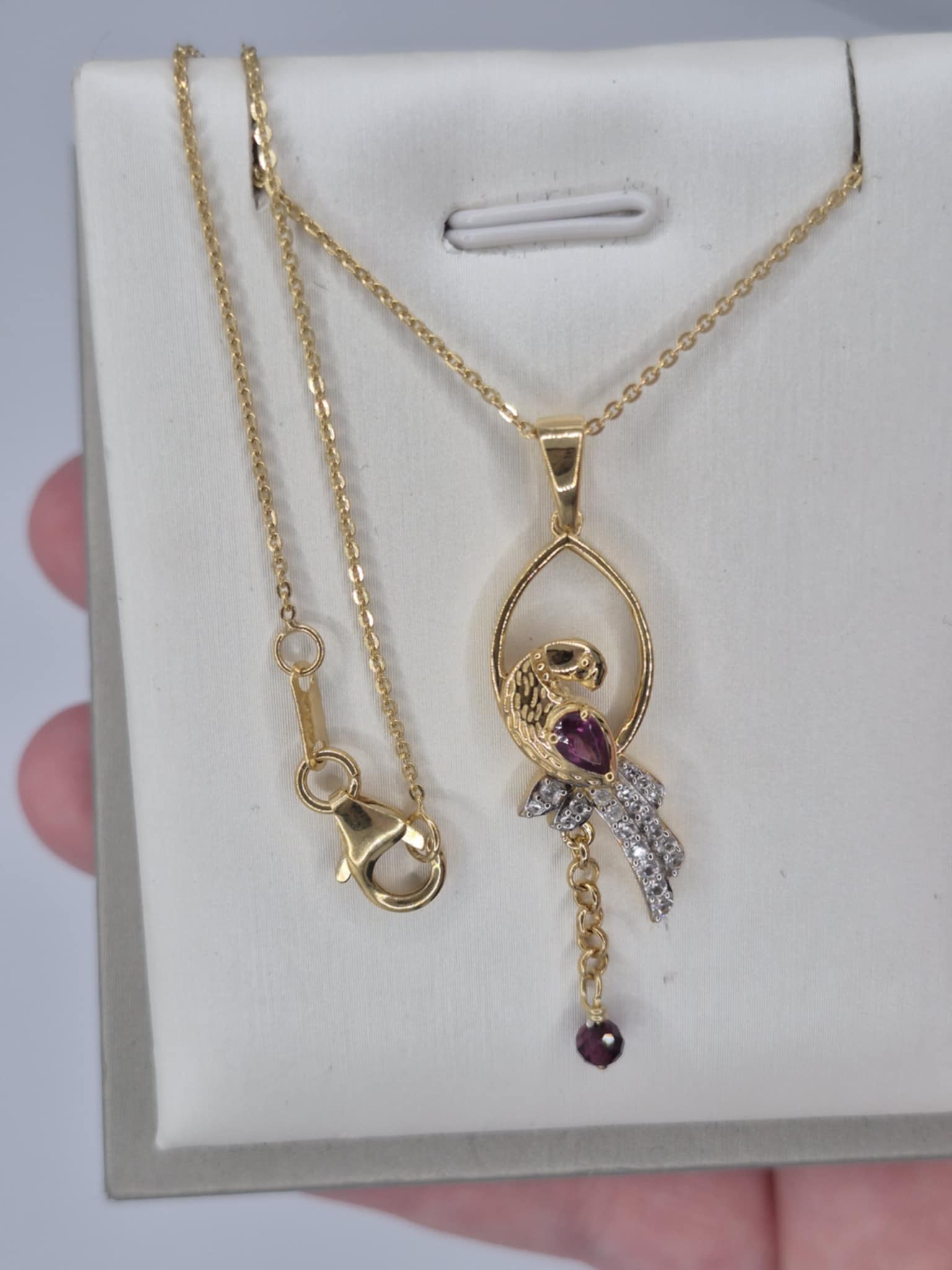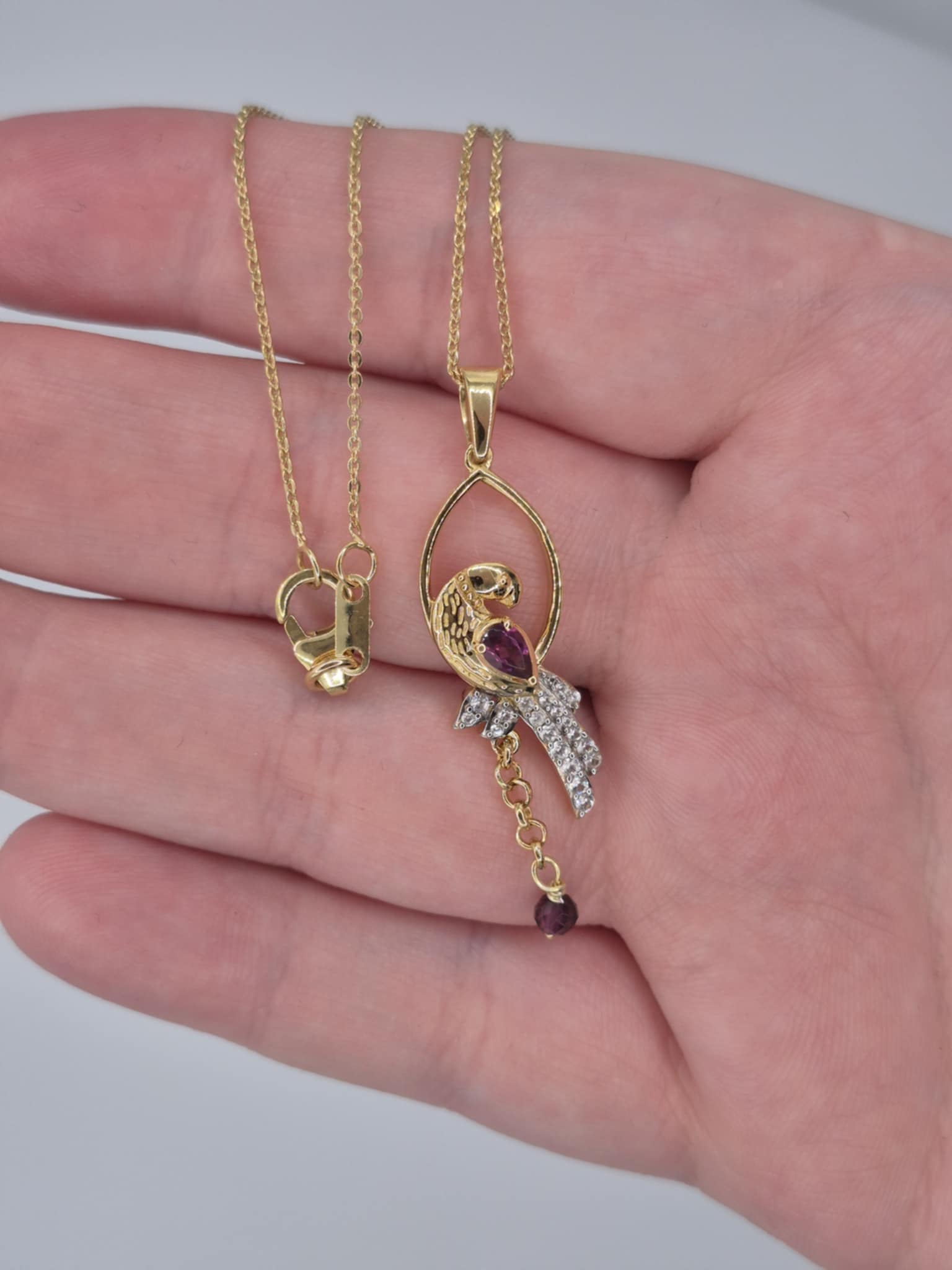 0.910ct. Rhodolite Garnet, White Zircon, Blue Sapphire Bird Necklace in 18K Gold Overlay 925 Sterling Silver