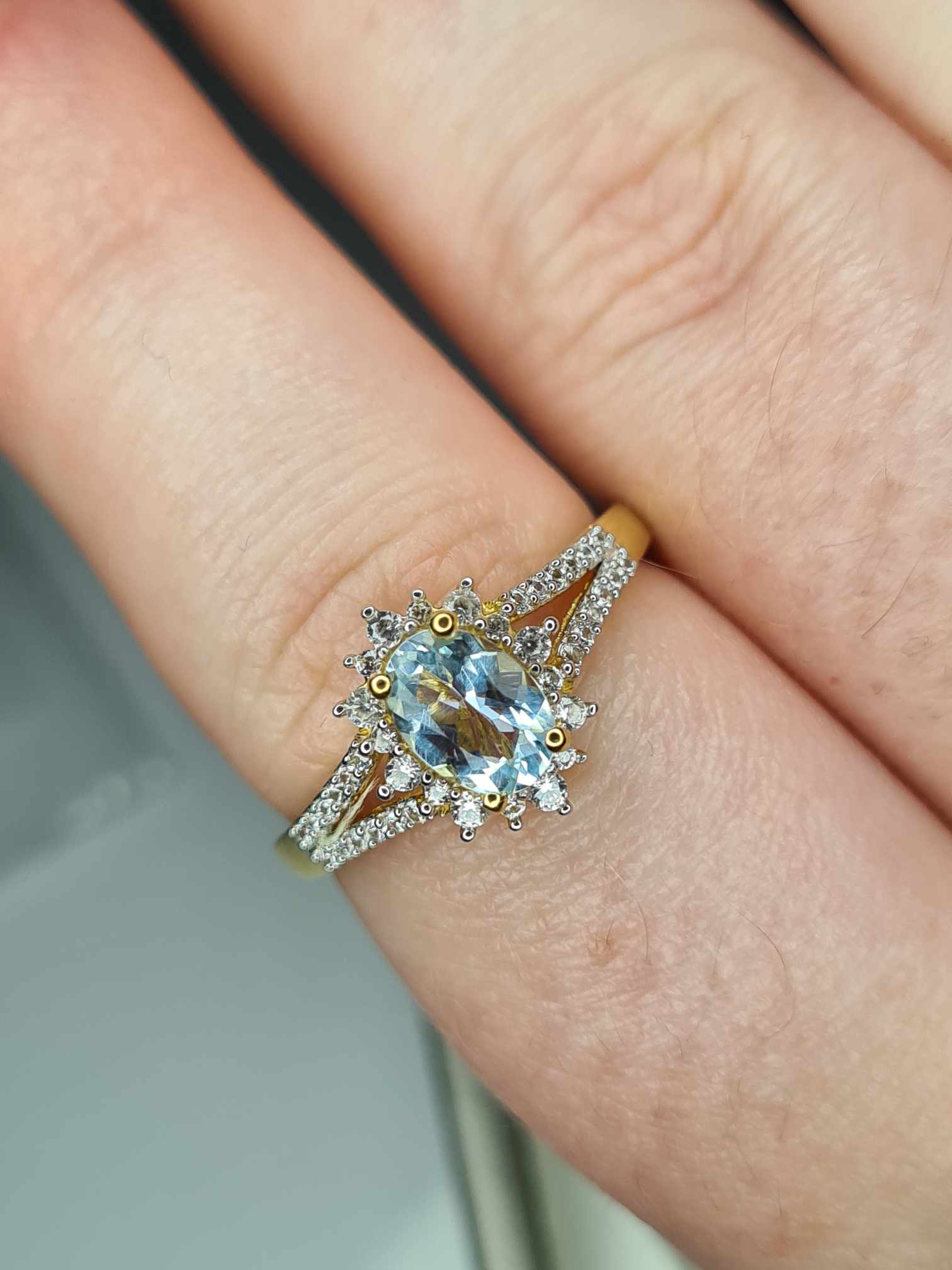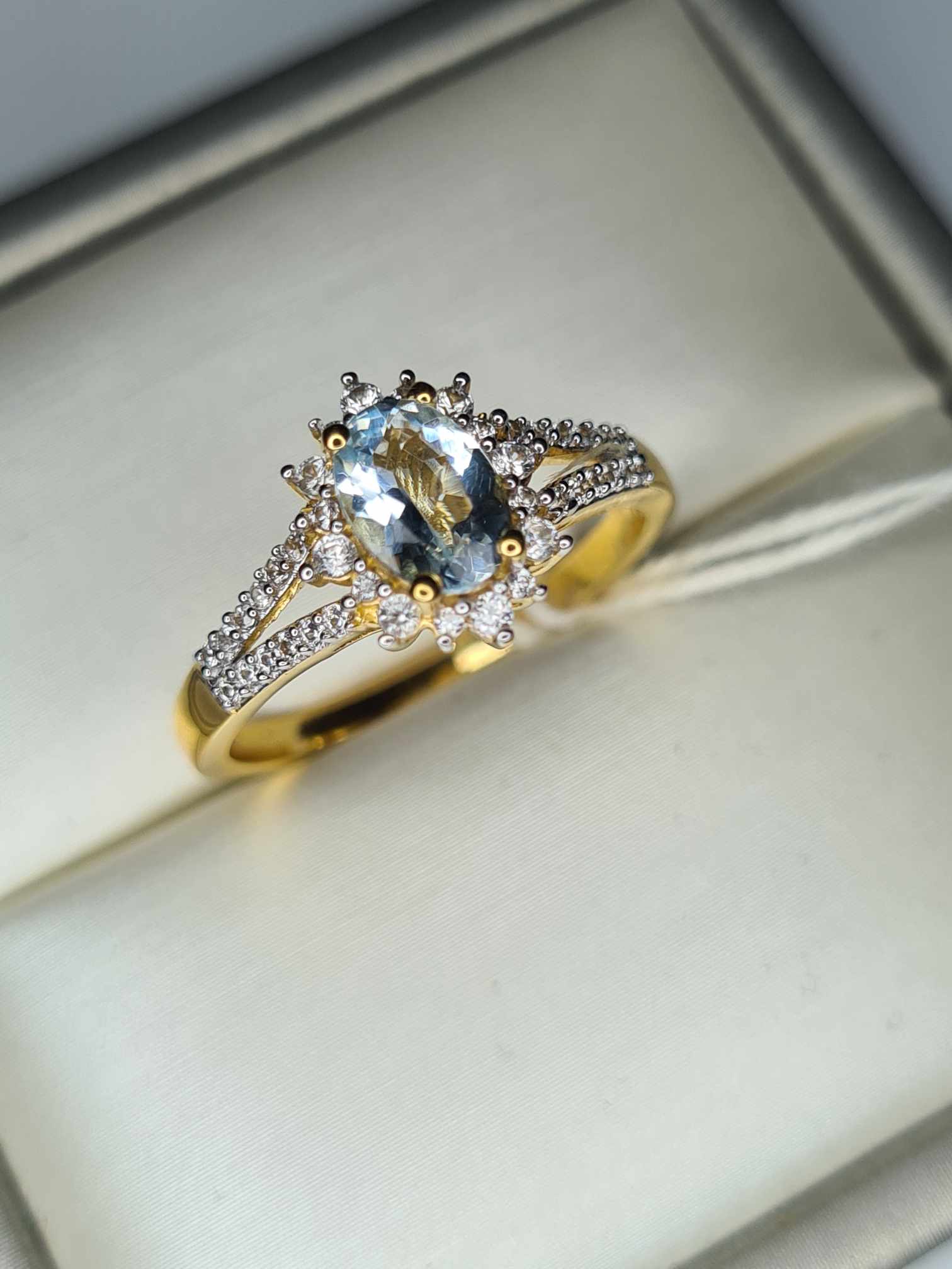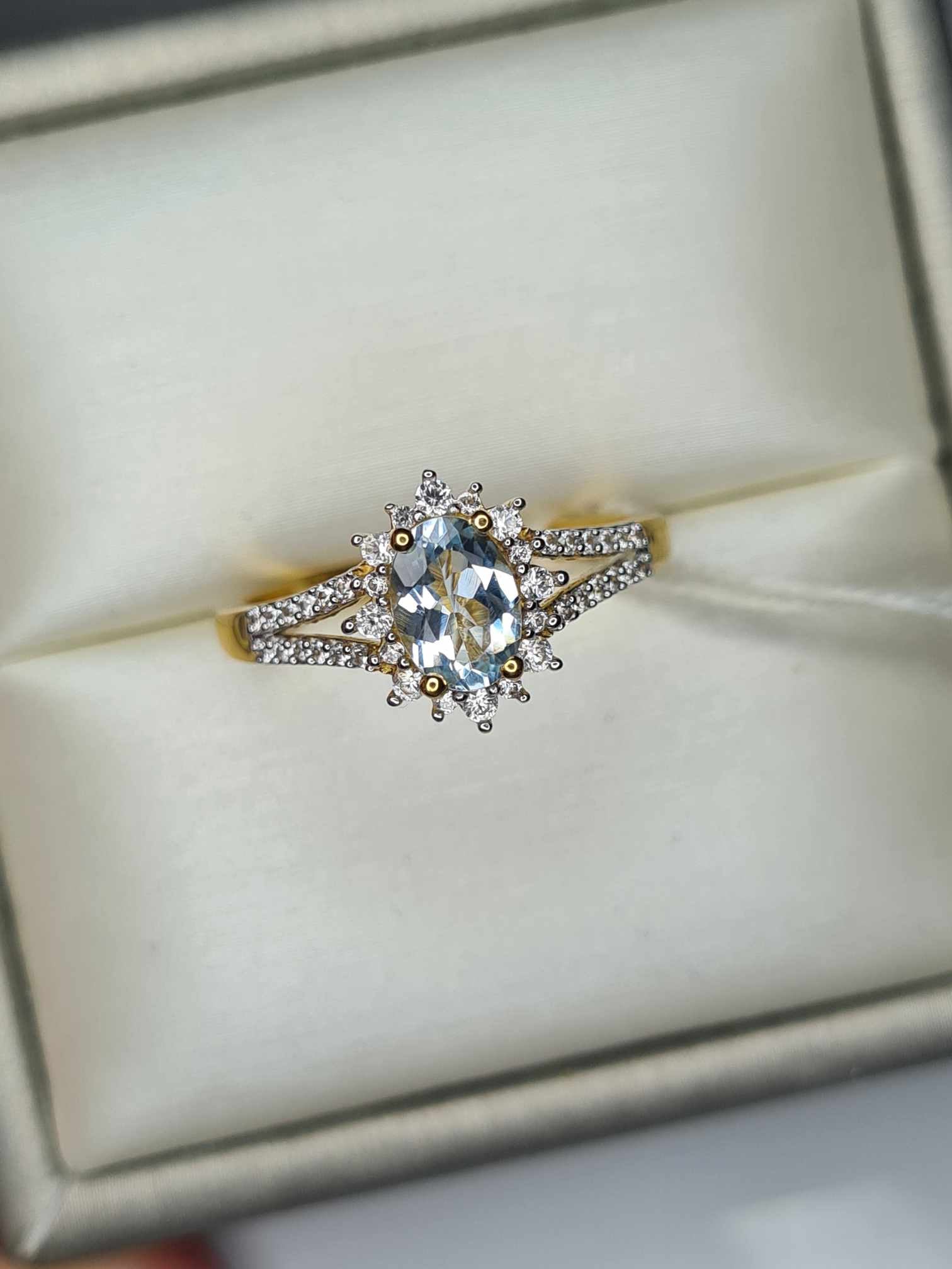 Halo Brilliance: The Halo Design of this ring transforms it into a celestial marvel. The Aquamarine oval, set as the center stone, is surrounded by a halo of round-cut Natural Zircon, creating a dazzling play of light. The split shoulder design, adorned with additional Zircons, adds a touch of sophistication to the overall allure.