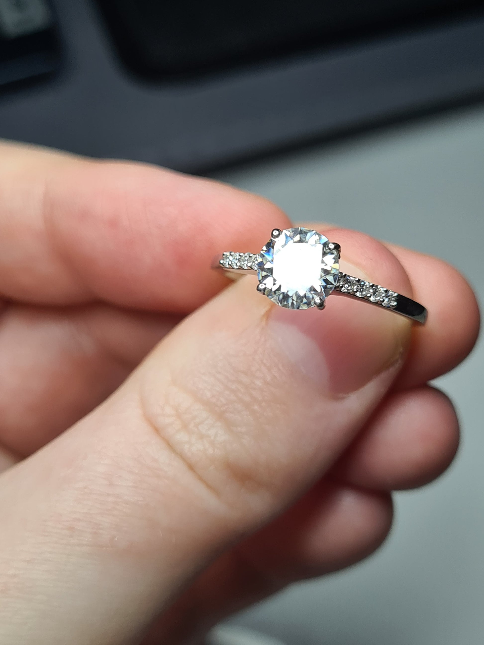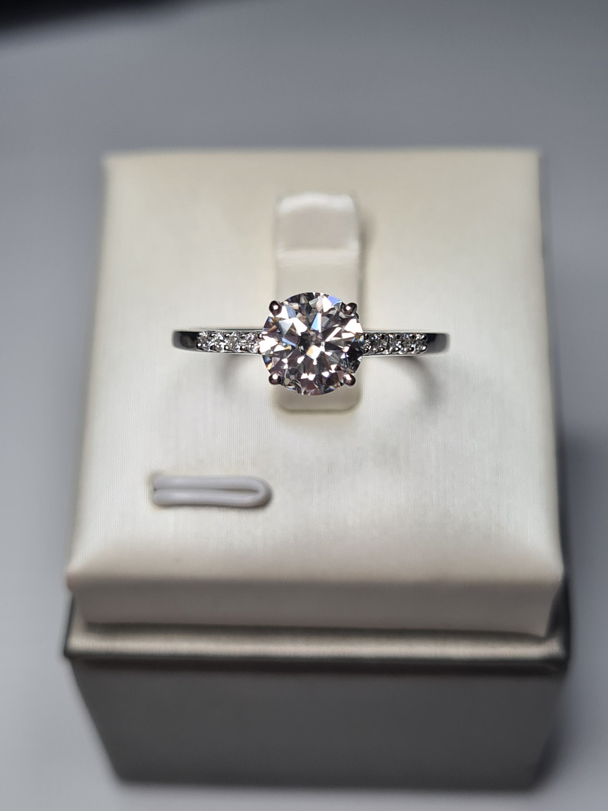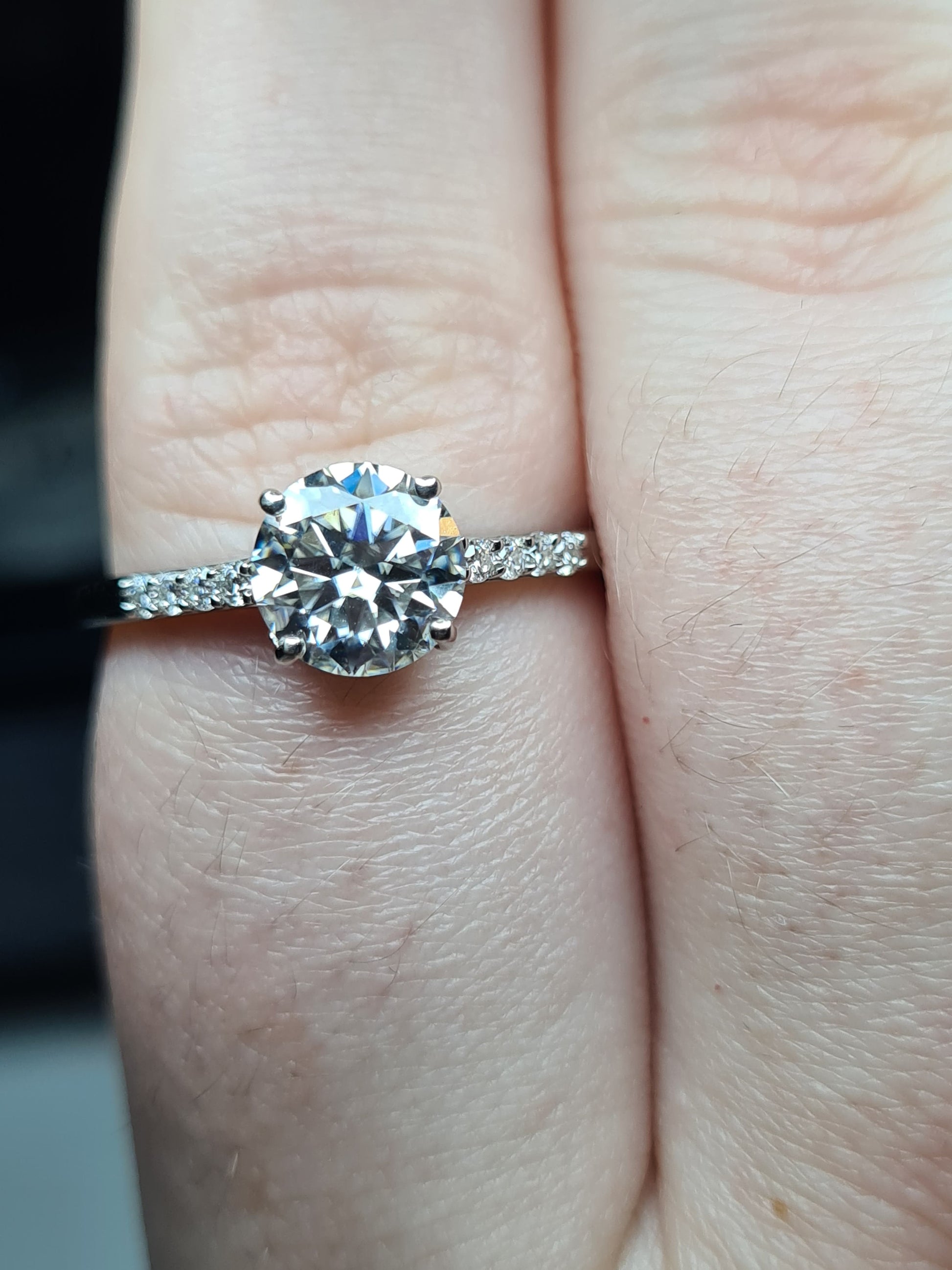 - Center Stone: Moissanite Round 7mm Faceted Cut (1.201ct).