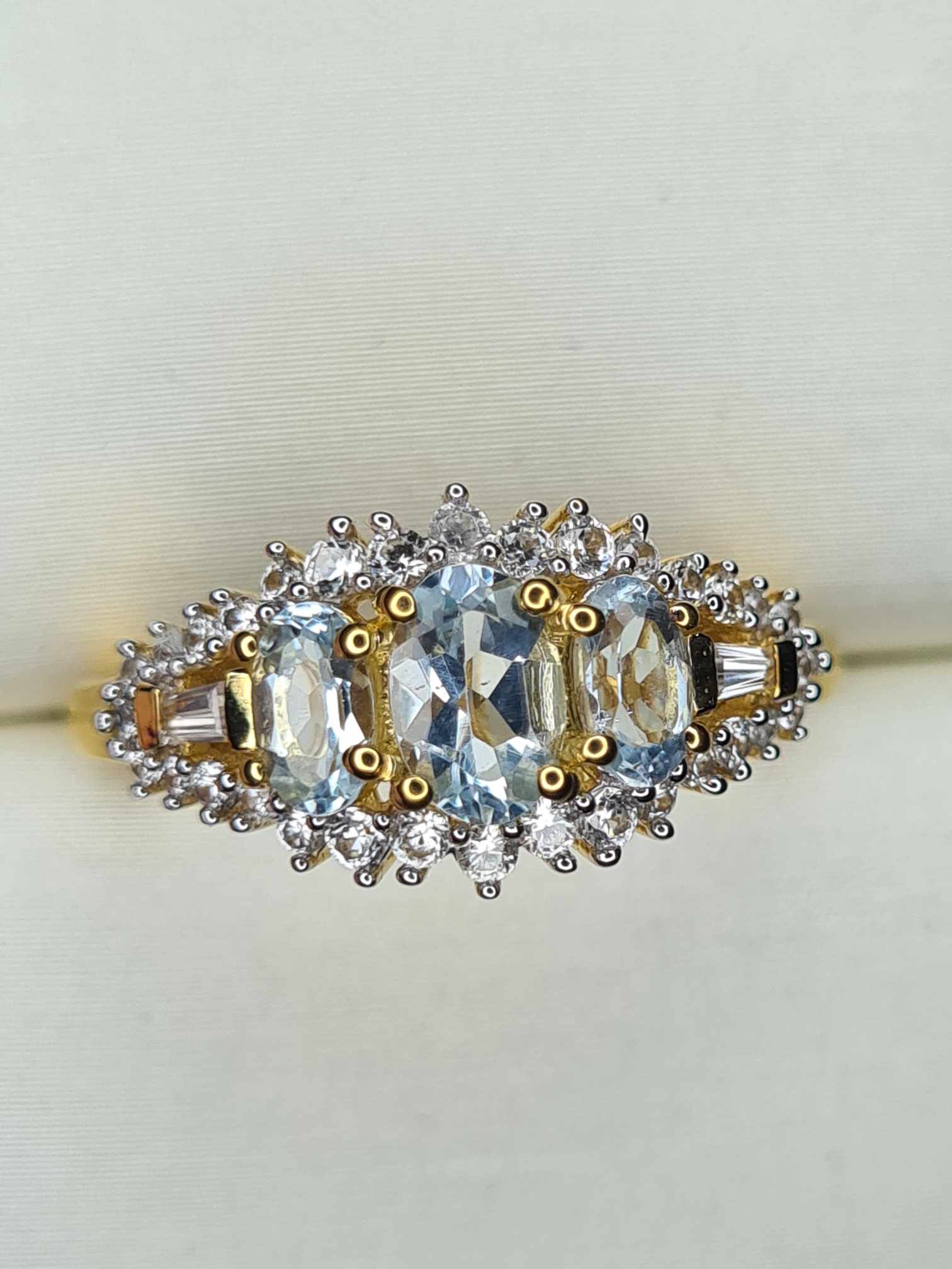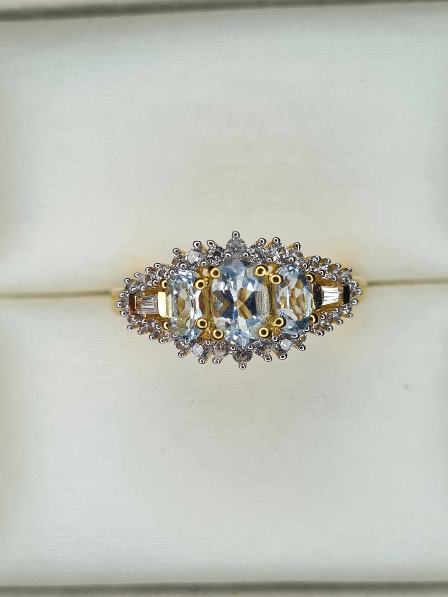This exquisite ring features a clustered trilogy design, showcasing a central Aquamarine oval cut alongside two additional oval-cut stones. The shoulders are adorned with Baguette cut natural zircons, adding a touch of sophistication, while a halo of small round-cut natural Zircons completes the captivating ensemble.