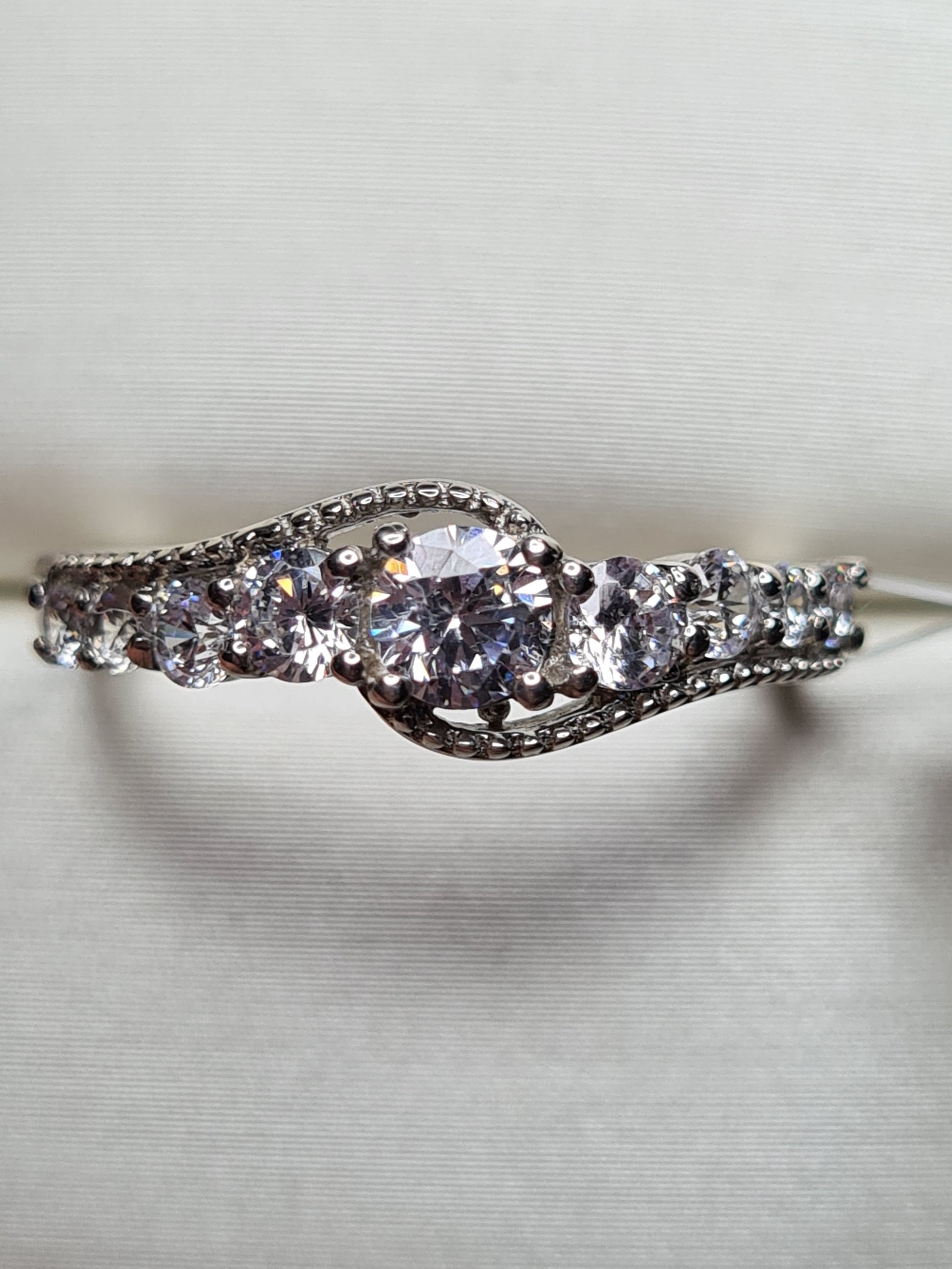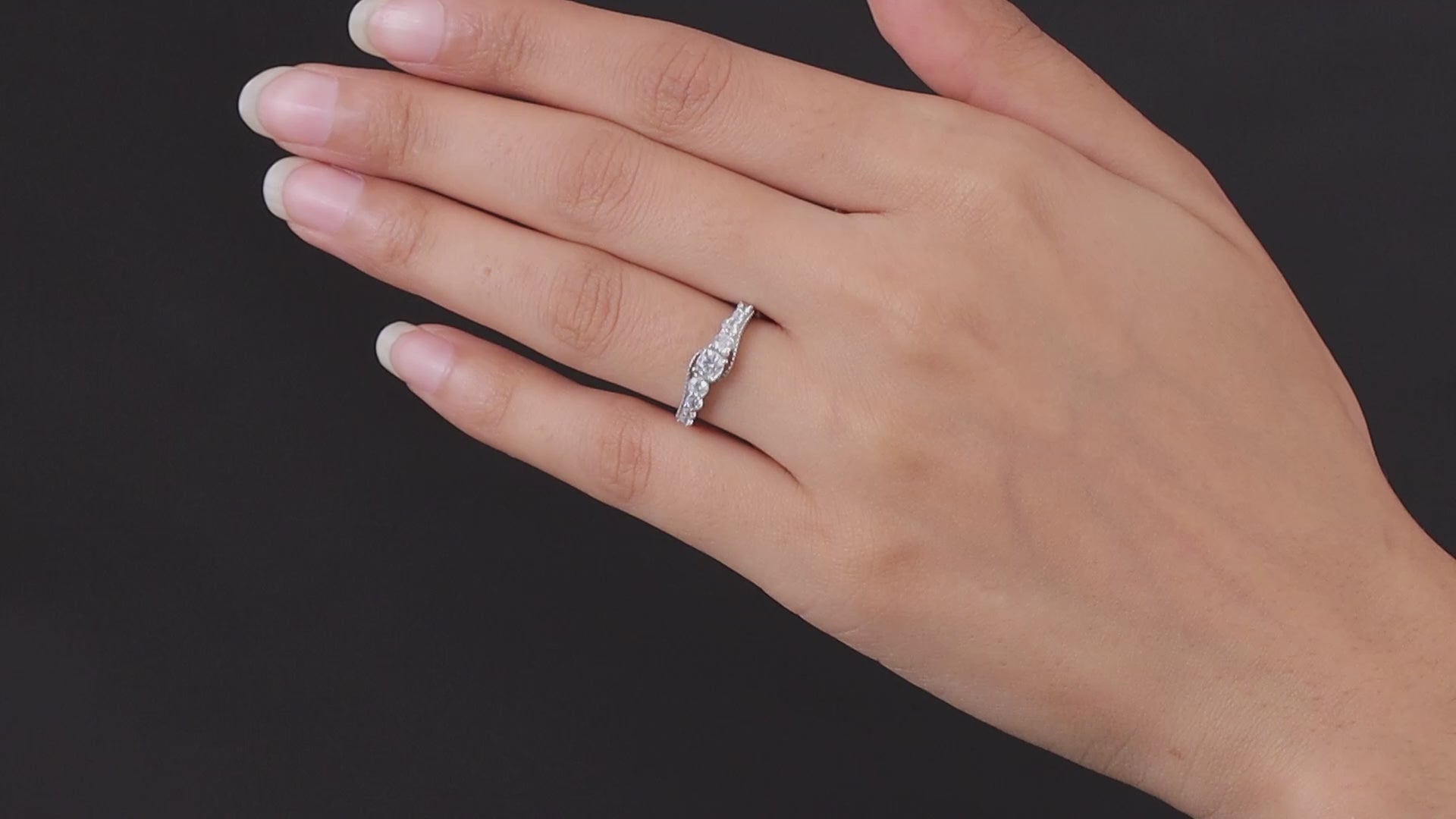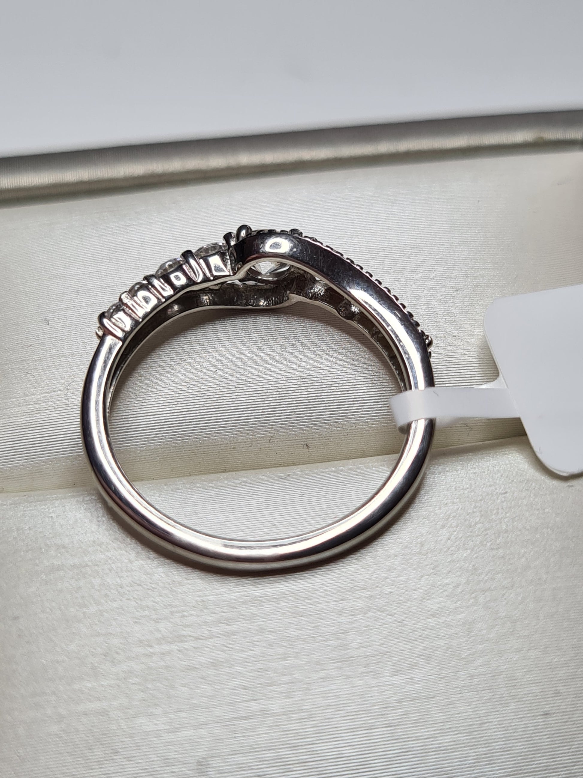 - Centre Stone: The central focus is a round 4mm faceted cut simulated diamond with a carat weight of 0.440ct. Smaller round cut stones adorn the shoulders, enhancing the captivating bypass design.
