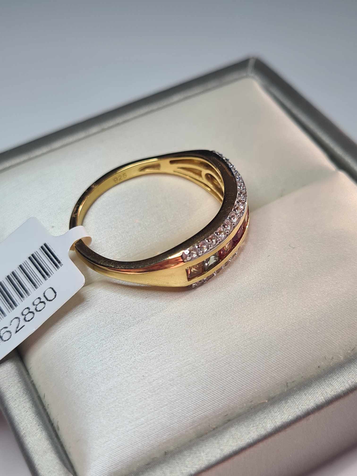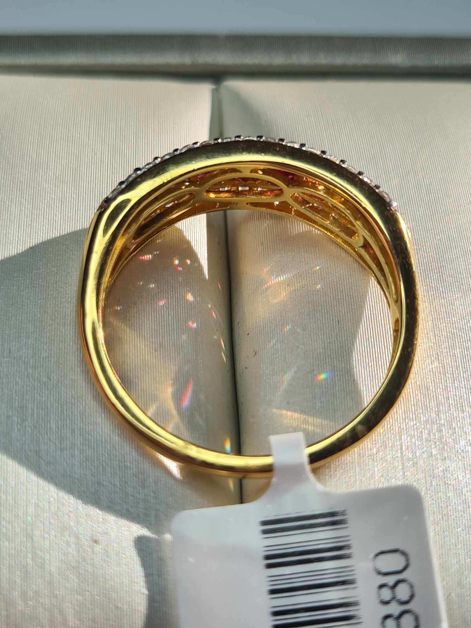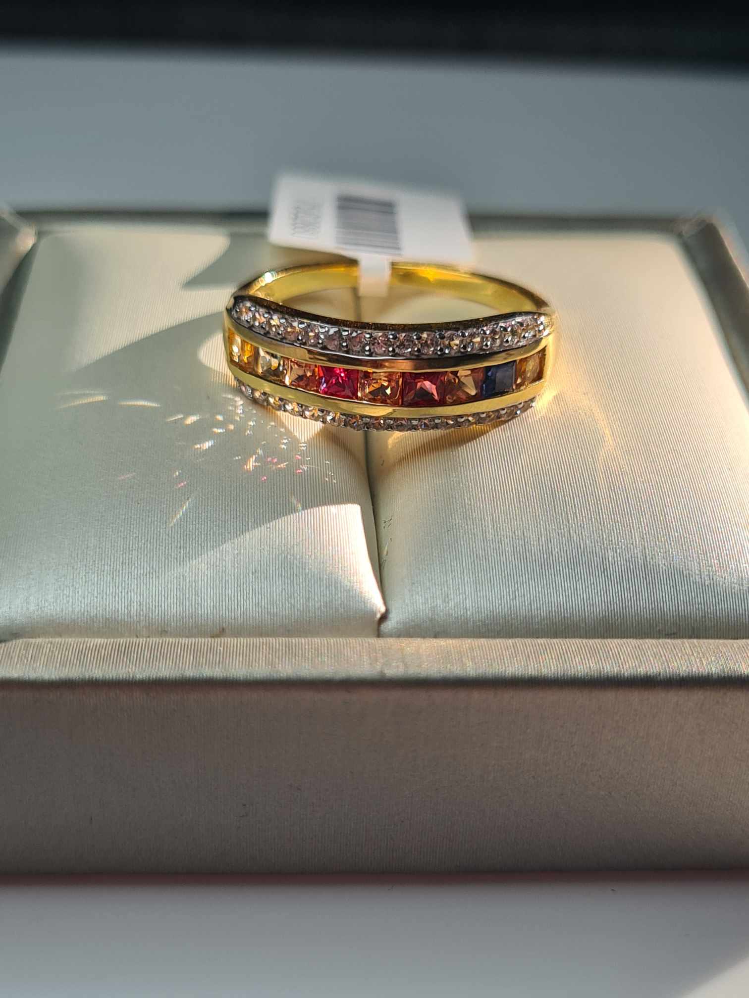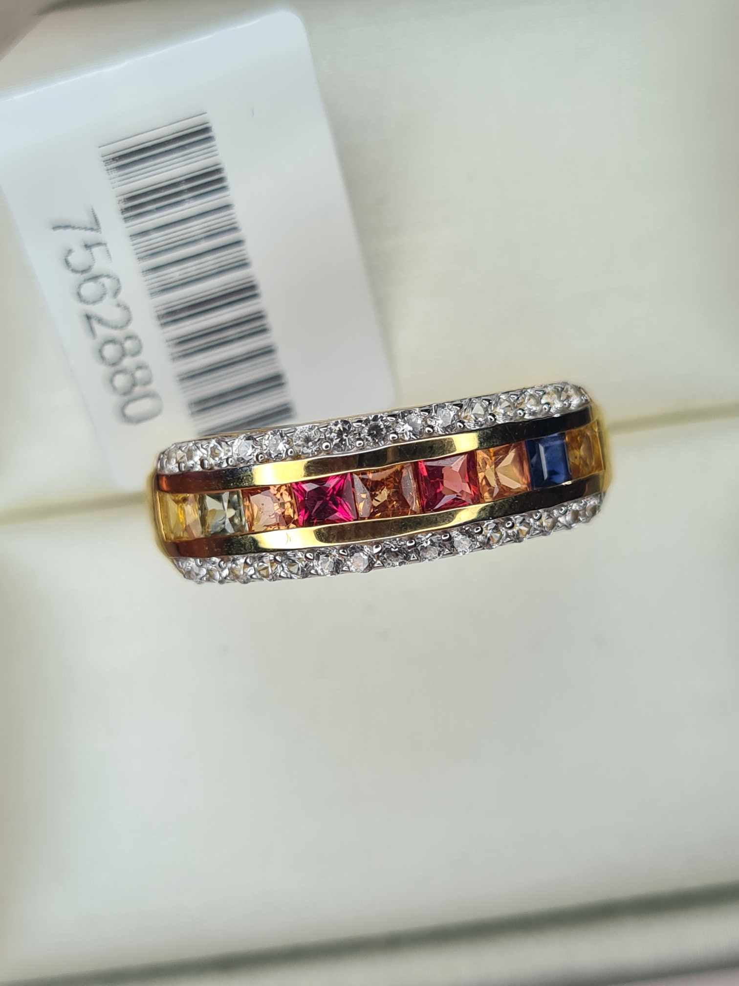 The centerpiece of this ring features 9 multi-sapphire squares, each 2.5mm in size and pressure-set, totaling 1.017ct. The band is adorned with 30 white zircons, 1.3mm in diameter and faceted cut, adding a touch of sparkle to each side.