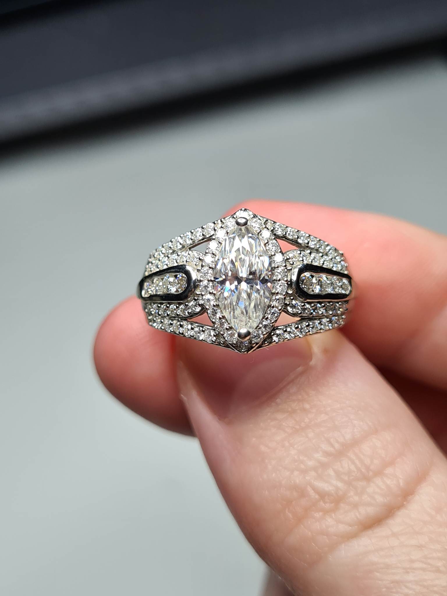 Indulge in the detailed craftsmanship and timeless beauty of the 1.56Ct Marquise Moissanite Cluster Ring – a perfect blend of style and sophistication for any discerning individual.