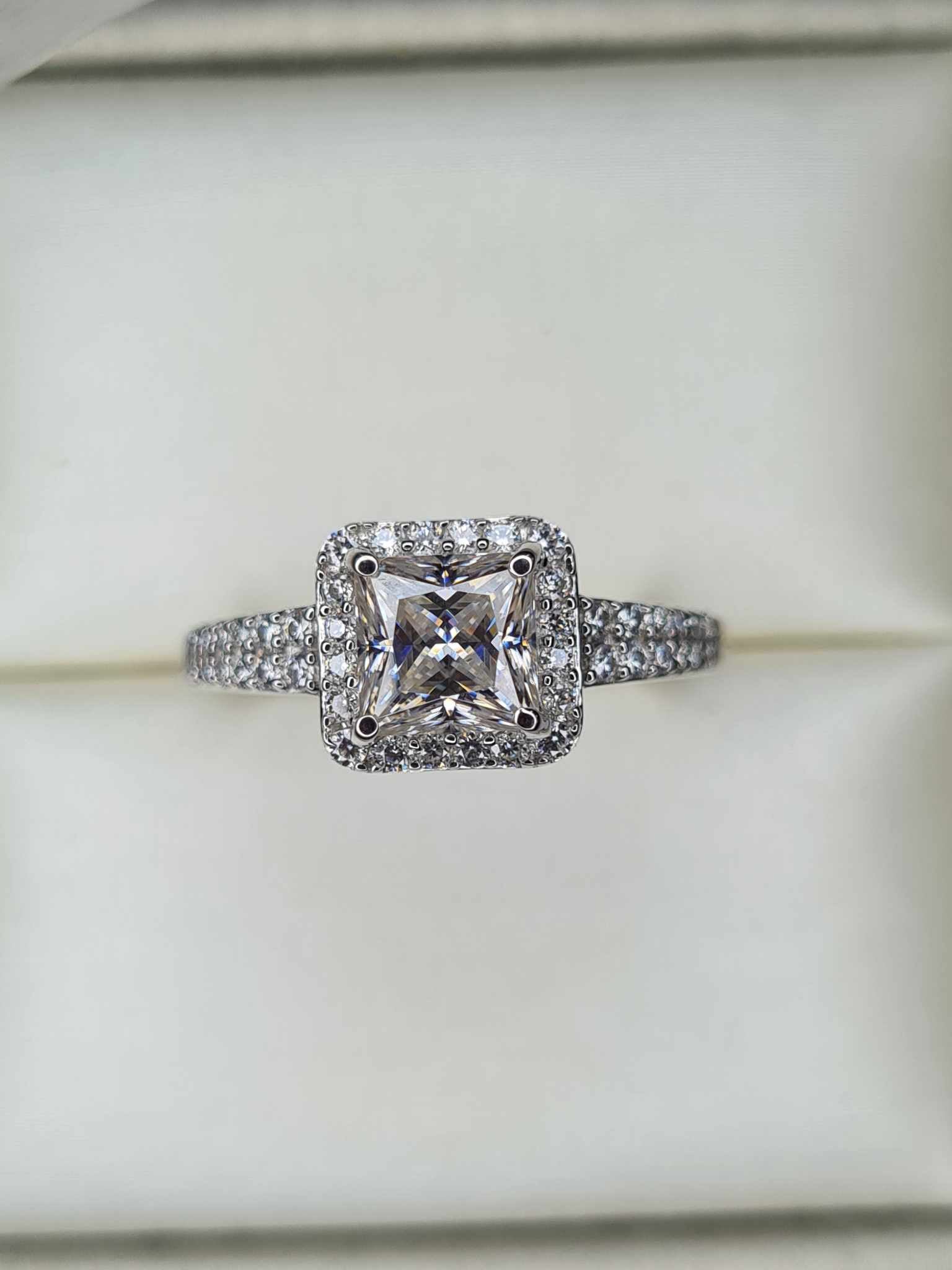 Introducing our 1.58ct Moissanite Square Cut Halo Ring in Platinum Overlay 925 Sterling Silver—a truly stunning piece that effortlessly combines elegance and sophistication. Meticulously crafted, this ring is not just an accessory; it's a statement of timeless beauty and versatility.