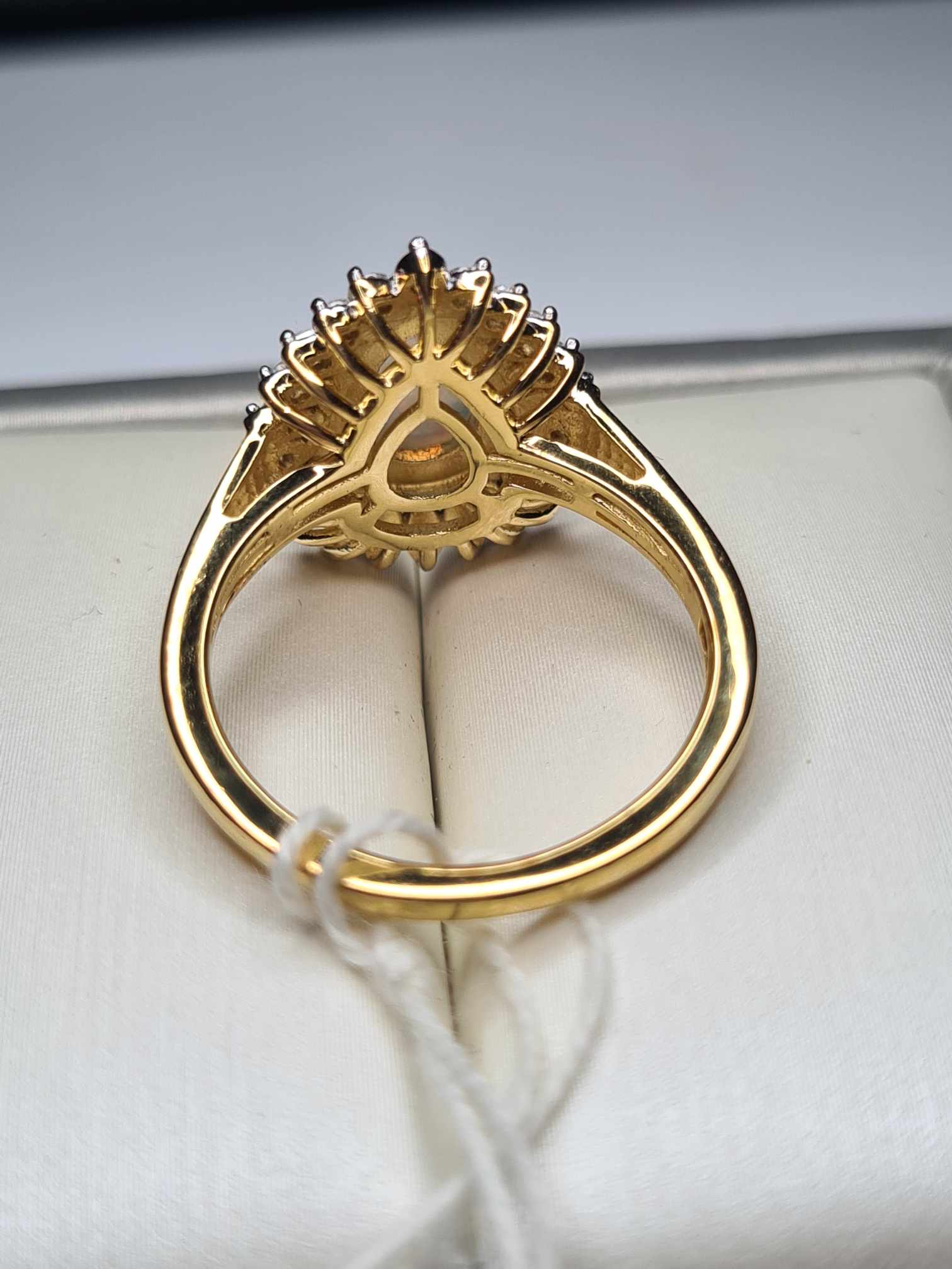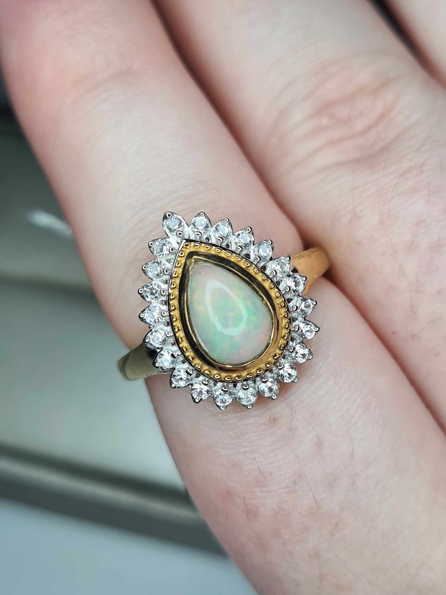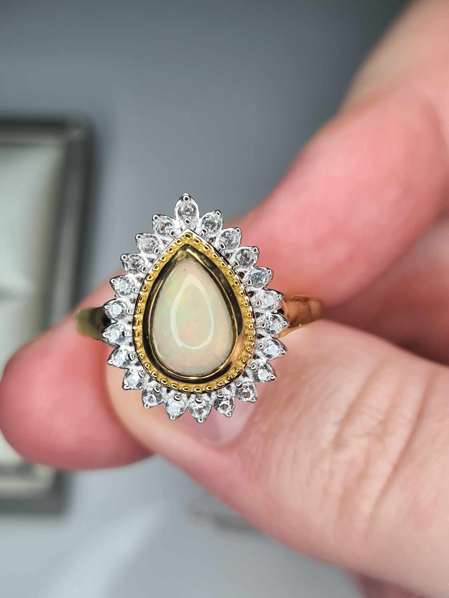 Our Ethiopian Welo Opal and Natural Zircon Ring, with its beautiful halo design and pear-cut Welo Opal, is the perfect statement ring, inviting you to embrace the elegance of natural gemstones and timeless design.