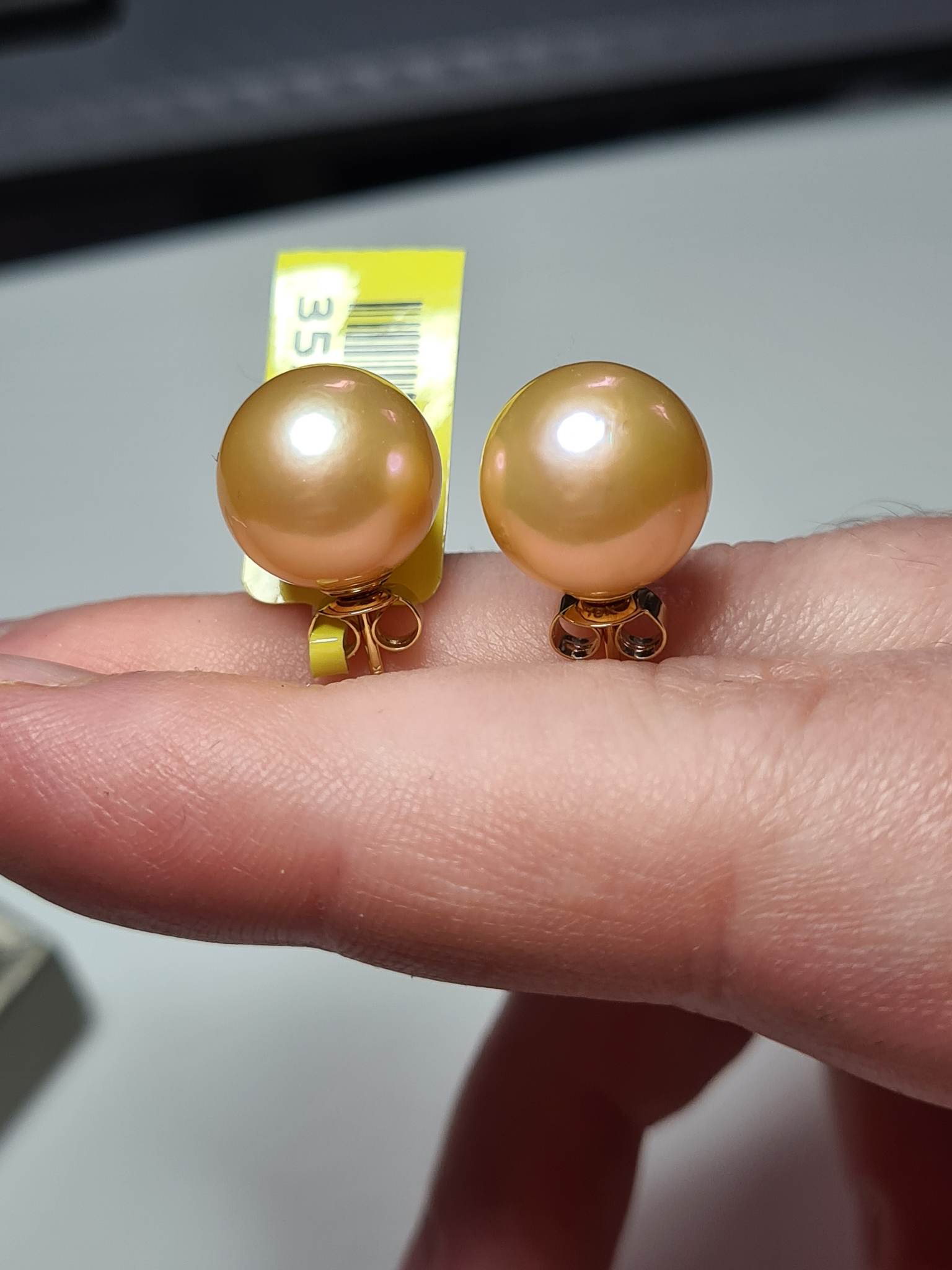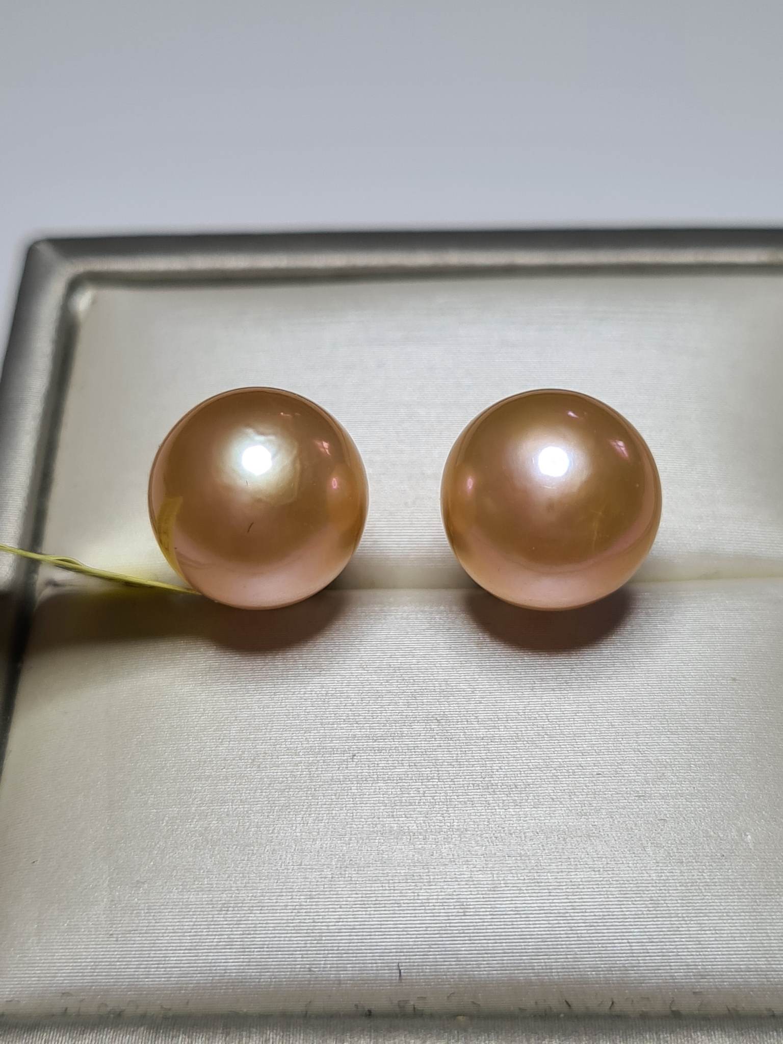 These earrings feature two AAA Peach Edison Pearls, known for their lustrous and unique coloring. The round cut and substantial size (11-12mm) showcase the natural beauty and elegance of these pearls.