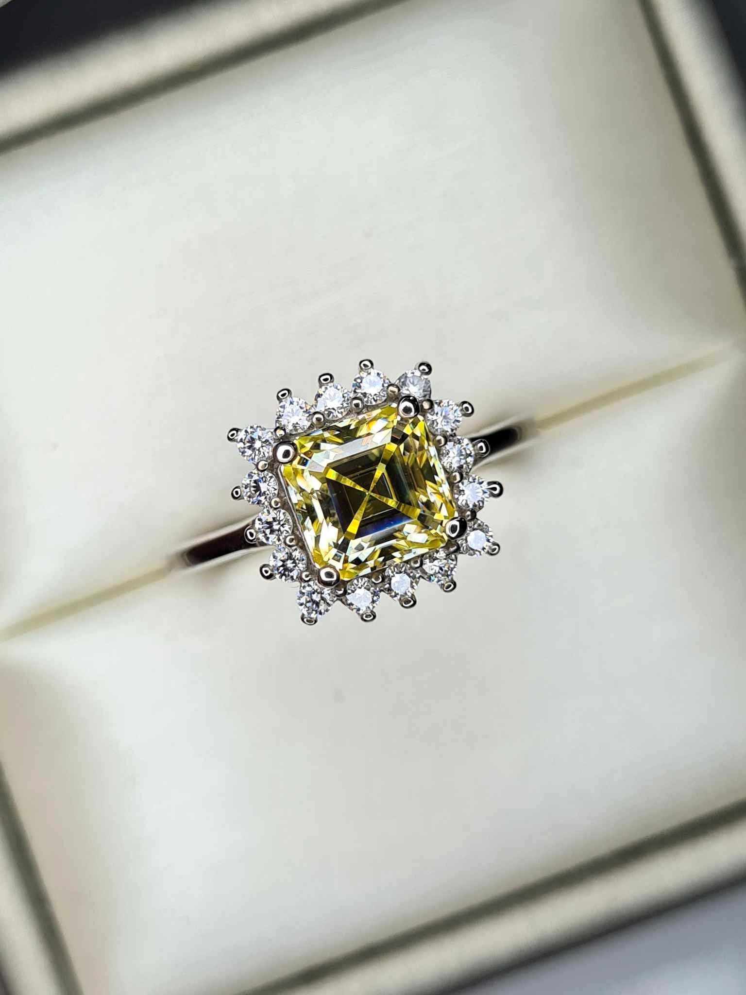 Icy Halo Delight: A breathtaking halo of icy white moissanites encircles the central gem, enhancing the overall sparkle and creating a harmonious contrast with the vivid Canary Yellow centerpiece.