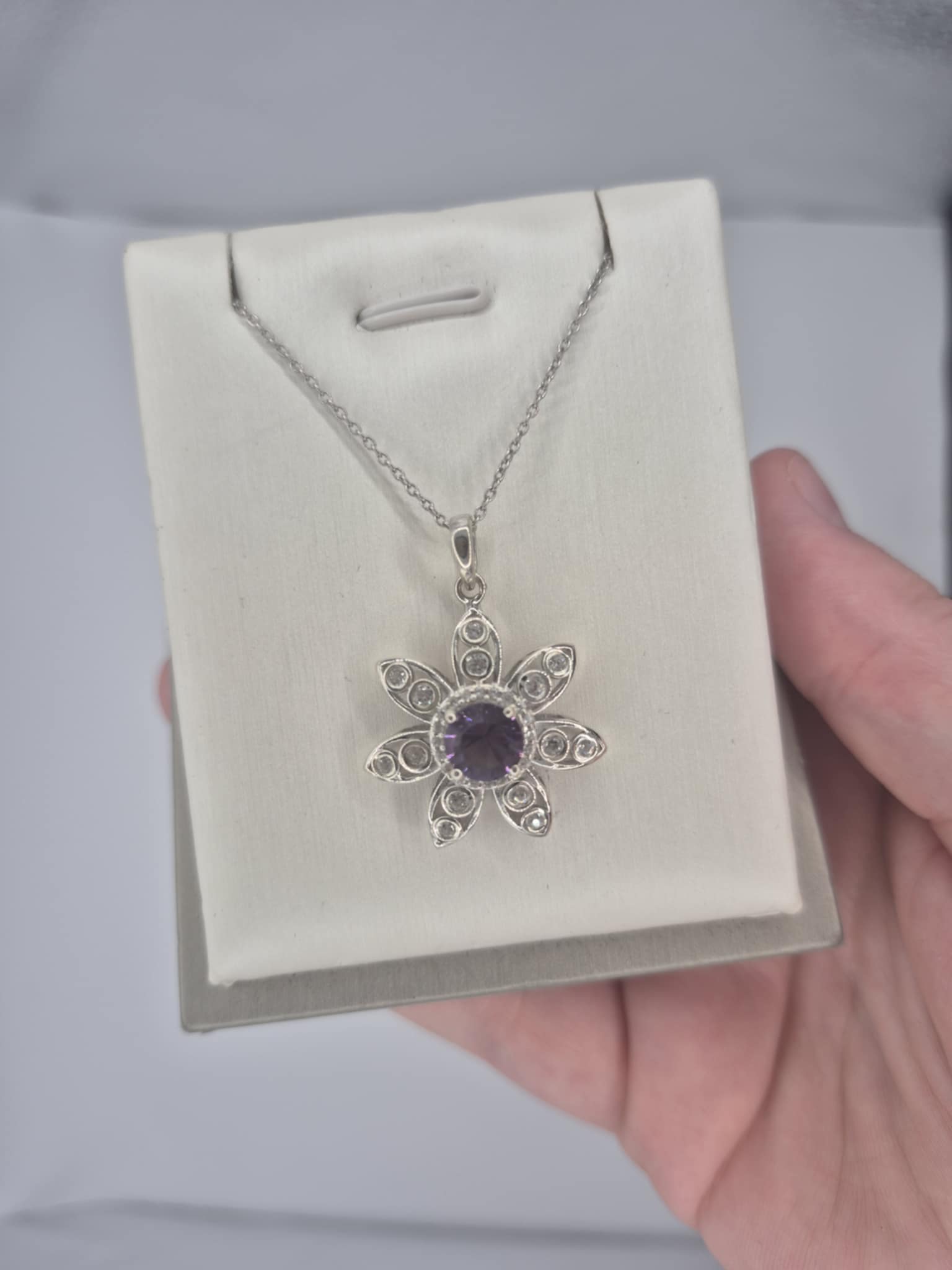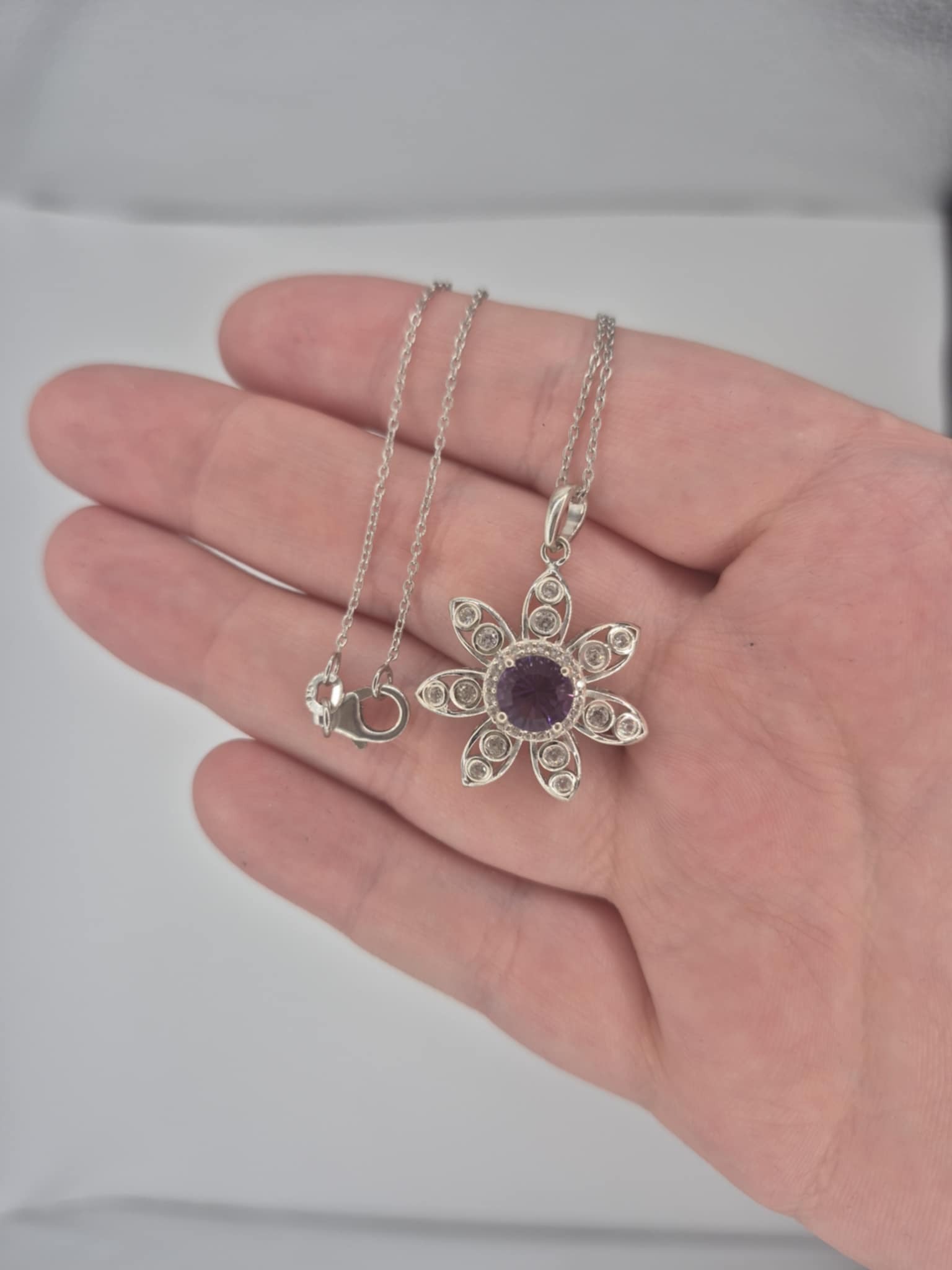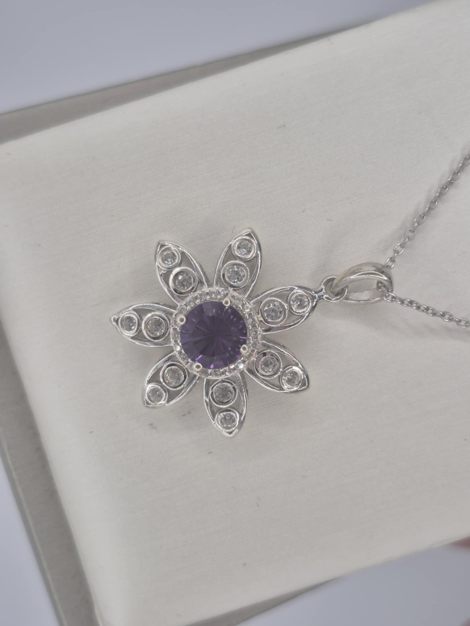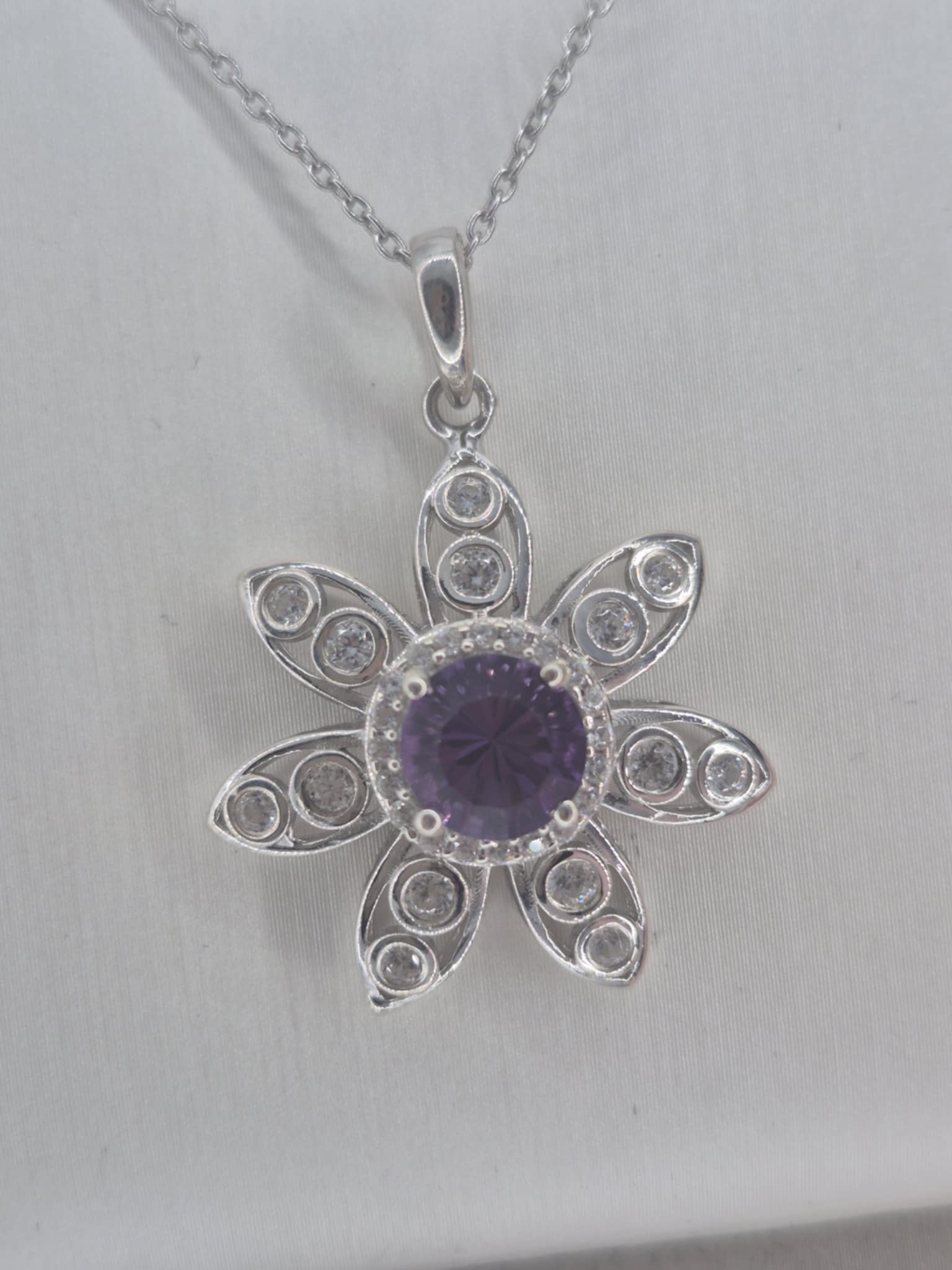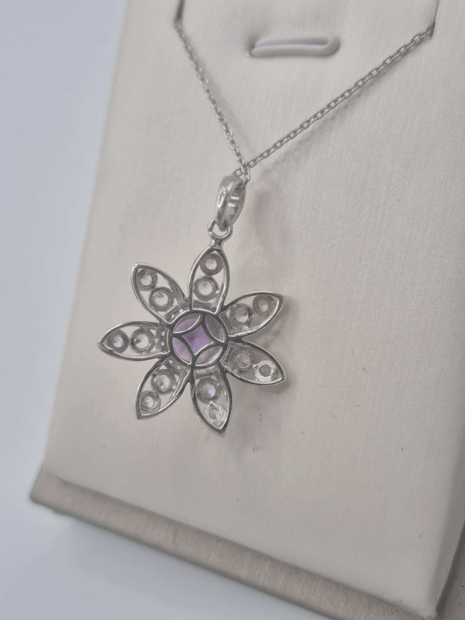 2.220ct. Flower Amethyst & White Zircon Necklace in Rhodium Overlay 925 Sterling Silver