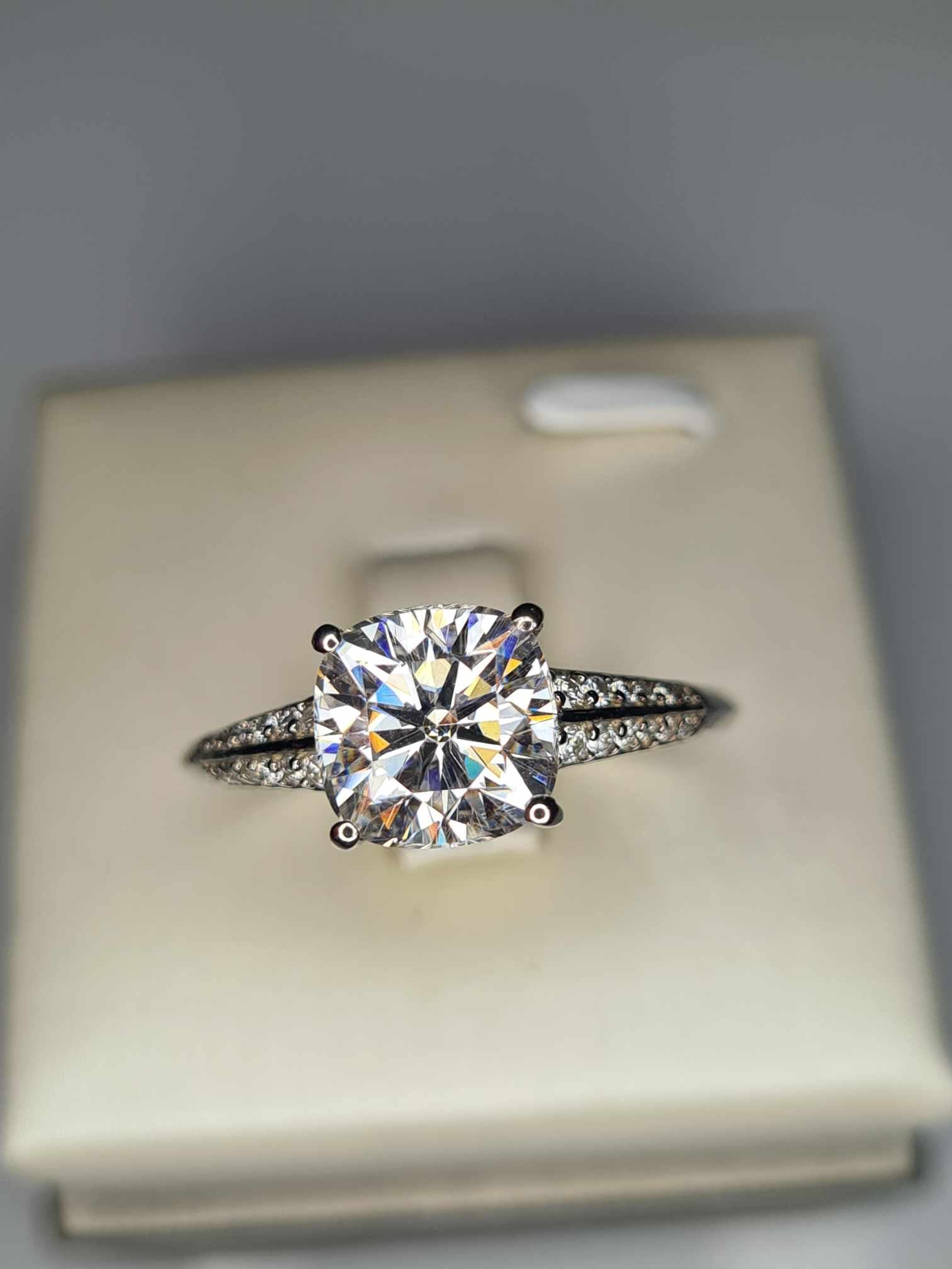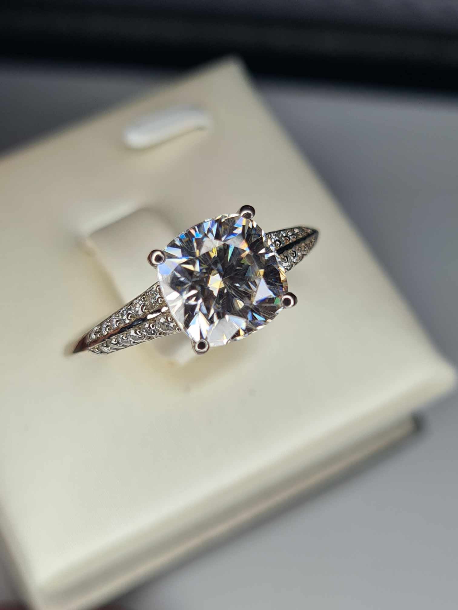 Timeless Elegance: The central focus of this ring is the stunning 2.115-carat moissanite cushion, its facets capturing and reflecting light with unparalleled brilliance. A true testament to timeless elegance, this piece is designed to enchant for generations to come.