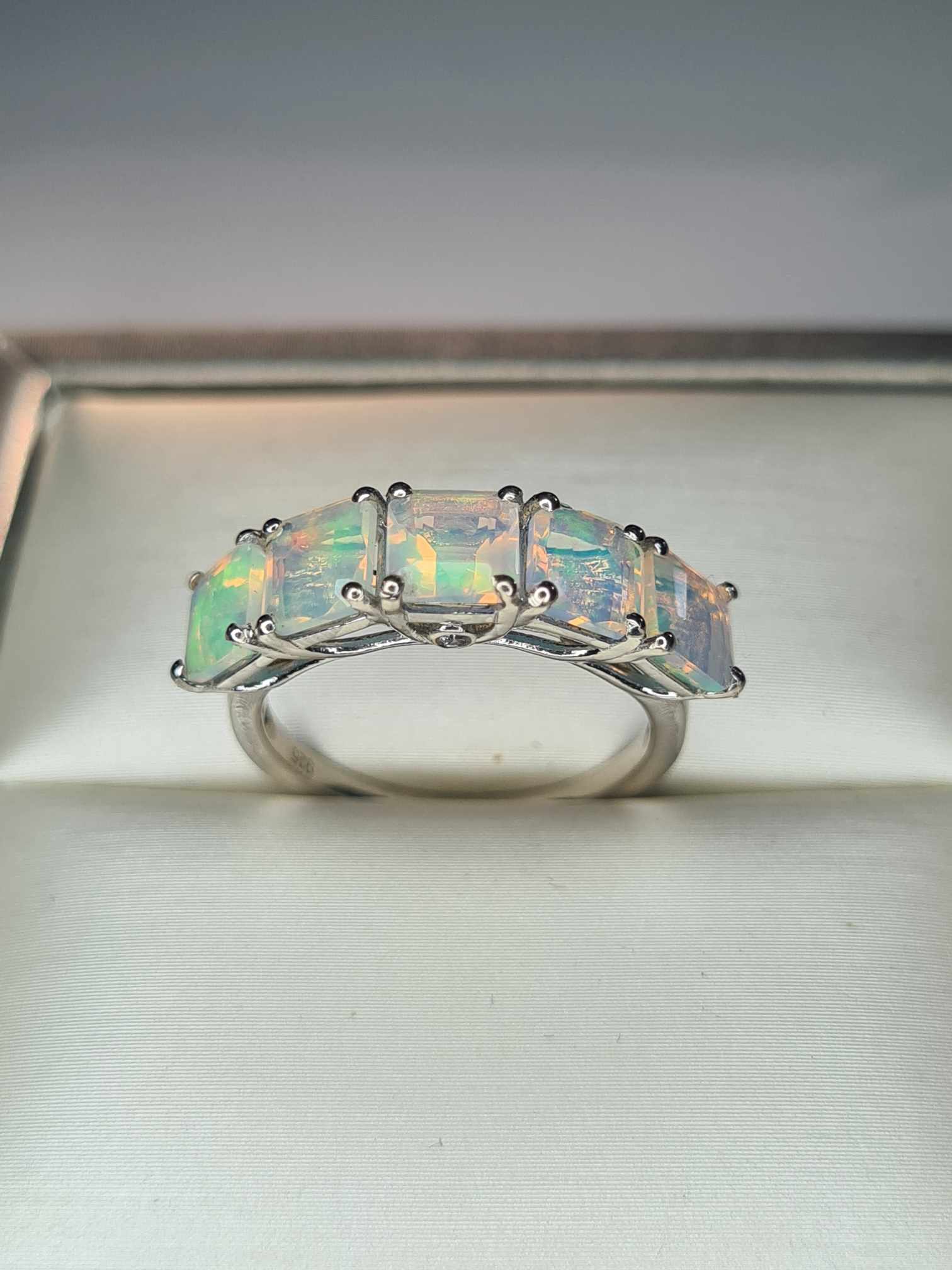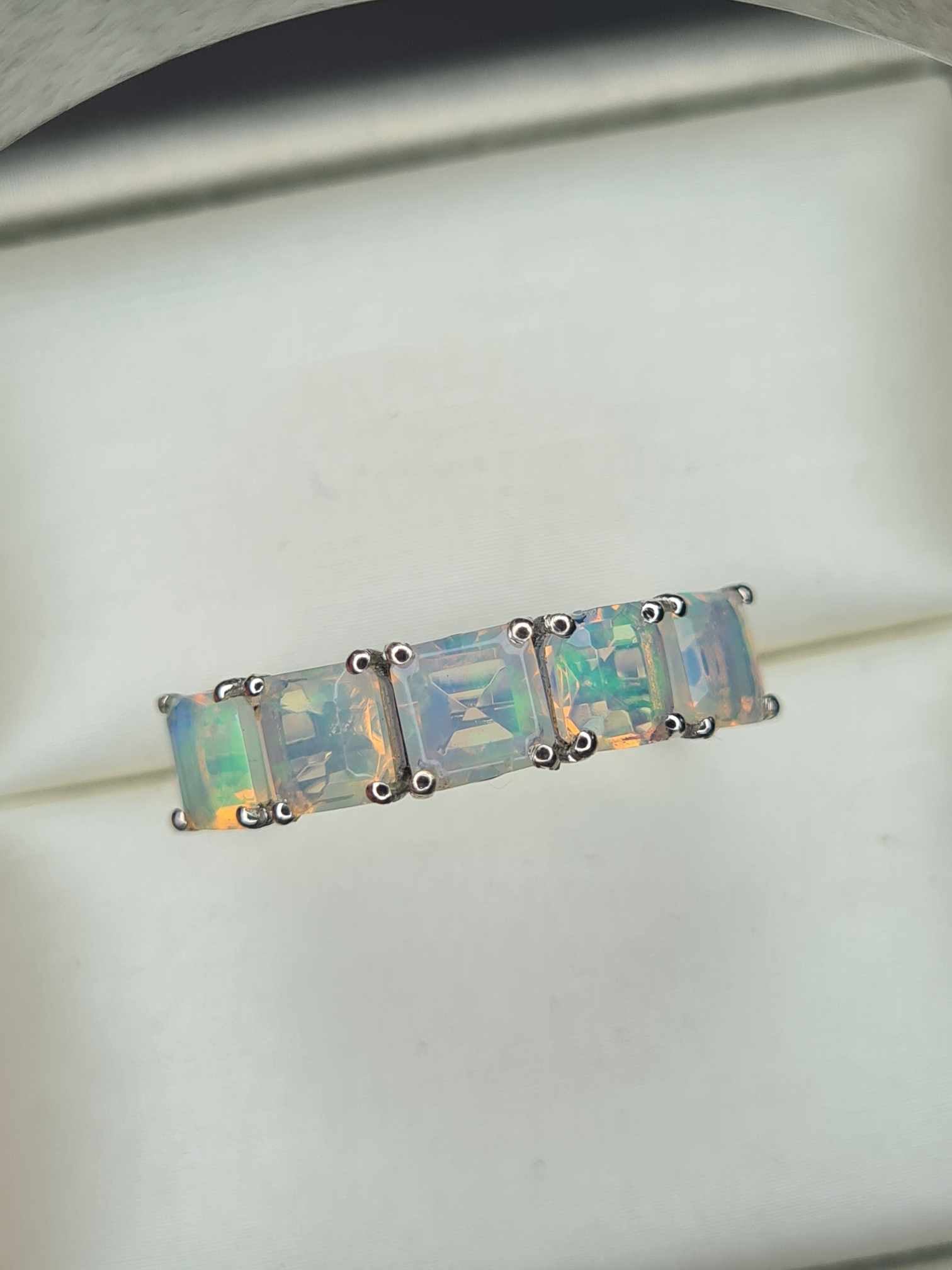 The centerpiece of this ring is a stunning half eternity of 5 Asscher-cut Ethiopian Welo Opals, each measuring 5x5mm and totaling 1.940ct. Adding a touch of sparkle, 2 natural white diamonds are delicately placed on the bridge, enhancing the overall elegance of the design.