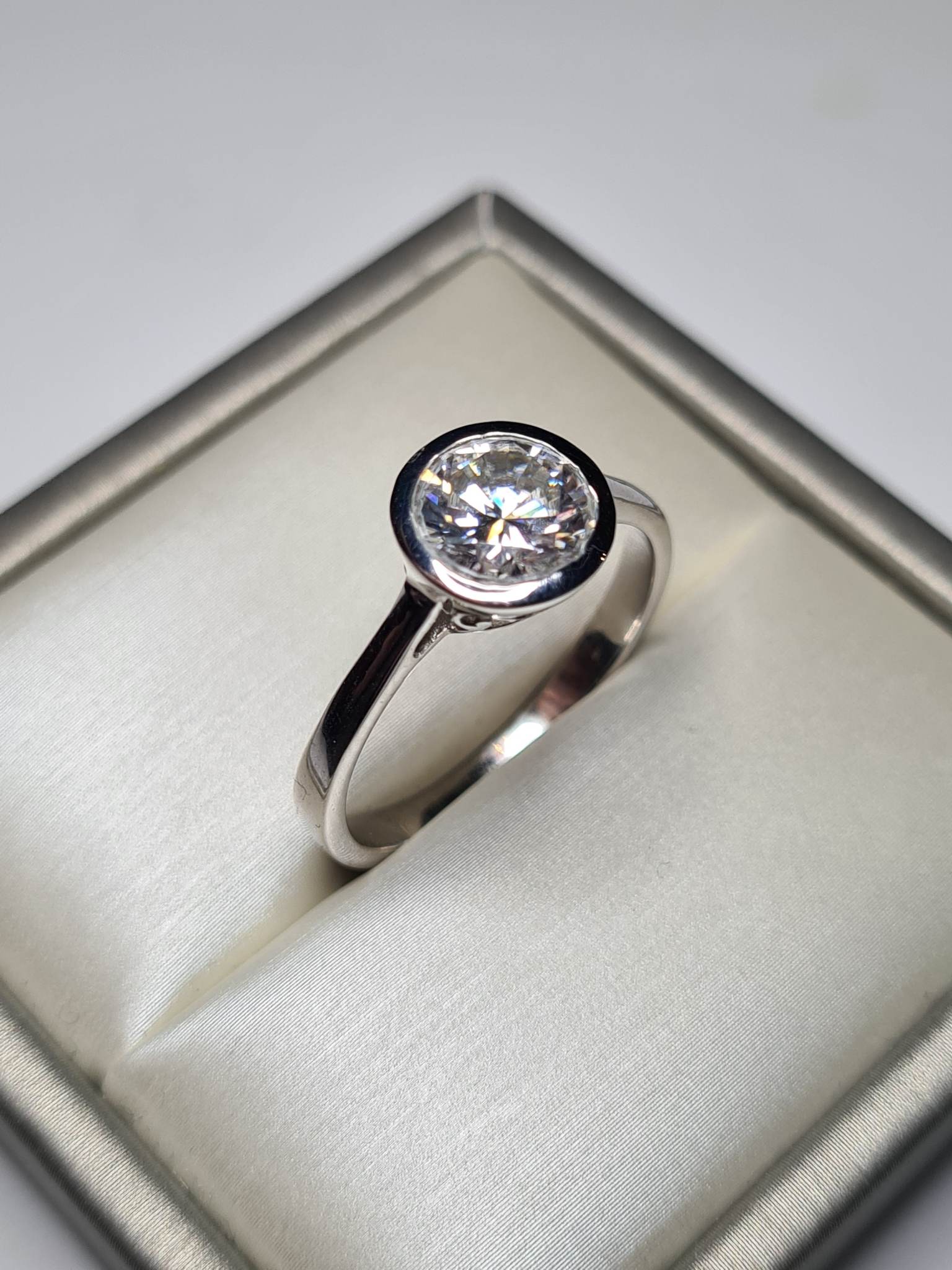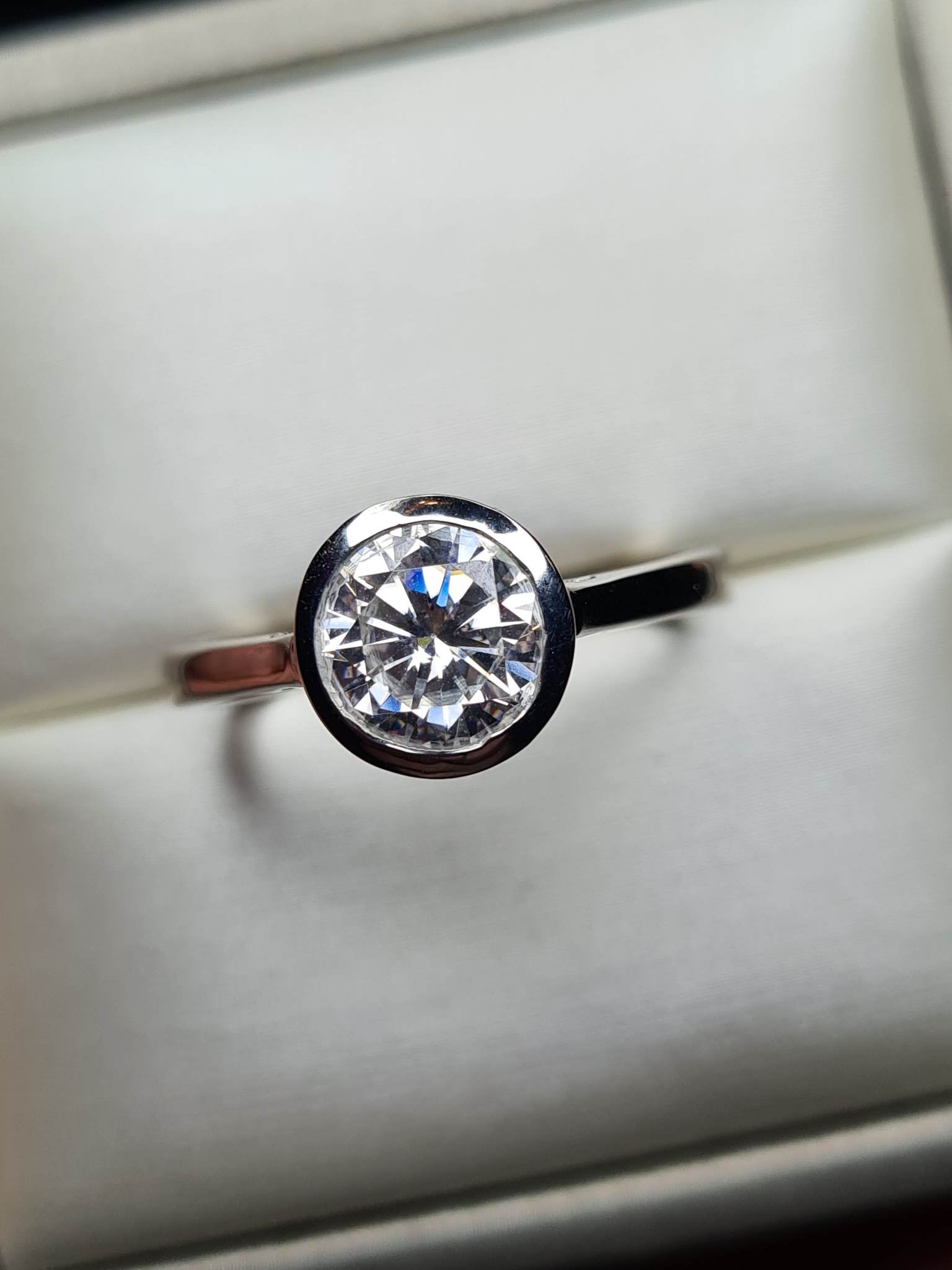 Immerse yourself in the radiance of our Bezel Set Solitaire Moissanite Ring—a symbol of incredible elegance, comfort, and enduring beauty that graces your hand with sophistication and brilliance.