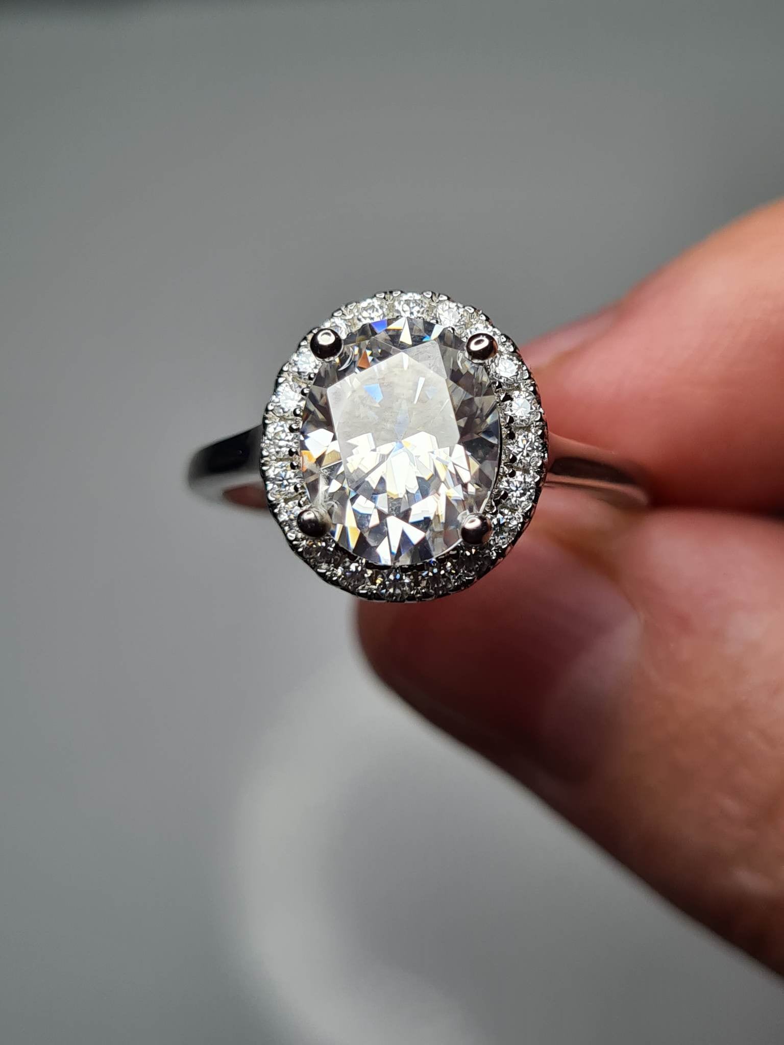 Coveted Beauty: The large oval faceted cut moissanite takes center stage, creating a ring that exudes undeniable glamour. The halo, formed by smaller moissanite rounds, adds an extra layer of brilliance, ensuring this piece captures attention from every angle.