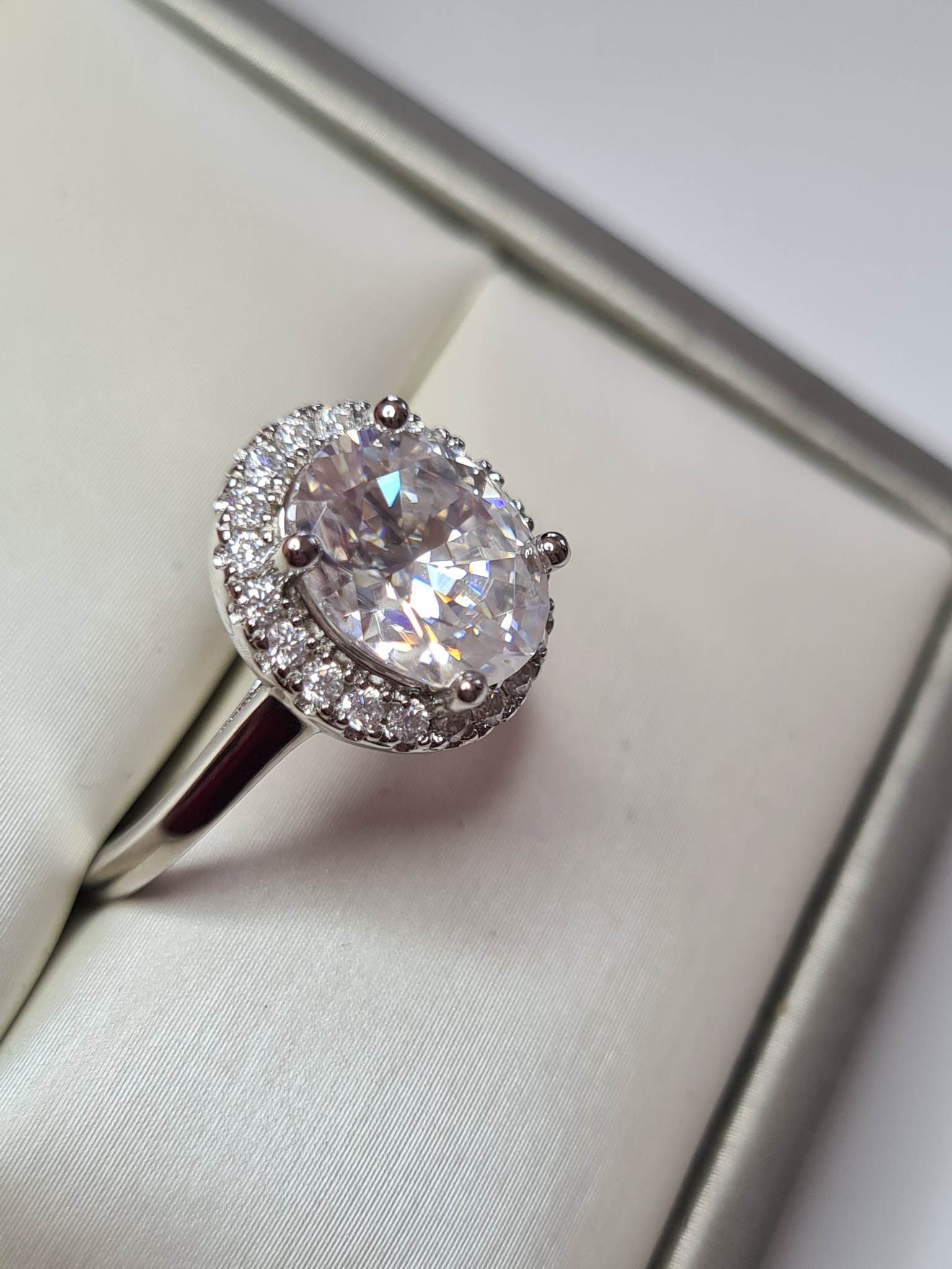 Indulge in timeless glamour with our Moissanite Halo Ring—a captivating piece meticulously crafted in hallmarked 925 solid sterling silver with a rhodium overlay. This exceptional ring, designed to captivate onlookers, features a center stone of white moissanite in an elegant oval cut, measuring 10x8mm and weighing 2.770 carats. The halo is formed by 20 white moissanite rounds, each 1.5mm in size with a combined weight of 0.280 carats, adding an extra layer of brilliance.