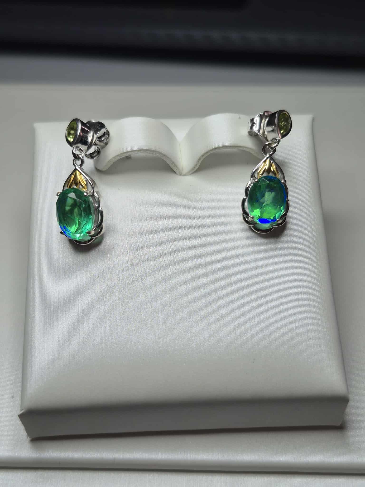 3.26ct Peacock Triplet Quartz & Peridot Dangling Earrings 925 Sterling Silver