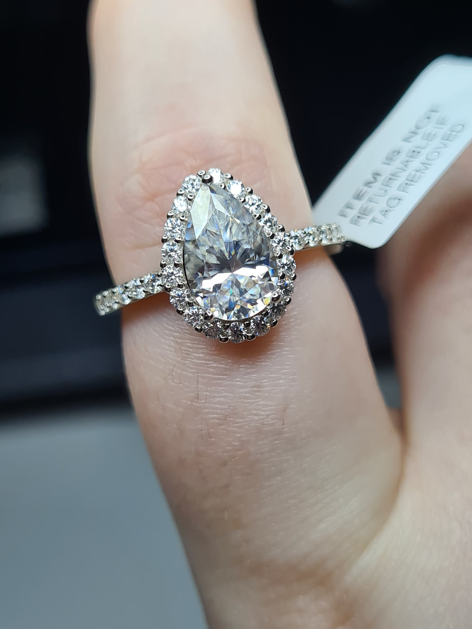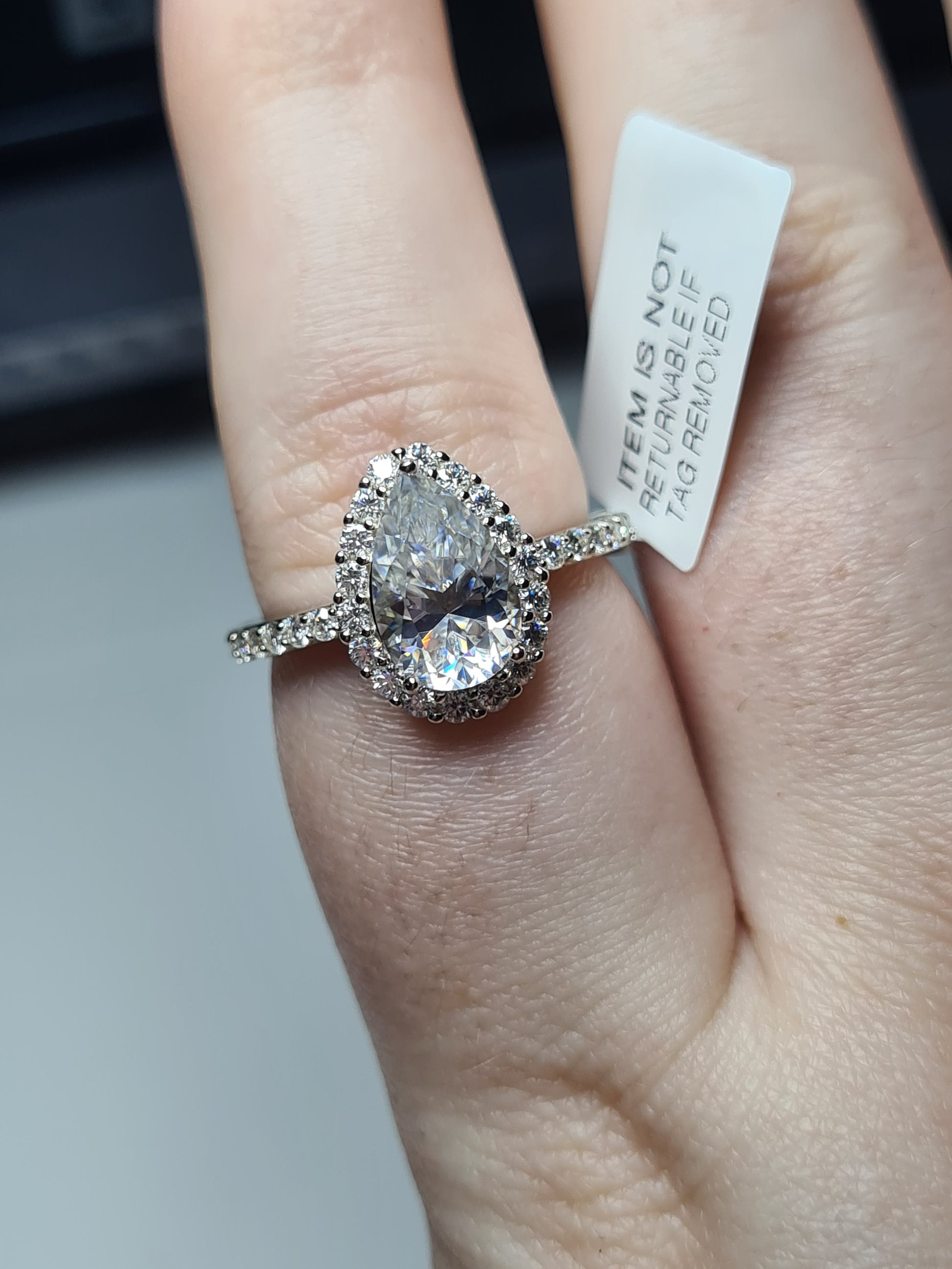 - Statement Piece: The teardrop-inspired pear cut halo design makes this ring a real statement piece, drawing attention with its captivating sparkle.