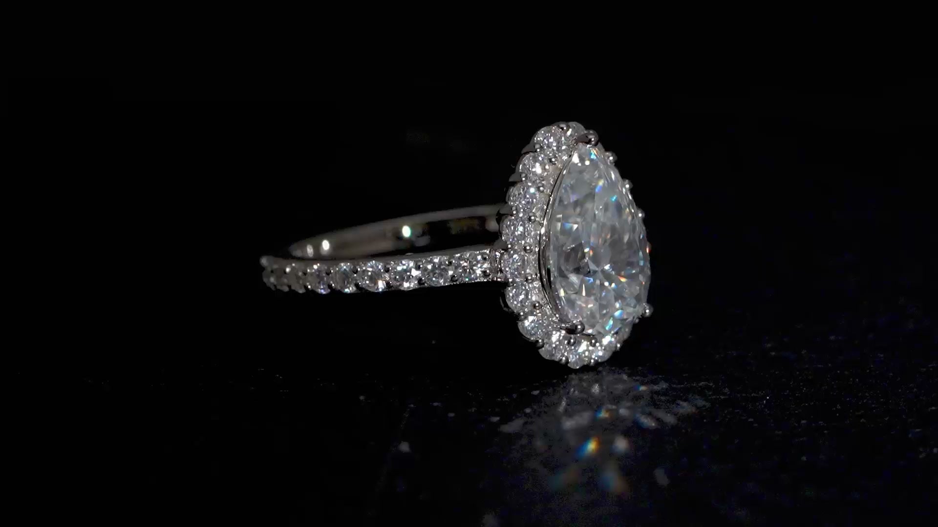 Adorn your finger with the brilliance and fire of the Pear Cut Halo Moissanite Ring – a true statement piece that effortlessly combines sophistication with captivating sparkle.