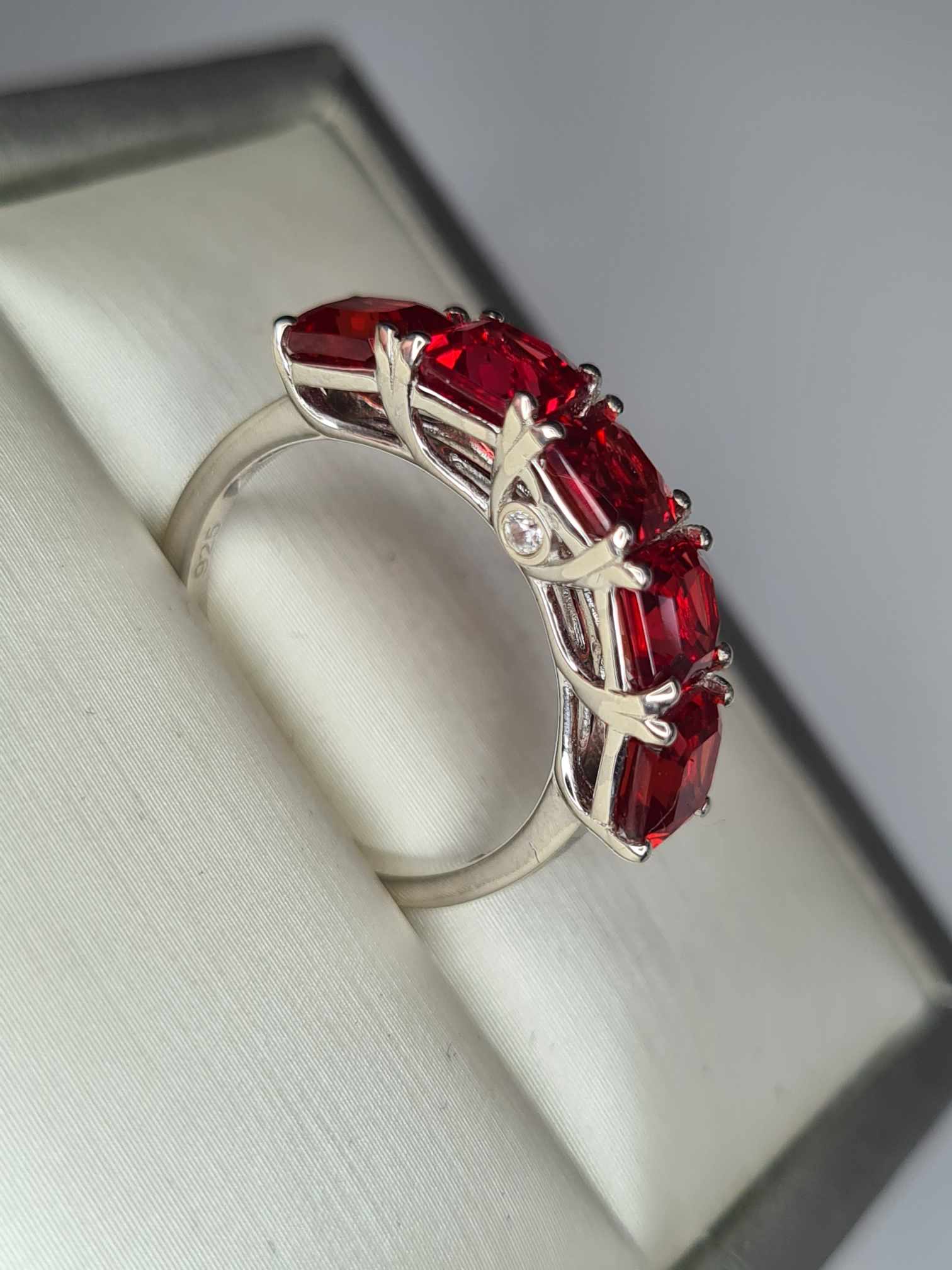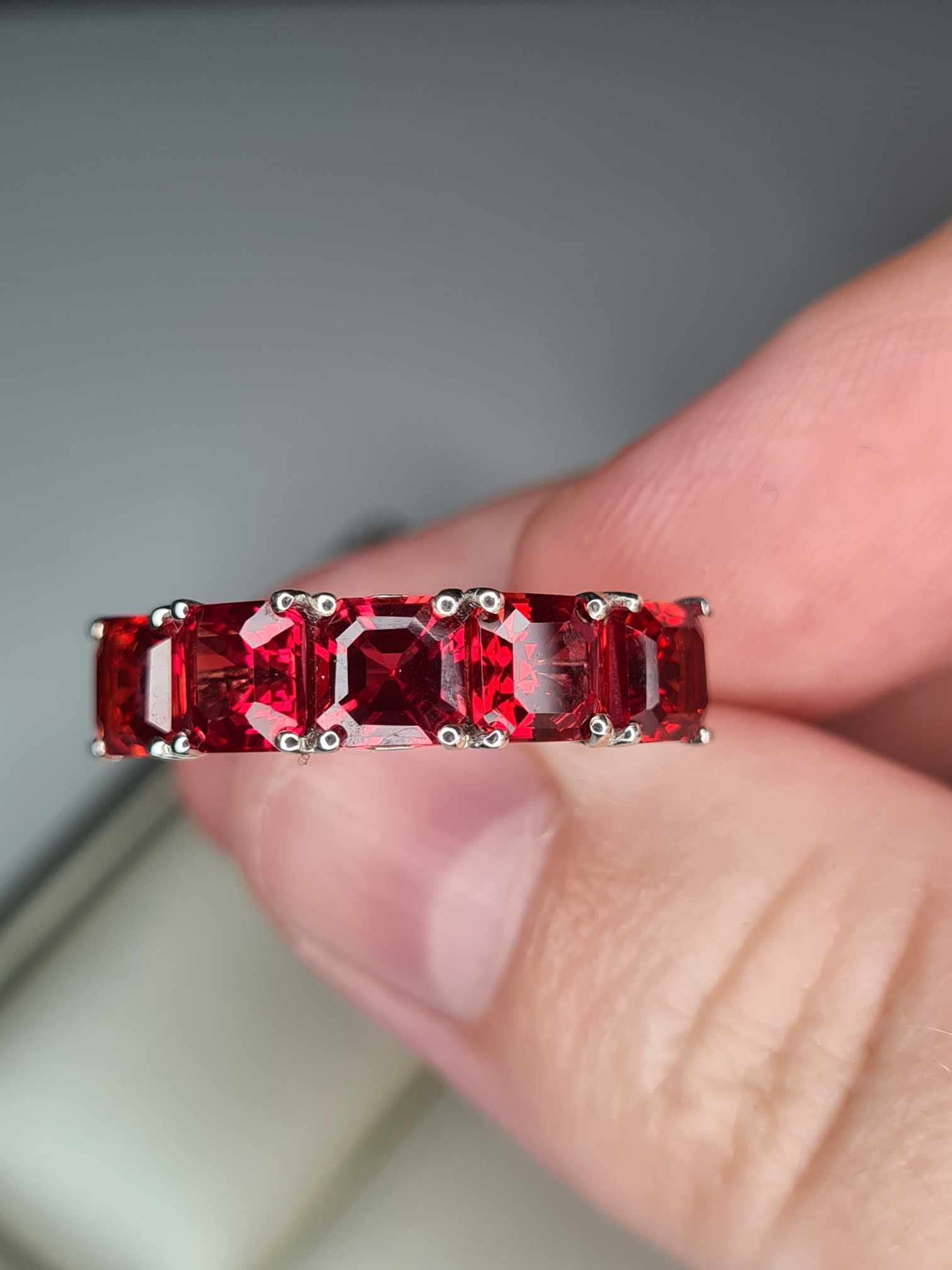 This stunning lab created Padparadscha ring is deep red in colour, featuring 2 natural zircons