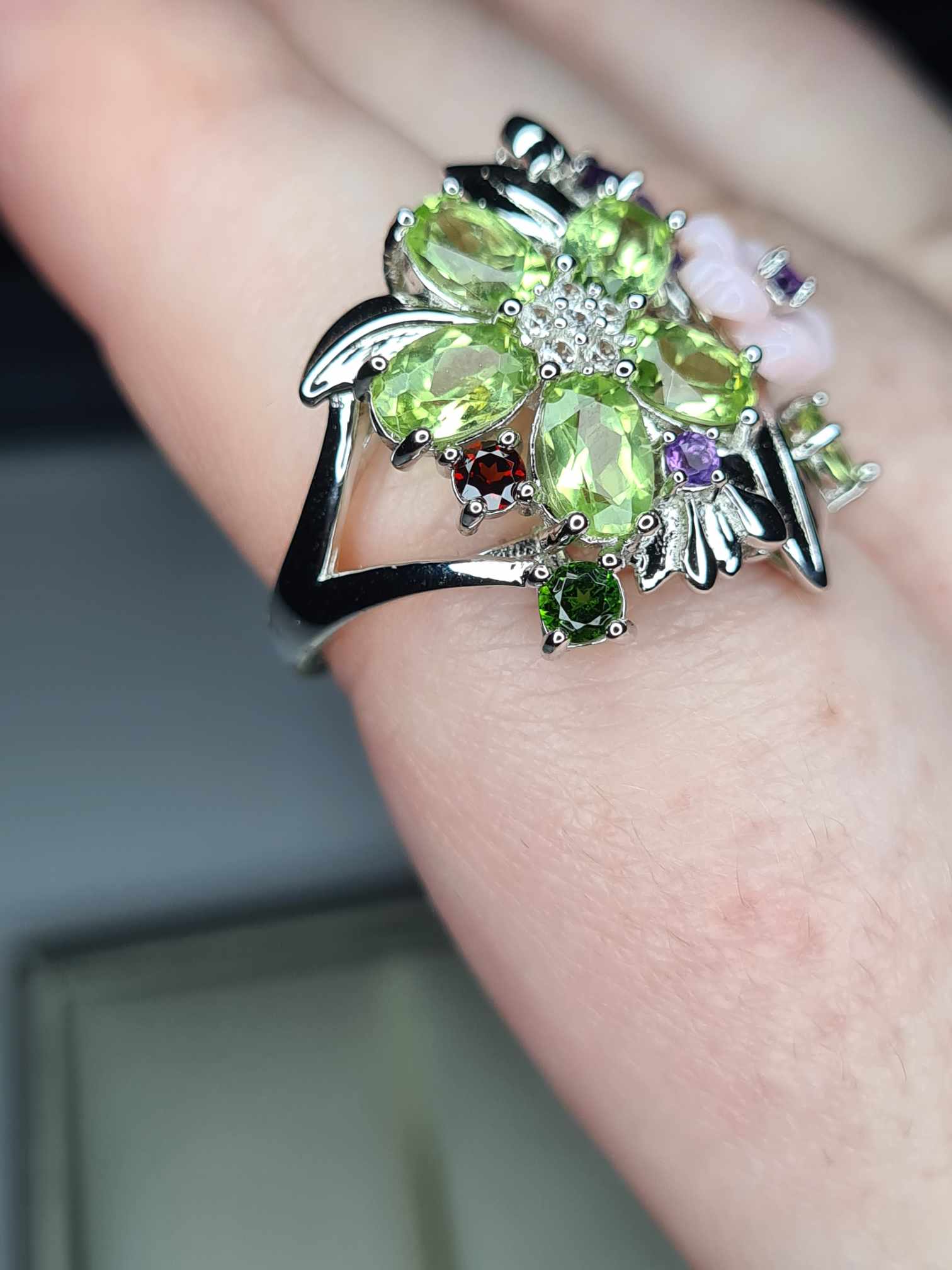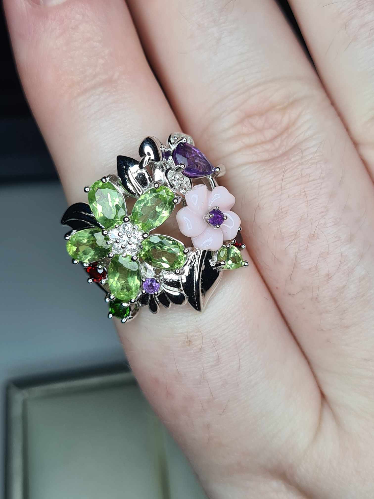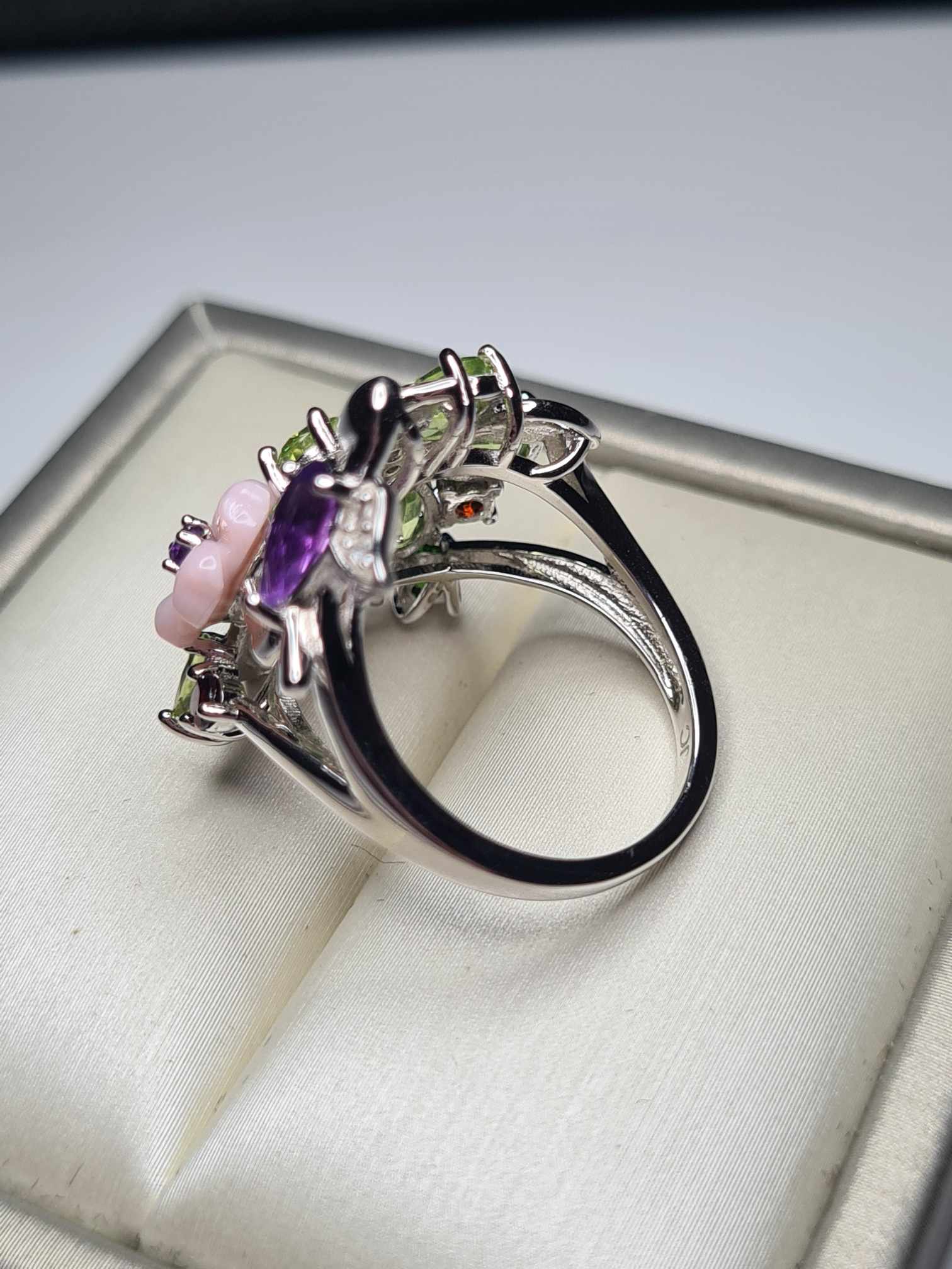 This stunning floral ring showcases a variety of natural gemstones, carefully arranged to create the image of a small bird above a large green flower. Elements inspired by nature, such as a small flower made of pink mother of pearl and silver foliage, add a touch of elegance and charm.