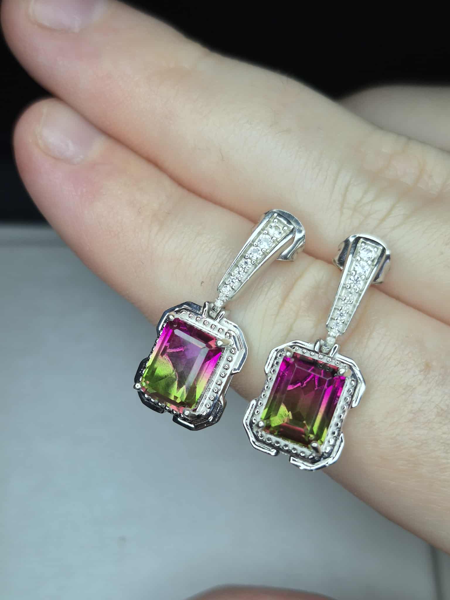 5.28ct Watermelon Quartz Triplet & White Zircon Dangling Earrings 925 Sterling Silver