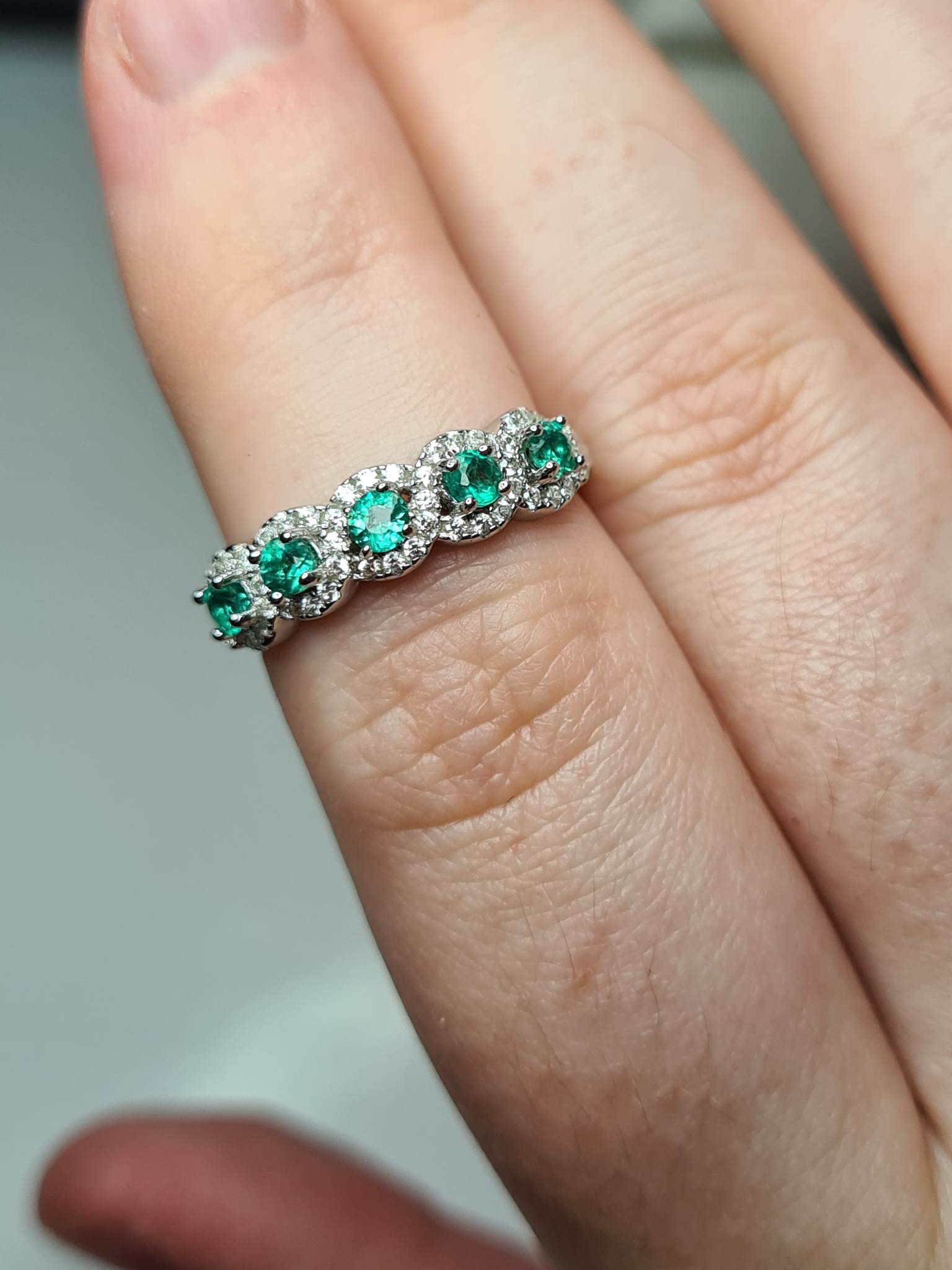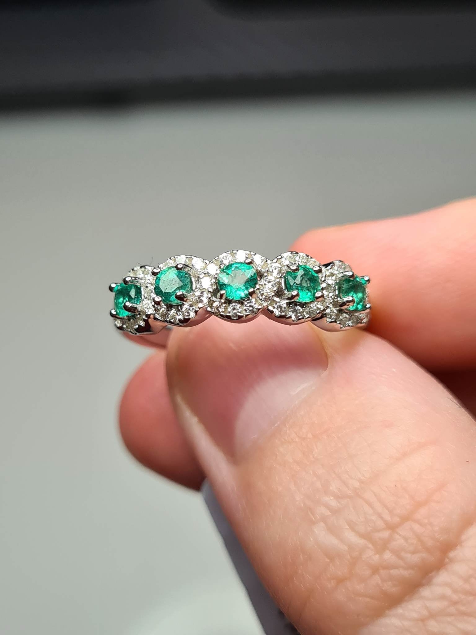 This exquisite ring showcases the natural beauty of AAA Kagem Zambian Emeralds, each measuring 3mm in a round faceted cut, totaling 0.601ct each. Mined and cut by Gemfields, these responsibly sourced emeralds are renowned for their exceptional color and clarity. The ensemble is complemented by a halo of 50 White Zircon stones, each 1mm in diameter and faceted, totaling 0.375ct.