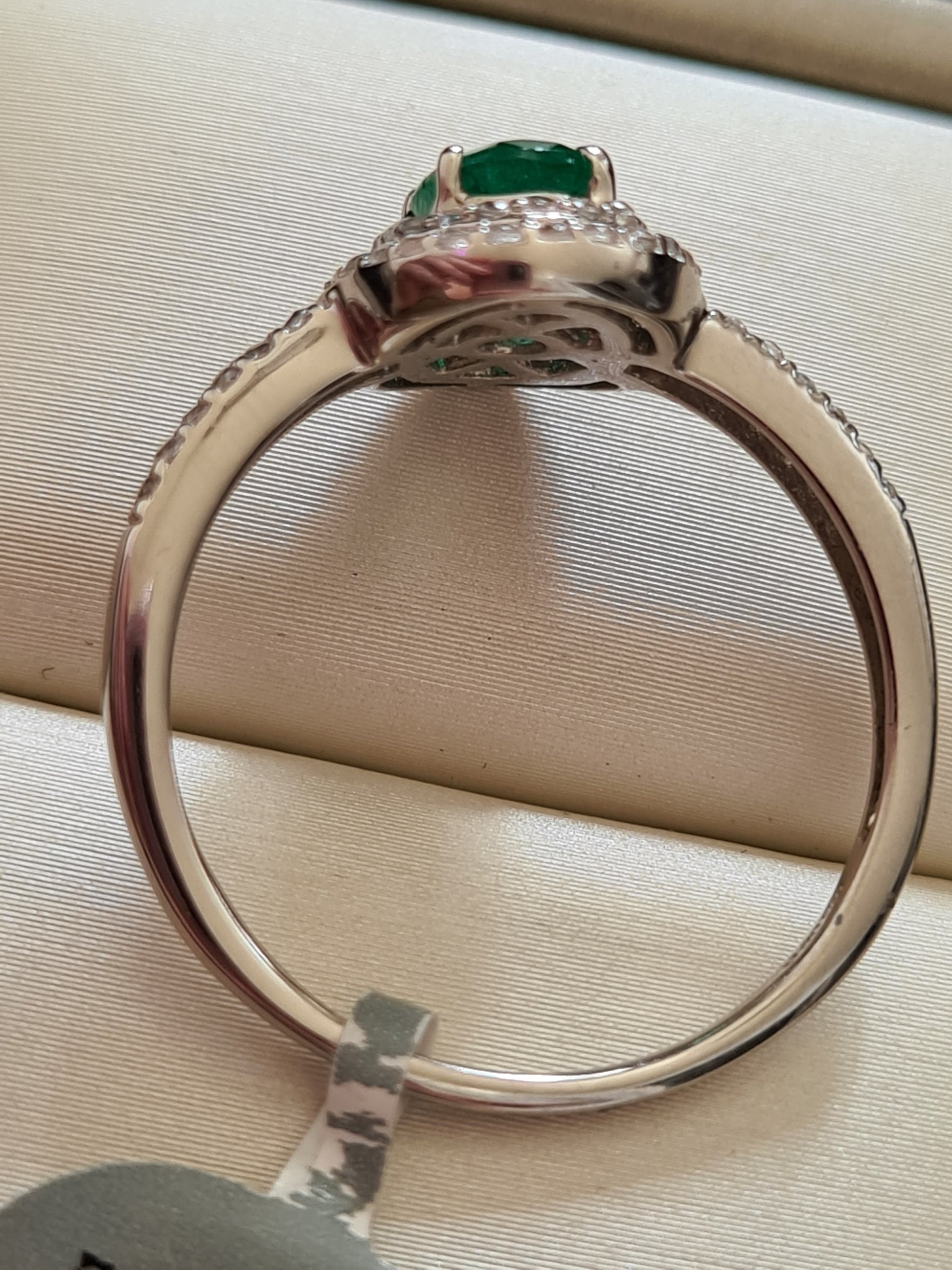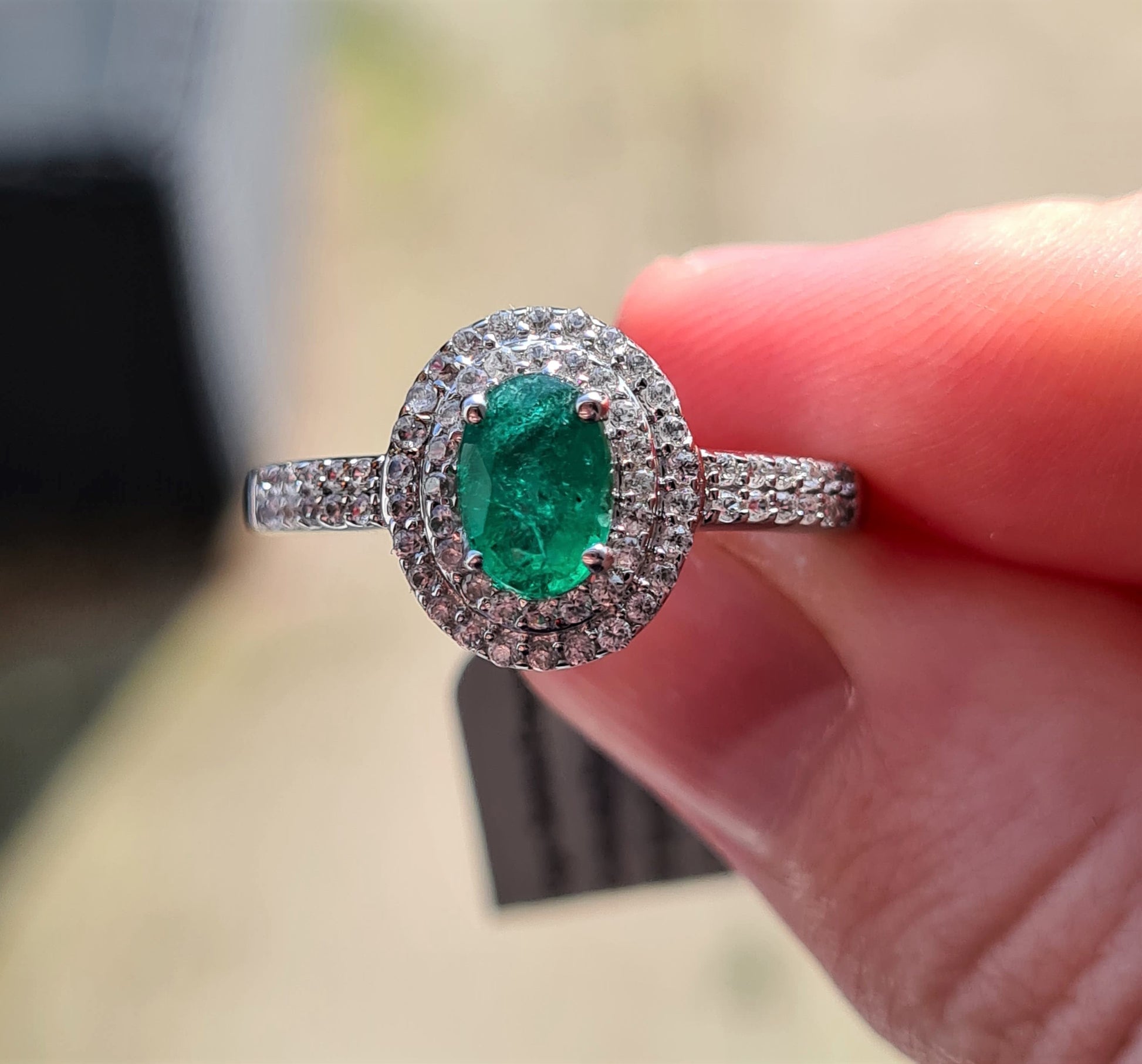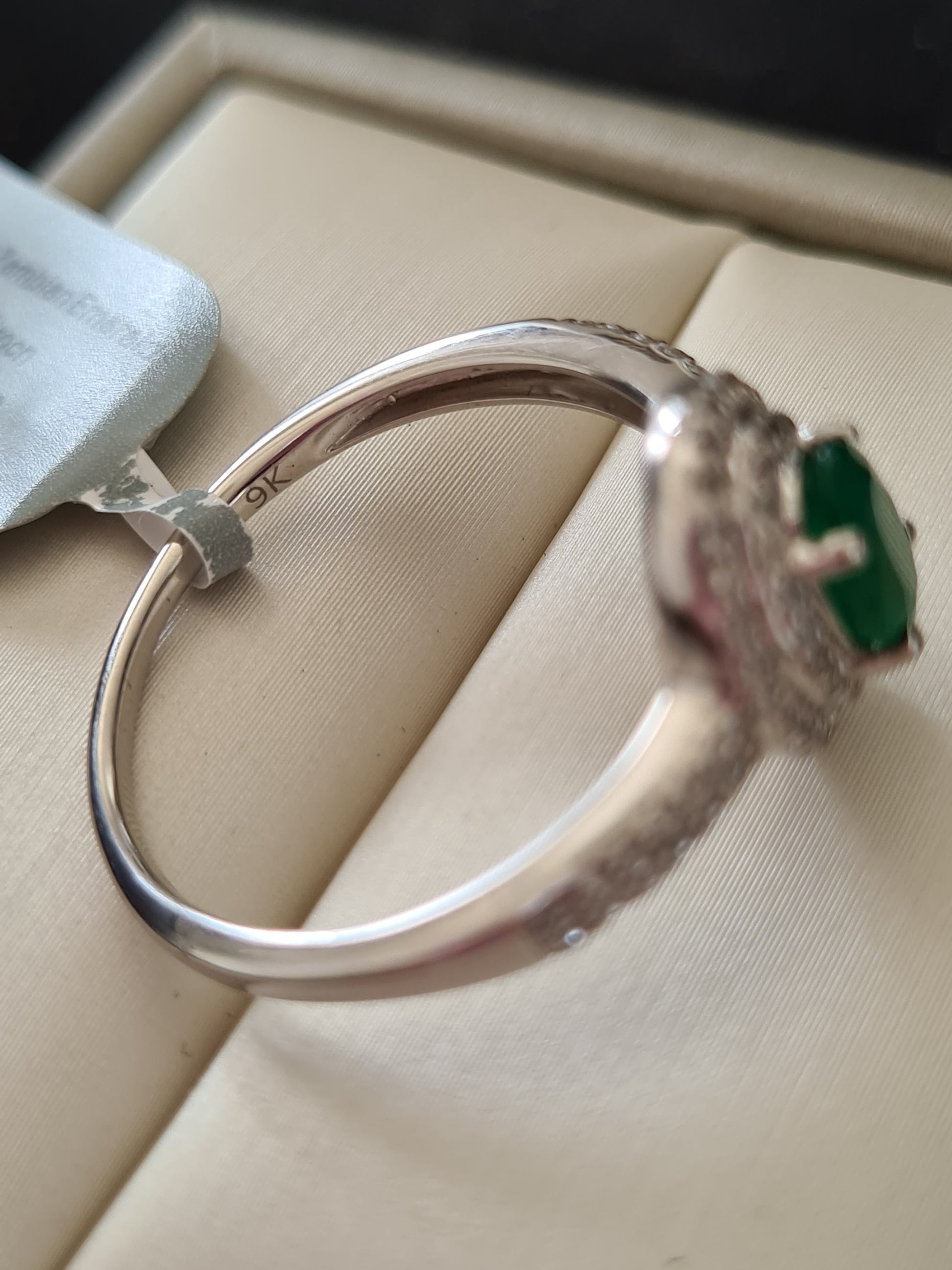Indulge in timeless beauty with our Kagem Zambian Emerald and Cambodian Zircon Ring. Crafted in 9K White Gold, this resizable ring (SIZE S) offers a perfect fit.