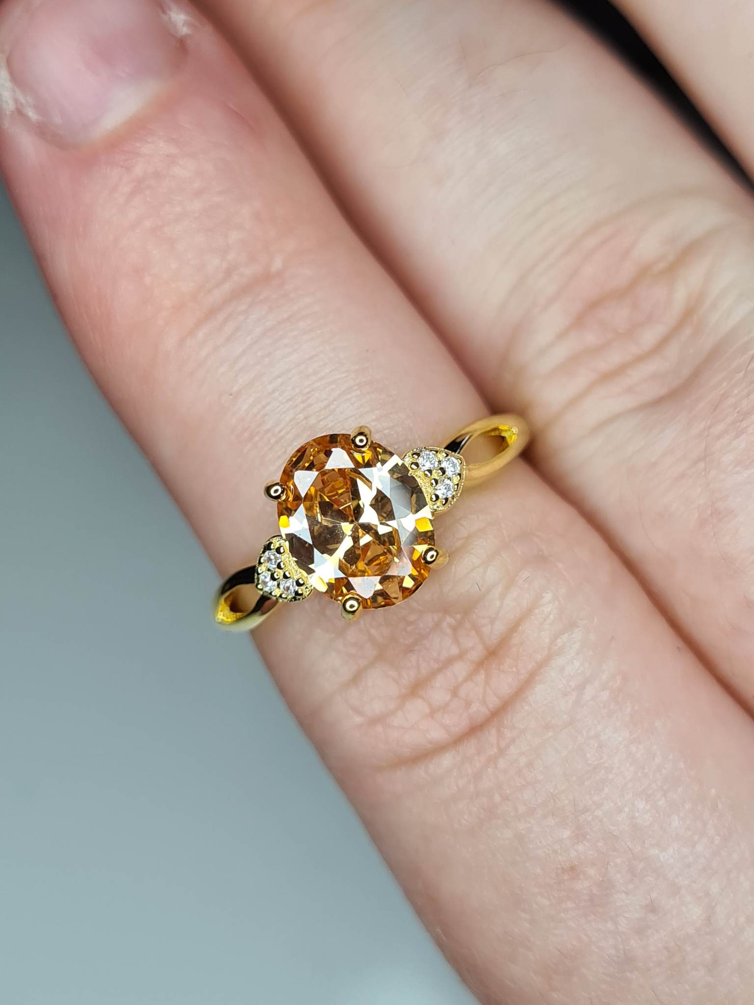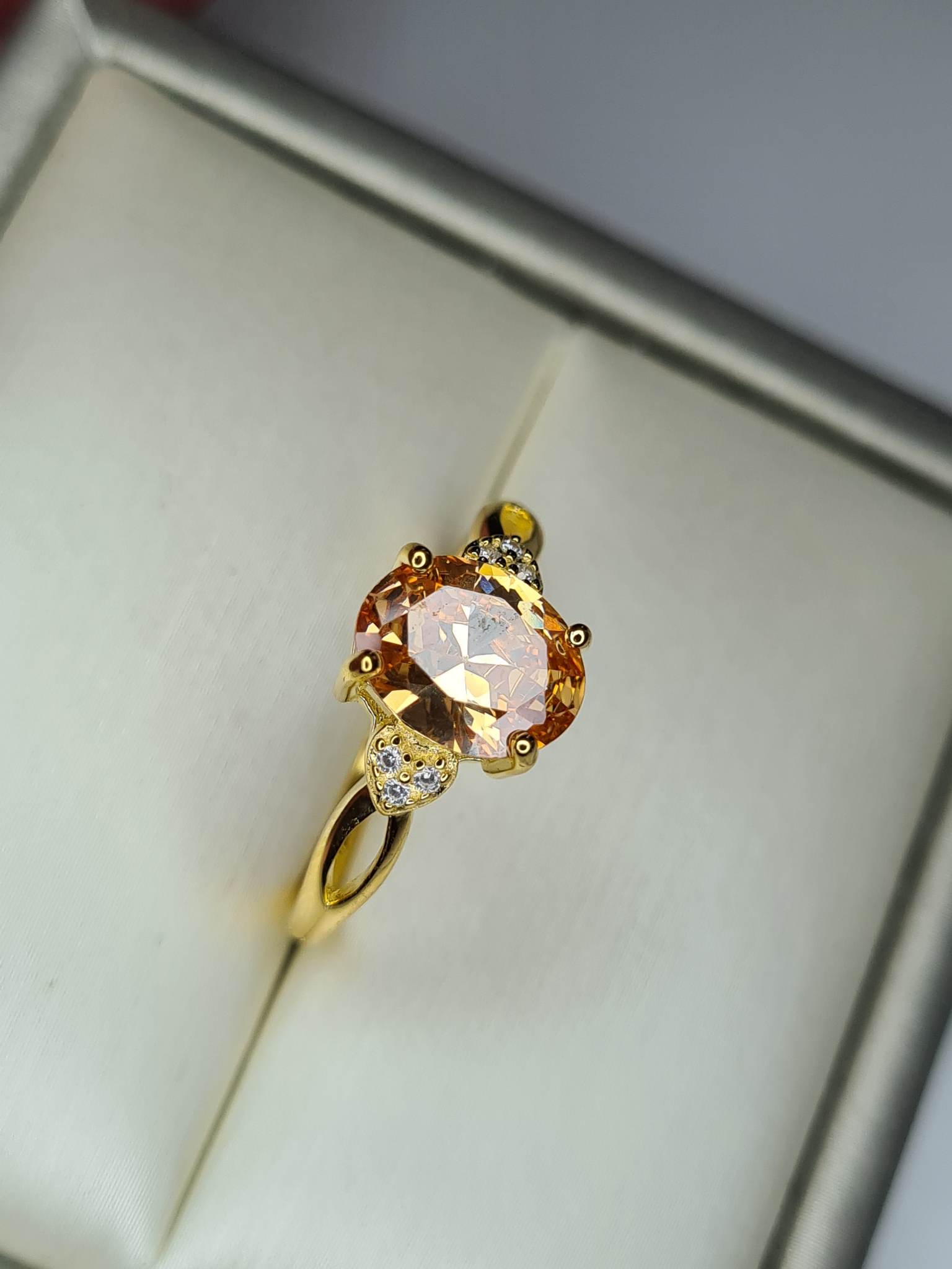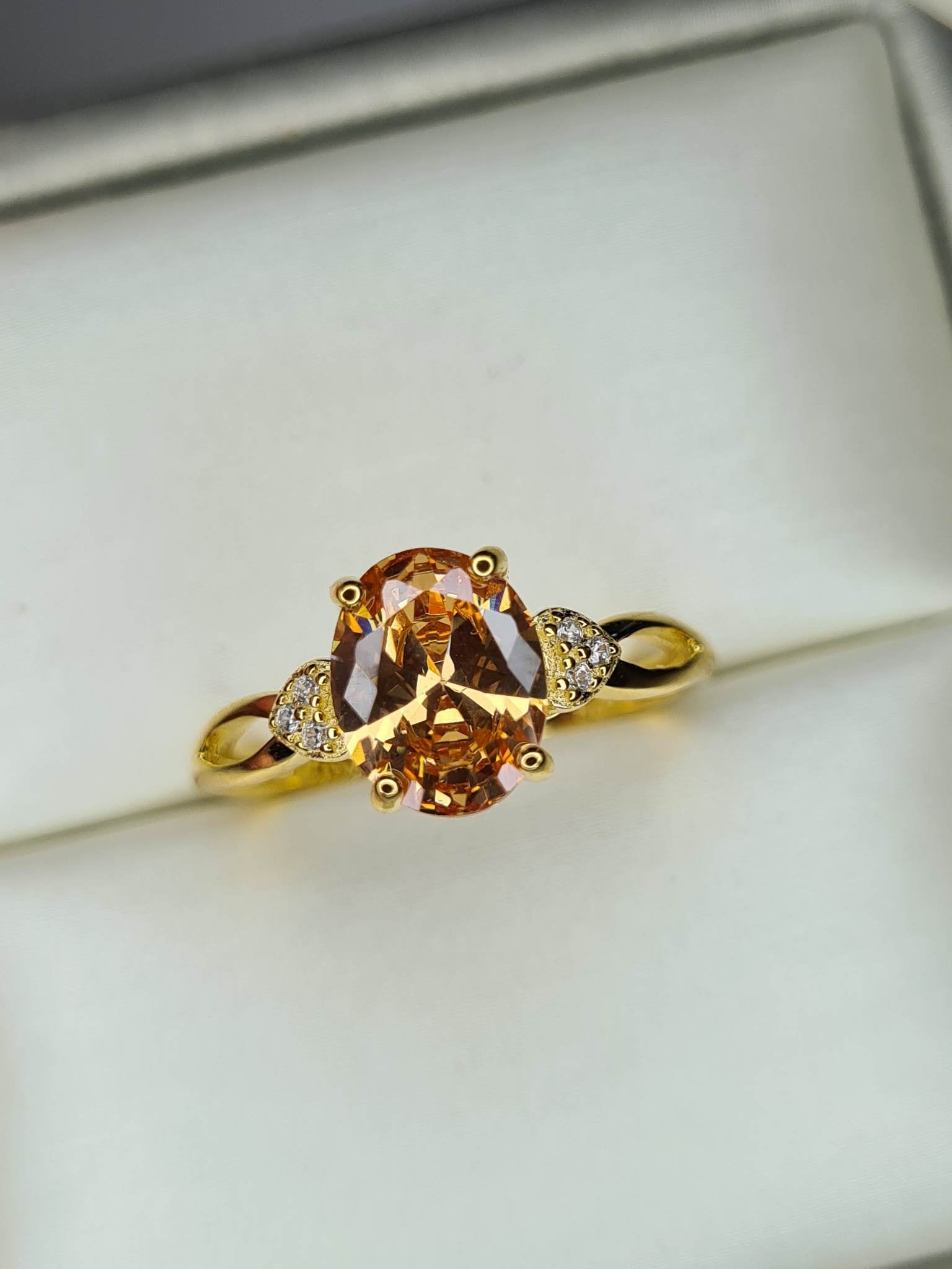 - Centre Stone Brilliance: The centerpiece boasts an oval-cut simulated diamond measuring 9x7mm, radiating a warm and vibrant peachy orange hue with a faceted cut, capturing attention with 2.500 carats of brilliance.