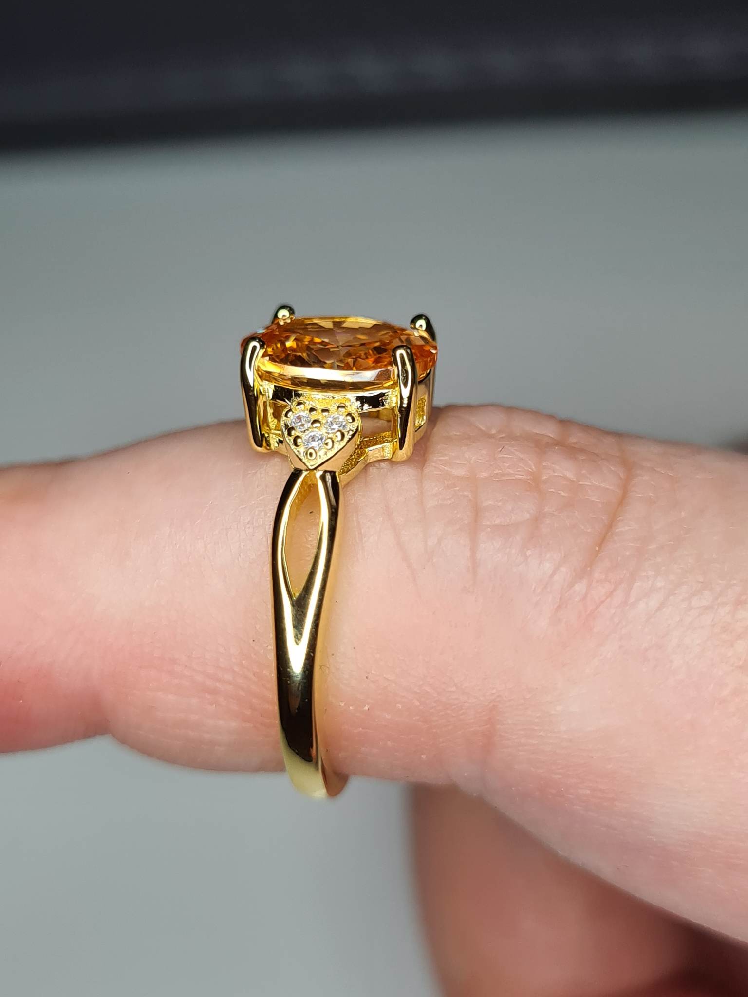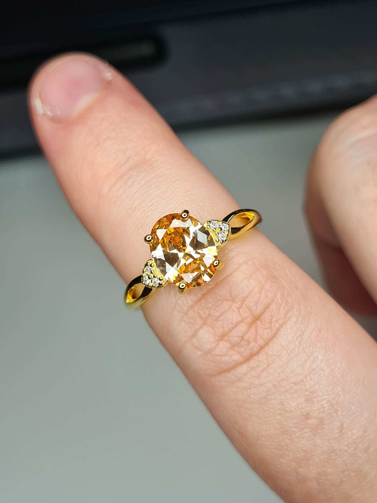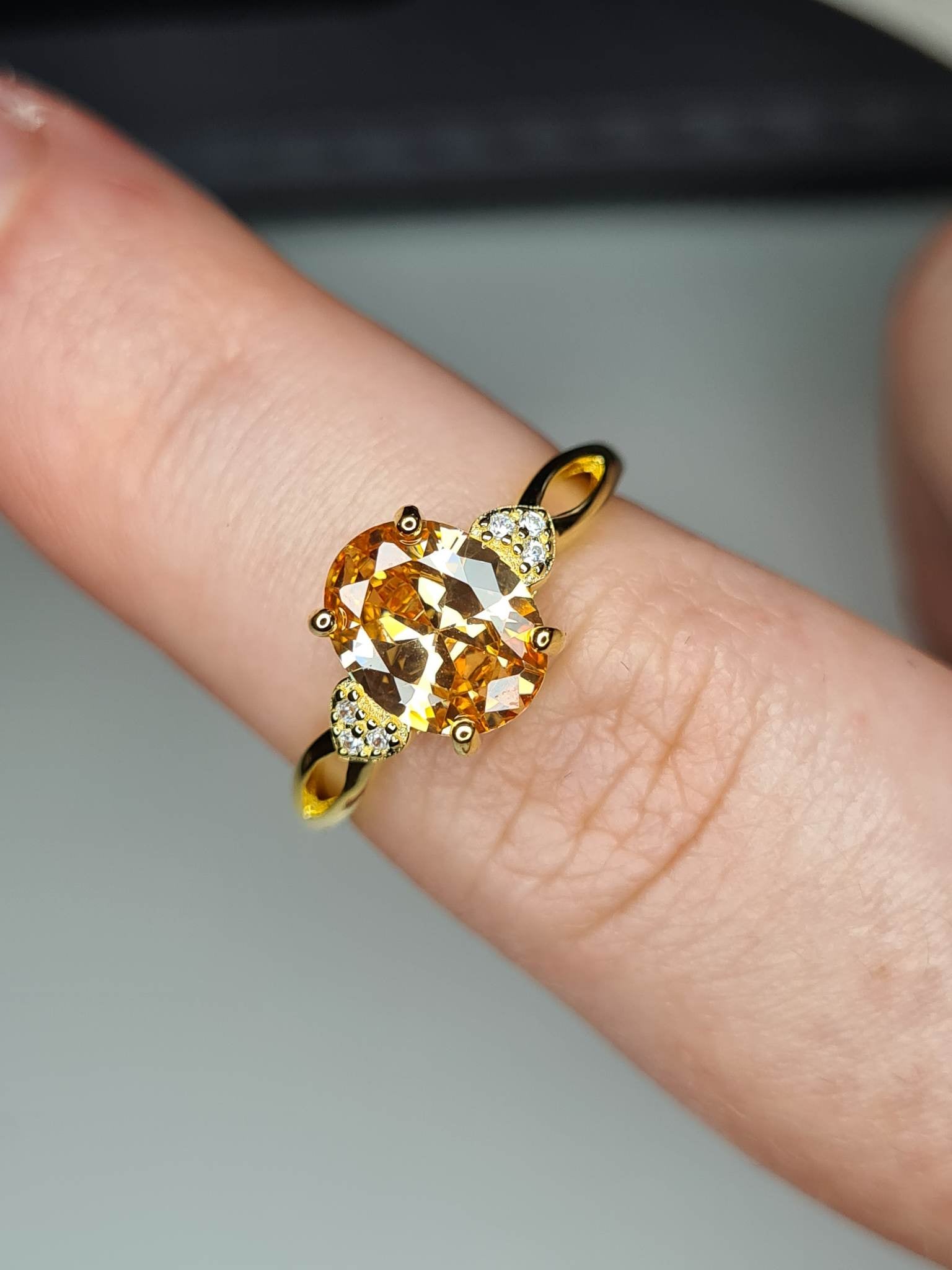 - Centre Stone Brilliance: The centerpiece boasts an oval-cut simulated diamond measuring 9x7mm, radiating a warm and vibrant peachy orange hue with a faceted cut, capturing attention with 2.500 carats of brilliance.