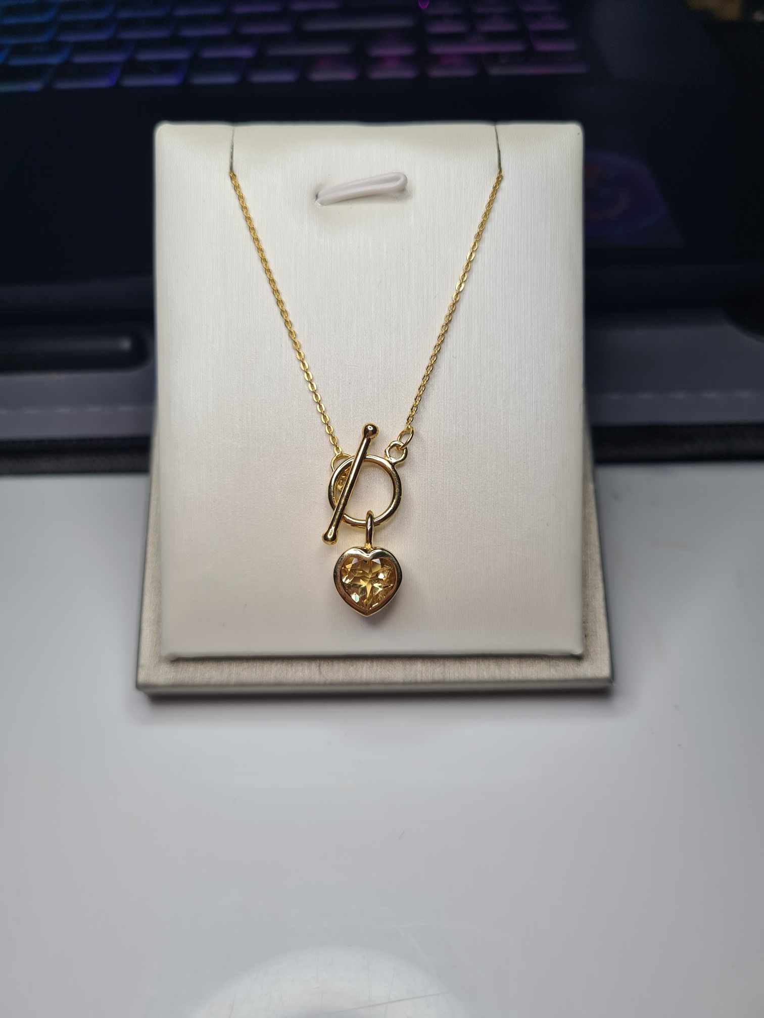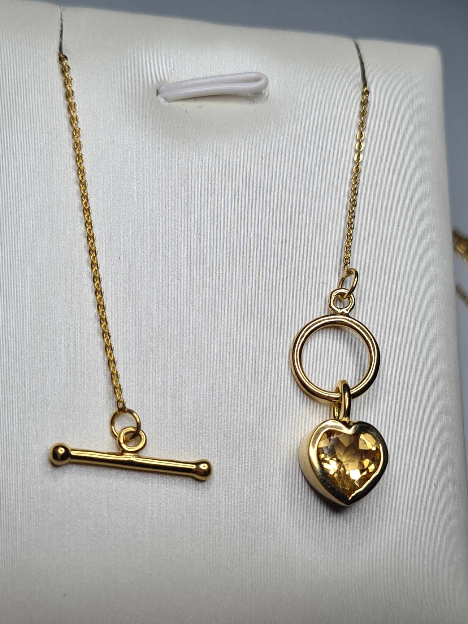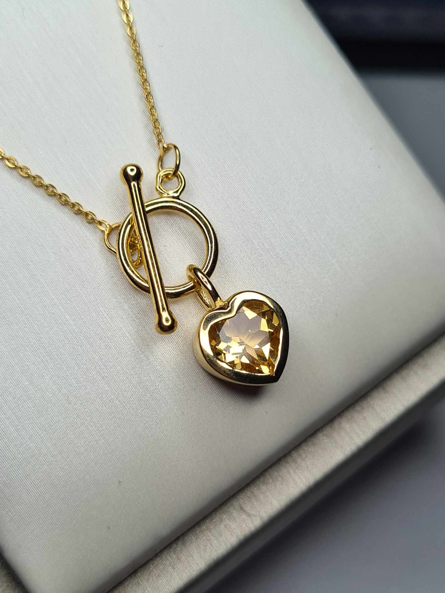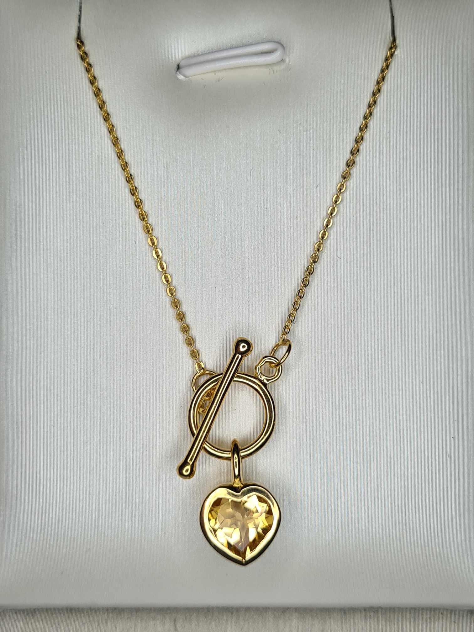 Citrine Heart Charm T Bar Necklace 14K Gold Overlay 925 Sterling Silver