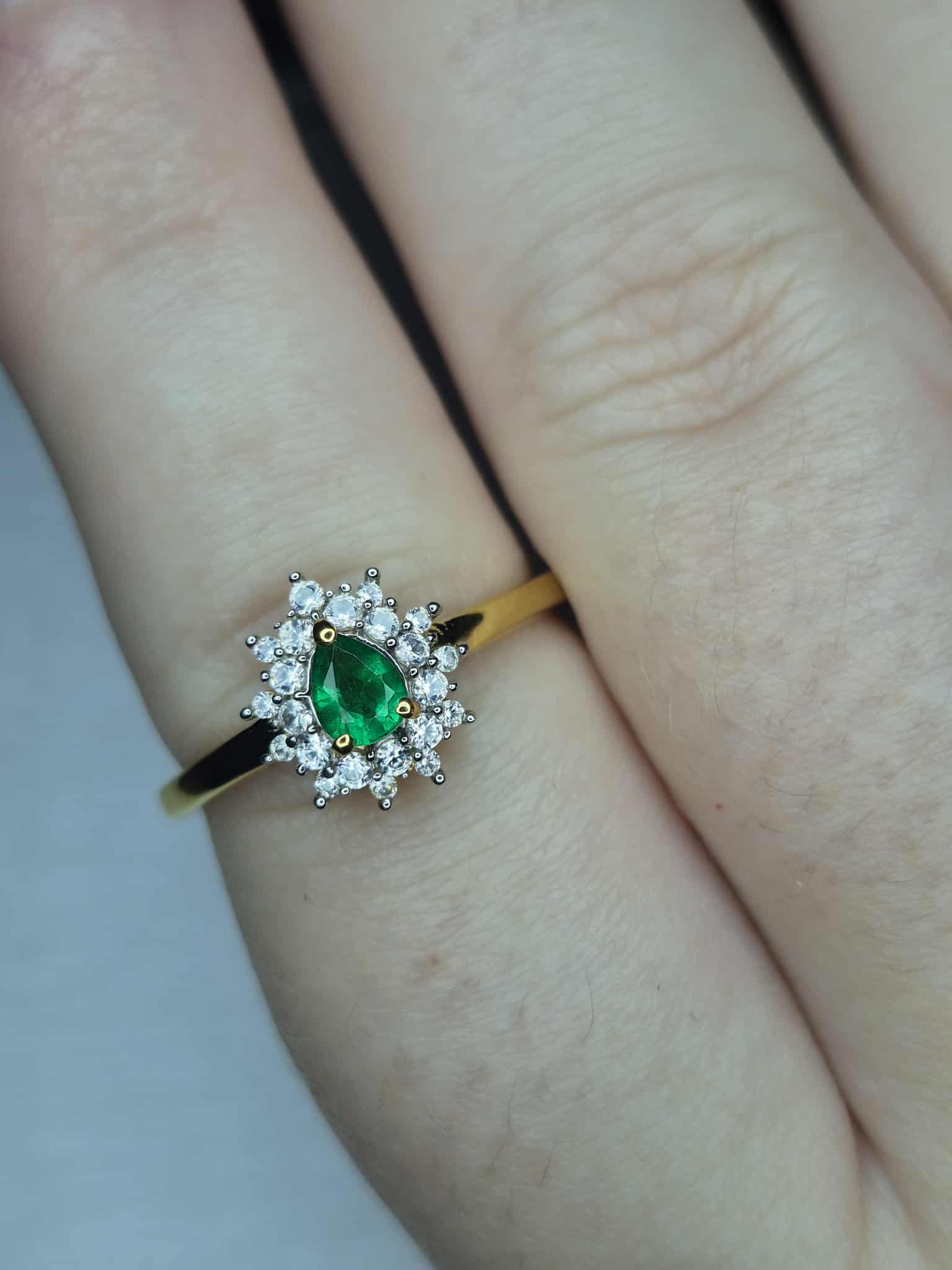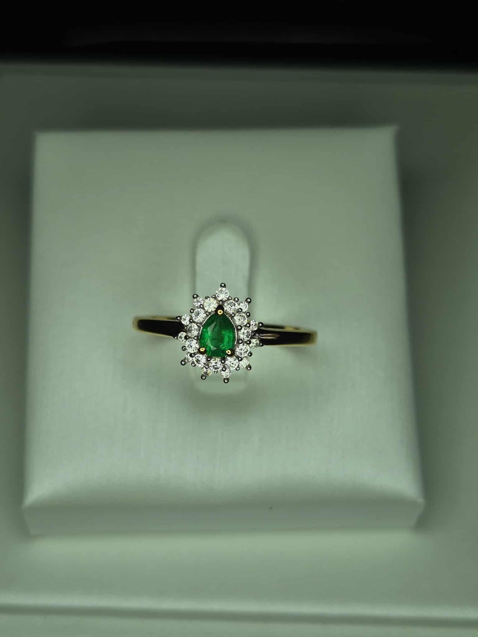 Colombian Emerald & White Zircon Halo Ring in 18K Gold Overlay 925 Sterling Silver SIZE R