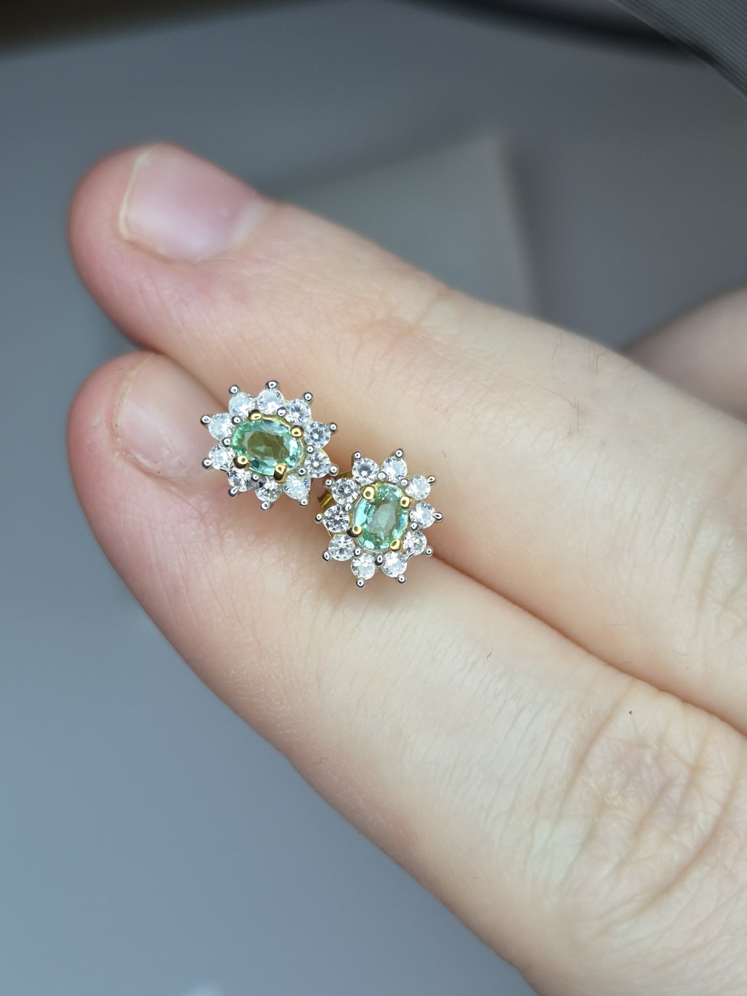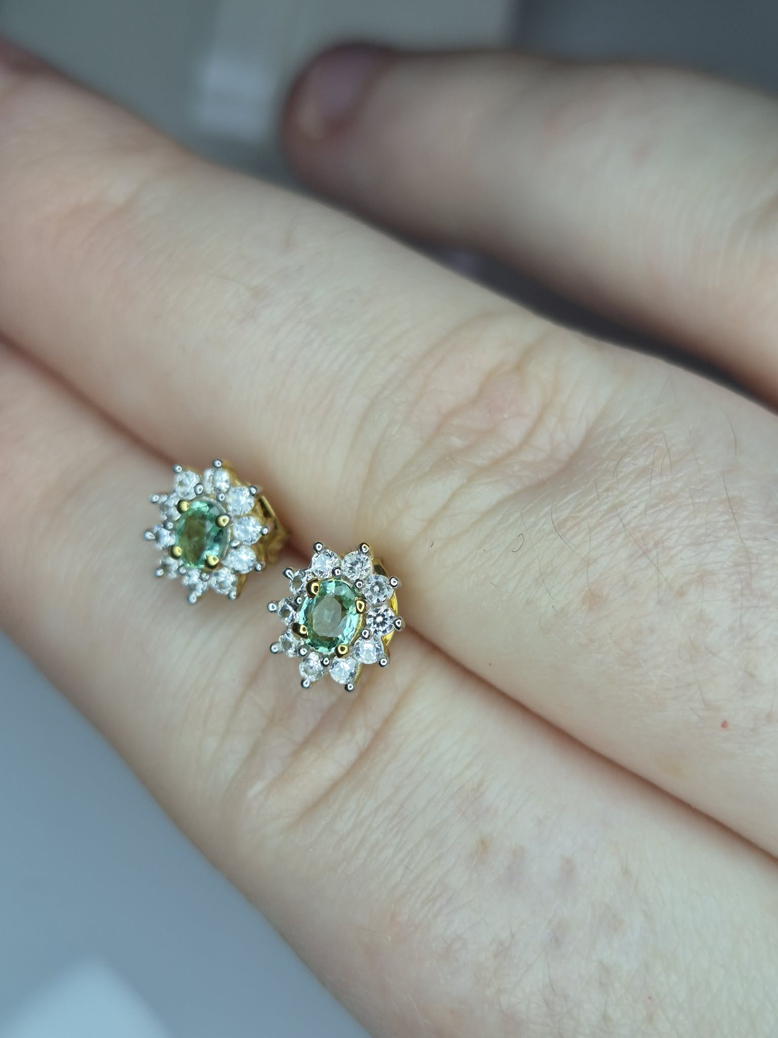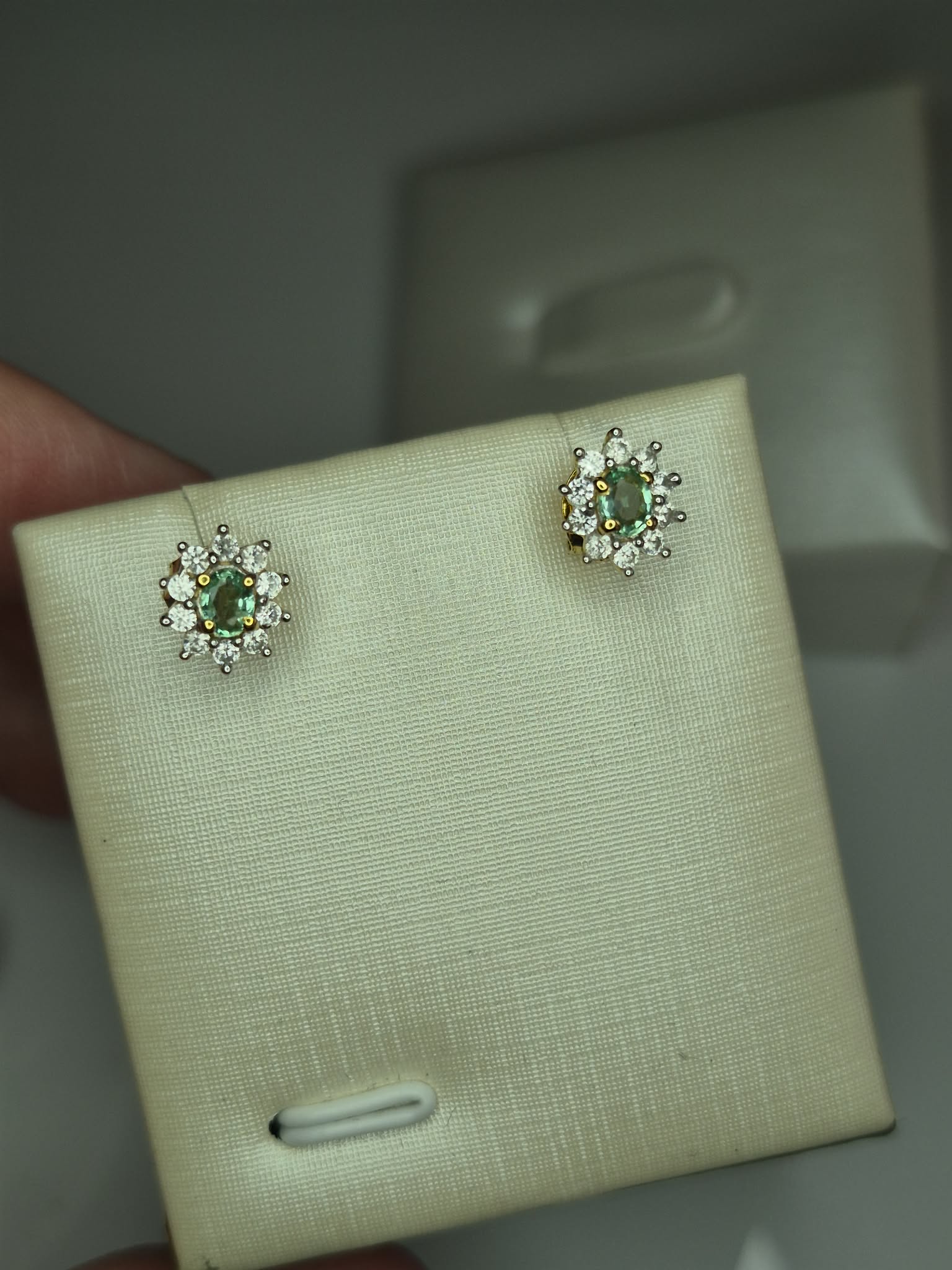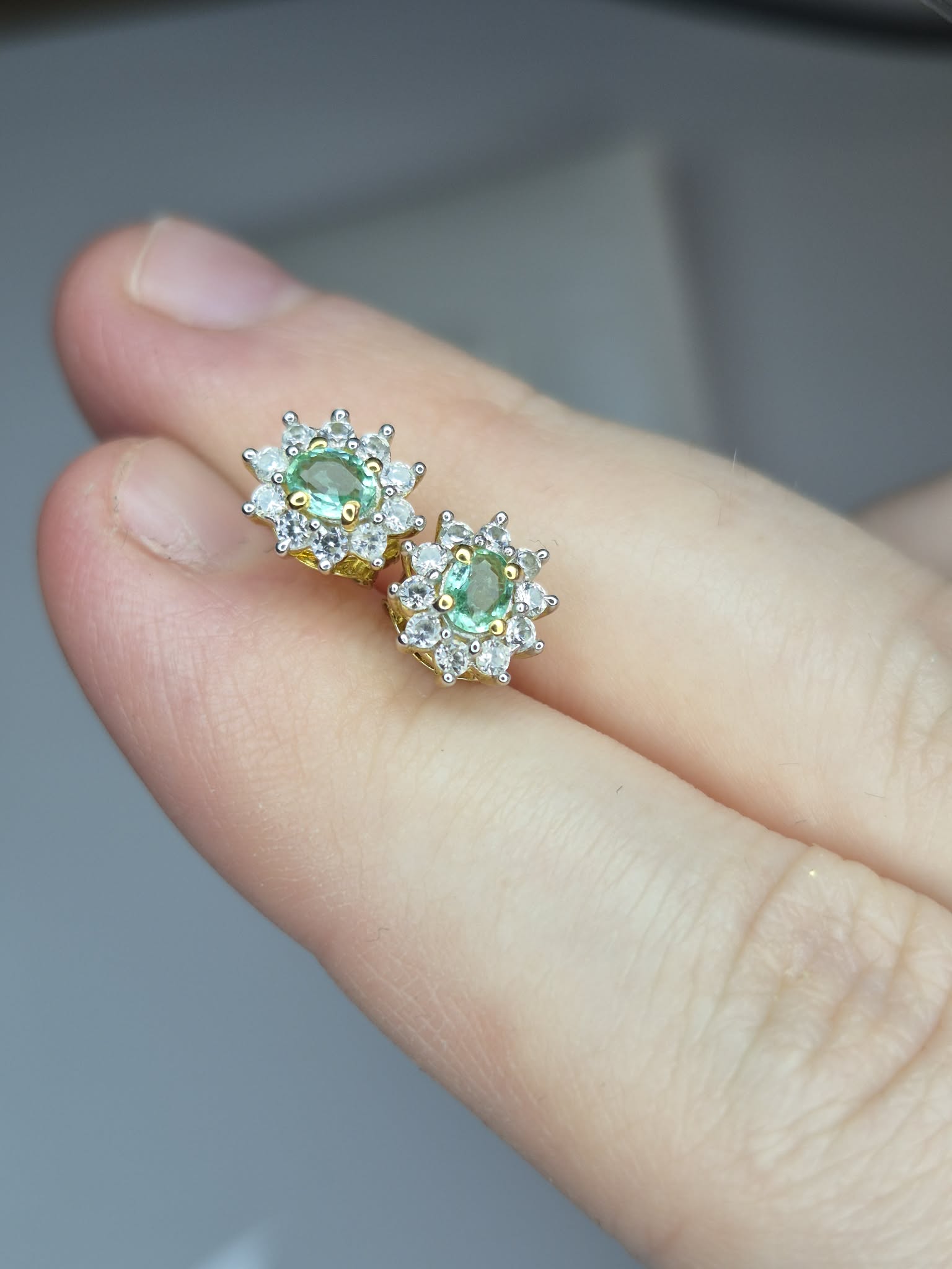 Colombian Emerald & White Zircon Stud Earrings 18k Gold Overlay 925 Sterling Silver