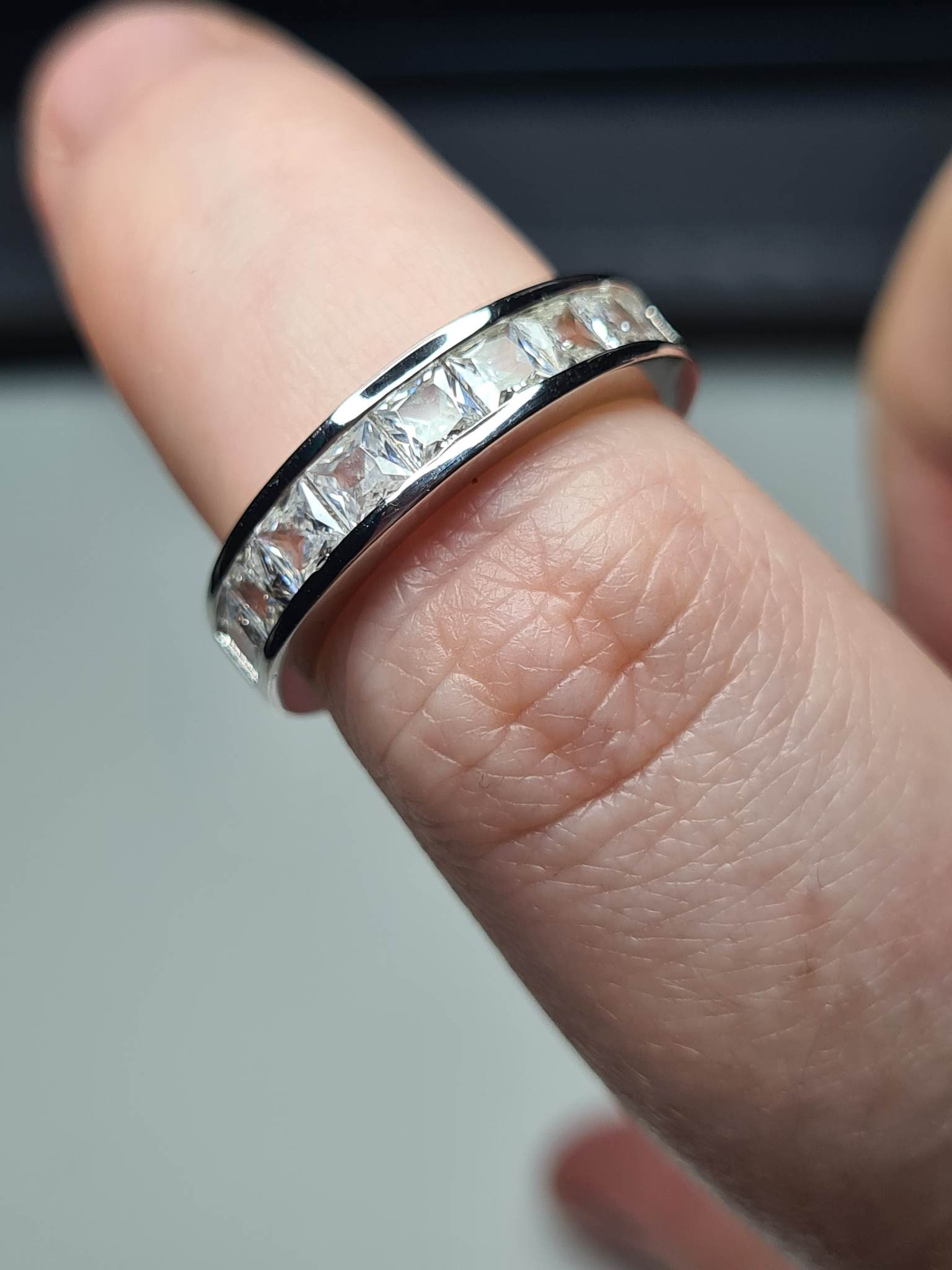 Gemstone Insight: Cubic Zirconia, with its brilliant sparkle and fire, mimics the appearance of diamonds, making it a popular and affordable alternative. The square-cut stones in this ring add a touch of modern elegance, creating a sophisticated and versatile piece for daily wear.