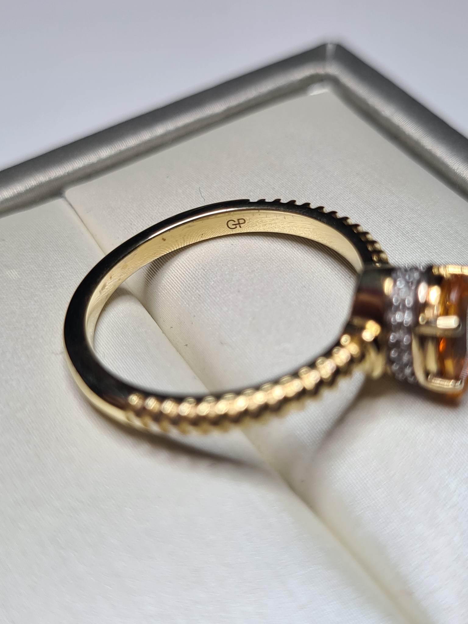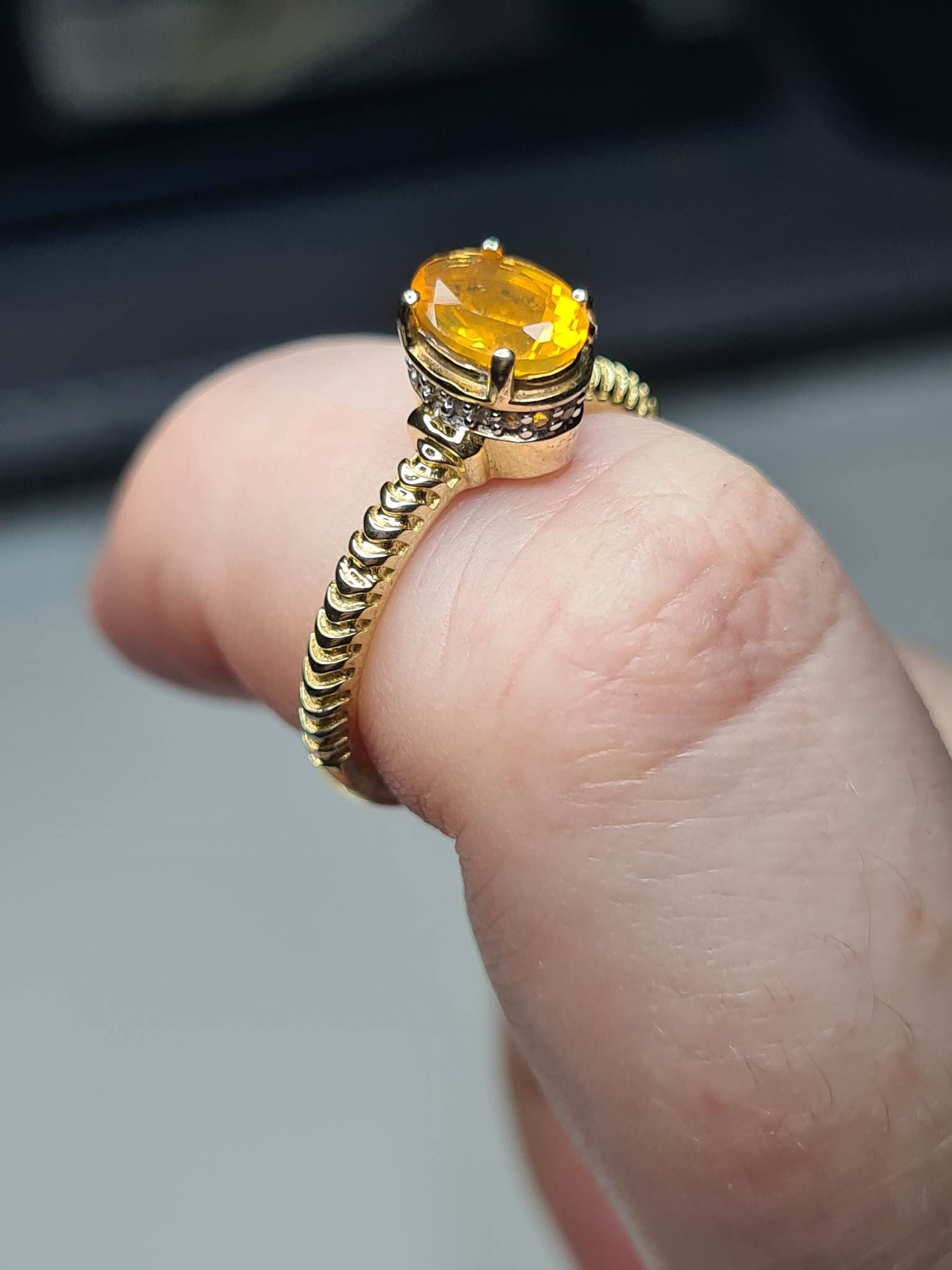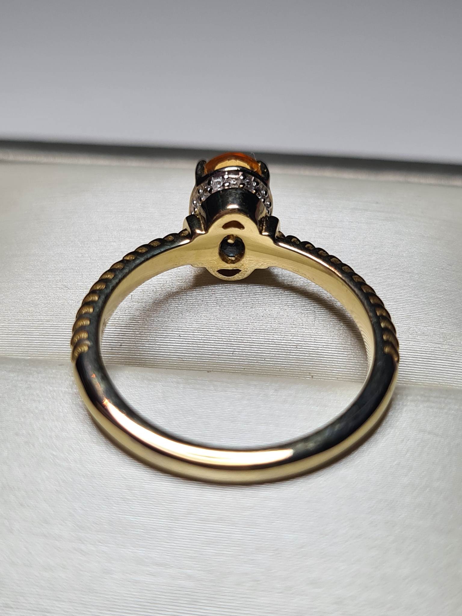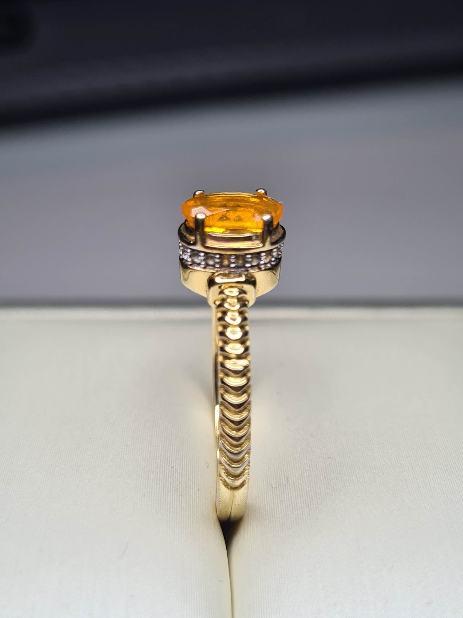 - Fire Opal: The oval-cut 7x5mm fire opal with a faceted cut, weighing 0.500ct, serves as the captivating centerpiece, radiating fiery hues.