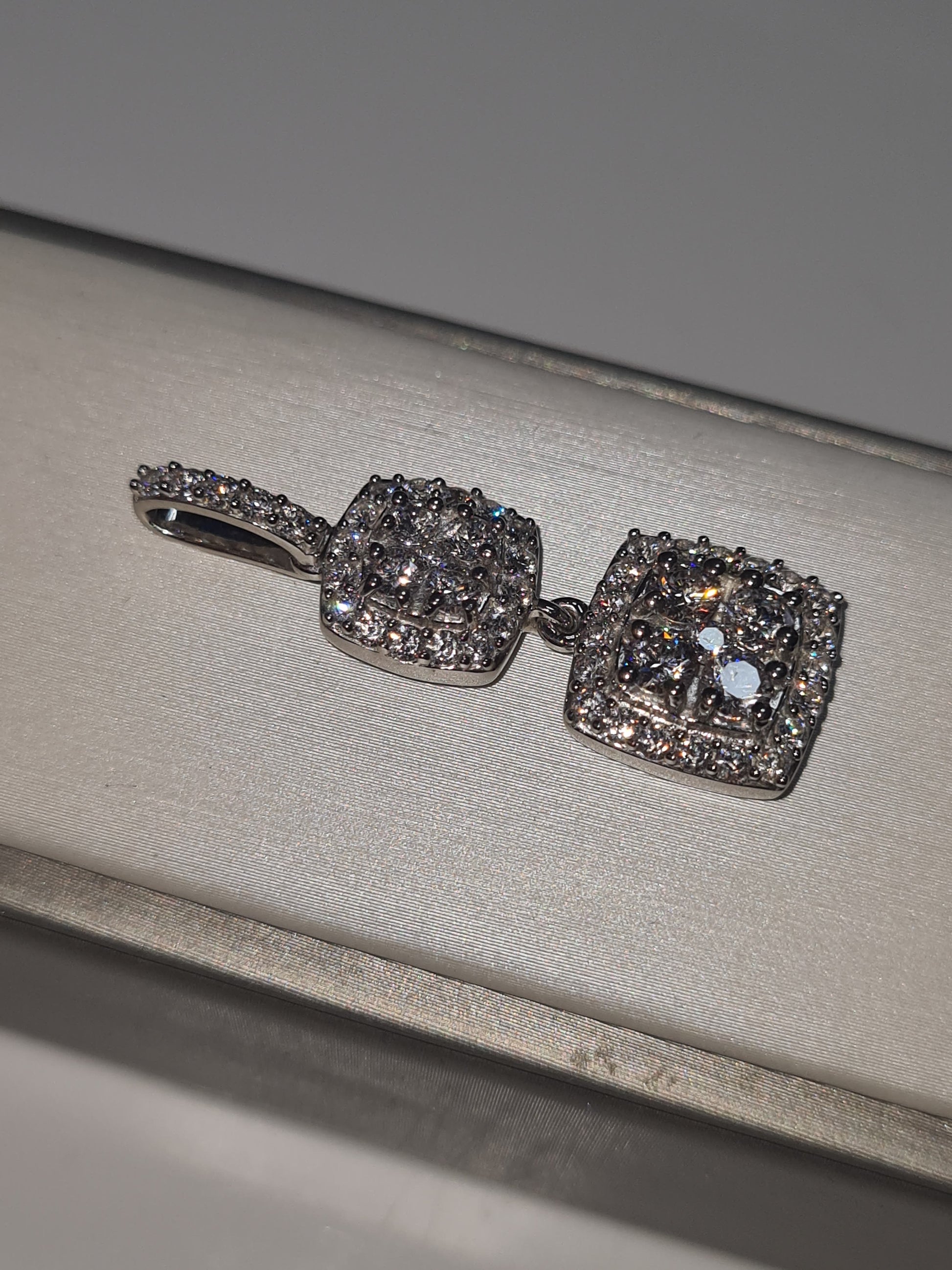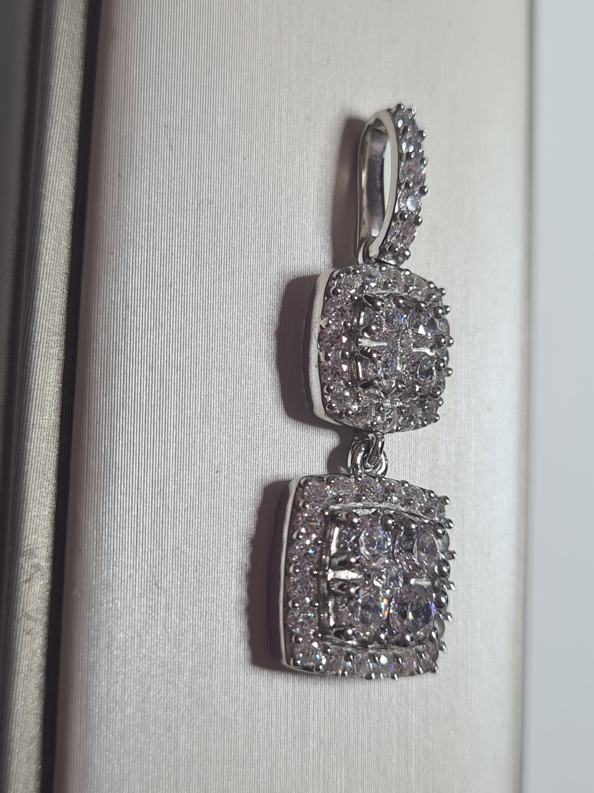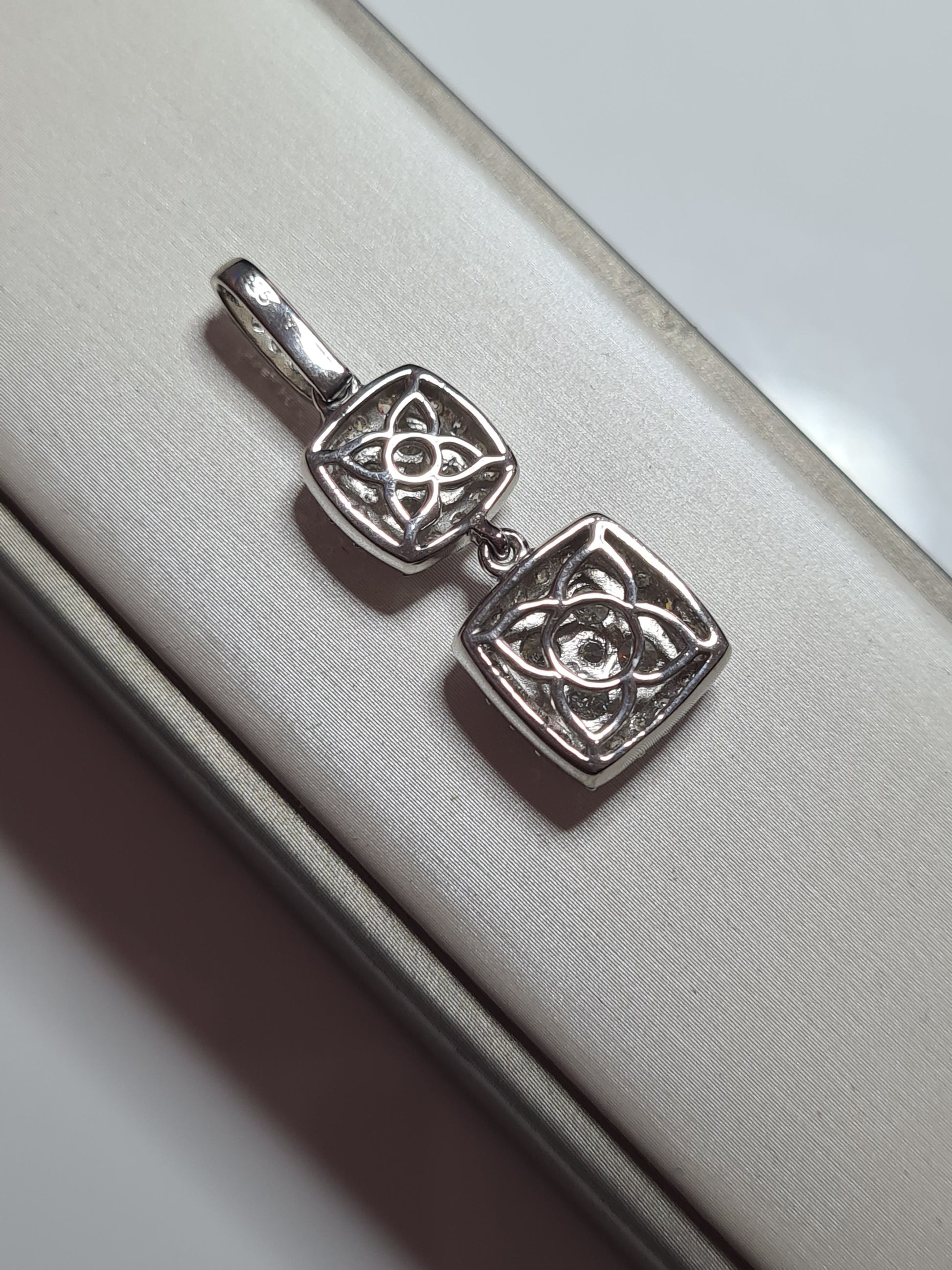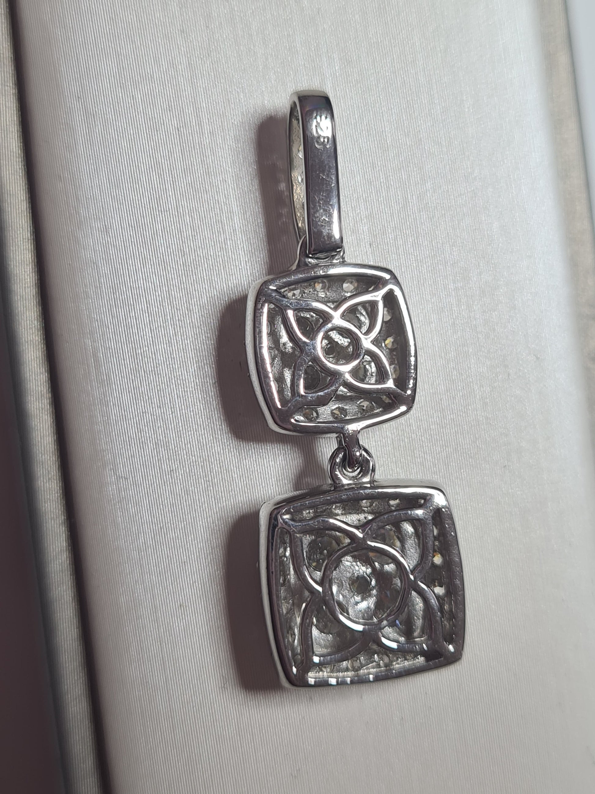 - Design: The pendant features two squares—both adorned with exquisite Swarovski Zirconia. The smaller square boasts a central halo made of four round-cut stones, while the larger bottom square dazzles with larger center stones and a surrounding halo. Additional round-cut Swarovski Zirconia stones embellish the front of the gage.