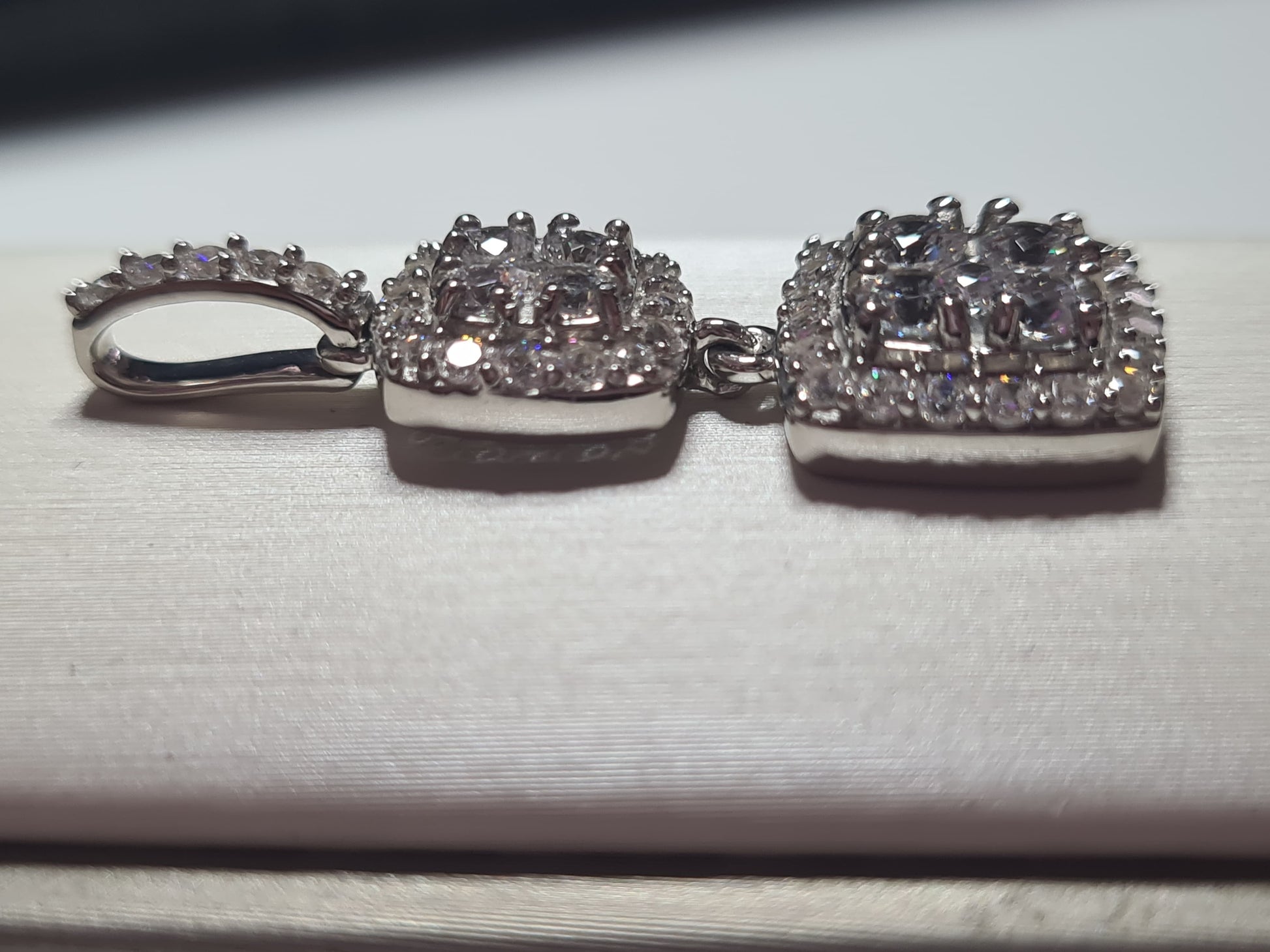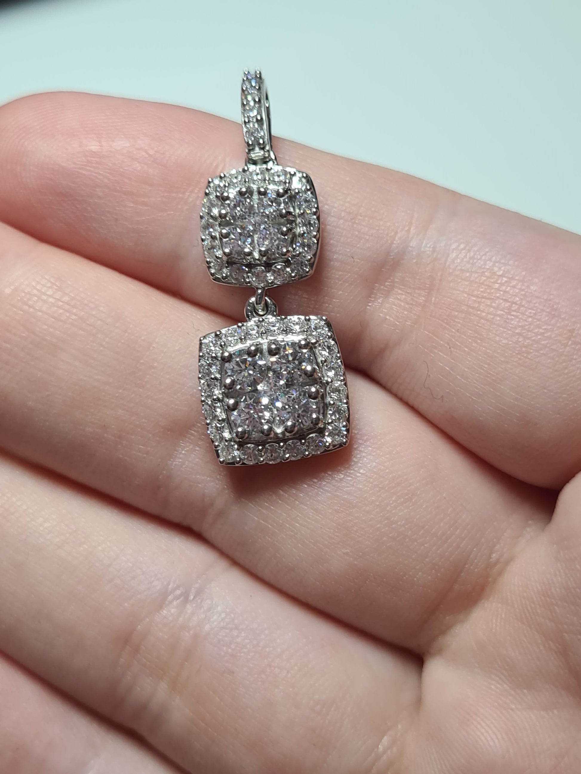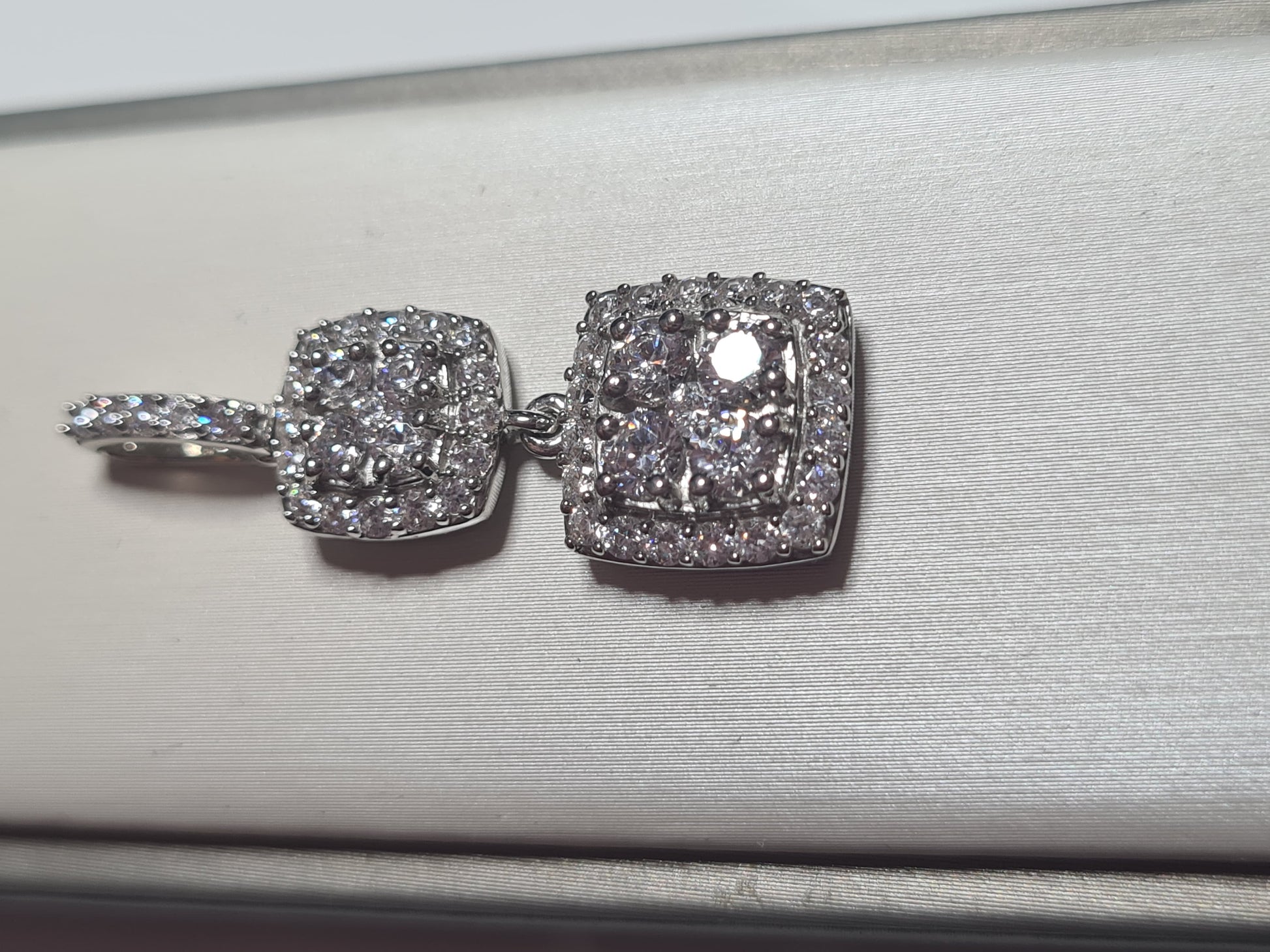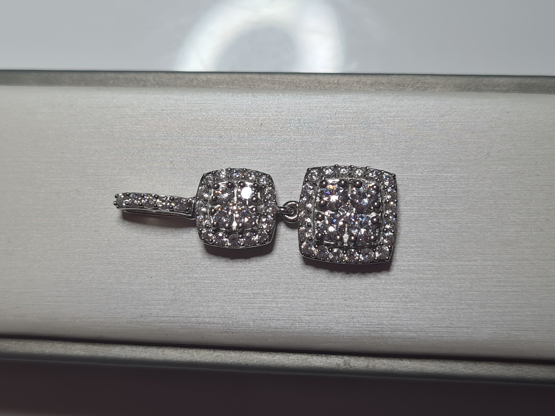 - Design: The pendant features two squares—both adorned with exquisite Swarovski Zirconia. The smaller square boasts a central halo made of four round-cut stones, while the larger bottom square dazzles with larger center stones and a surrounding halo. Additional round-cut Swarovski Zirconia stones embellish the front of the gage.