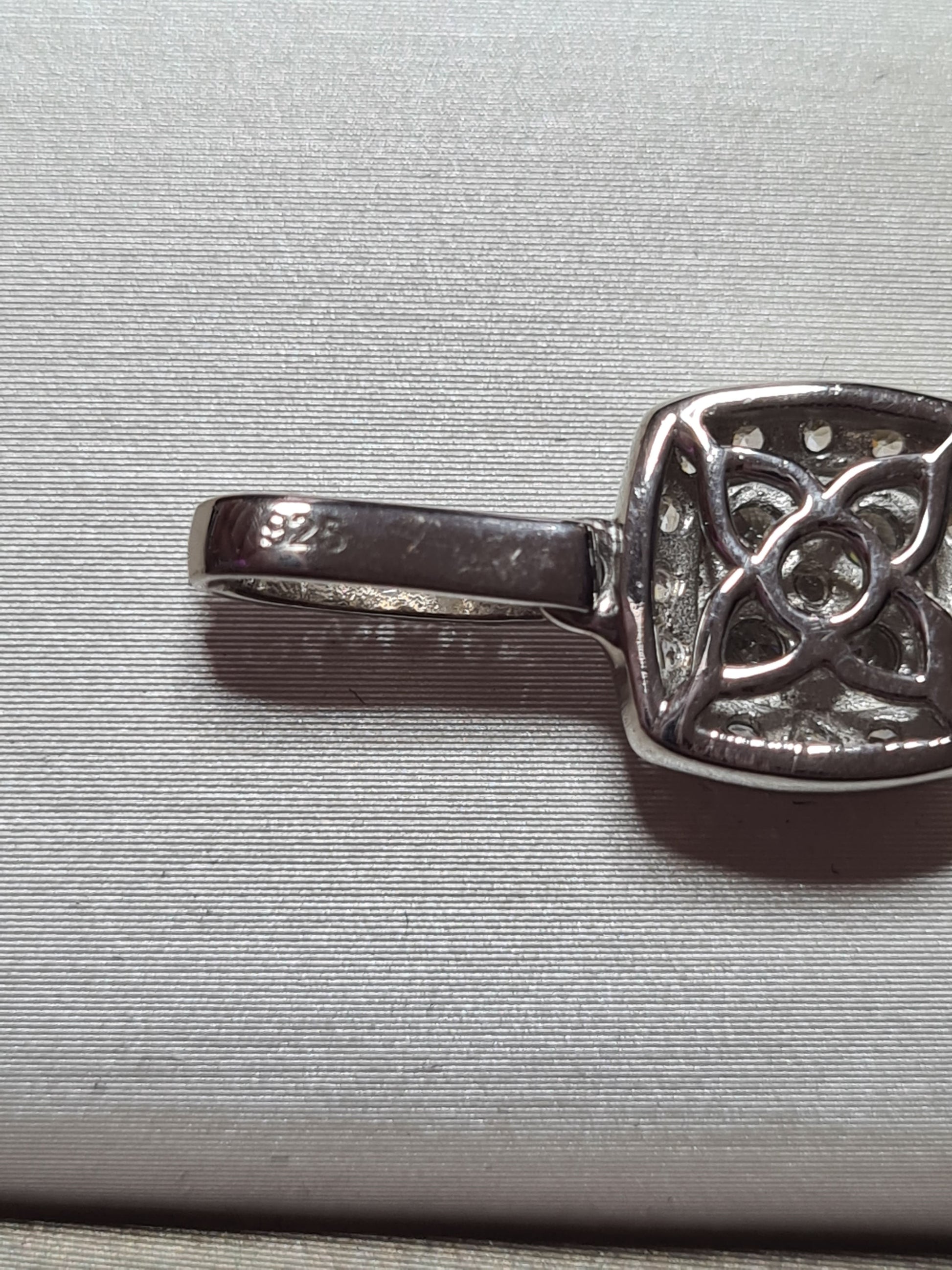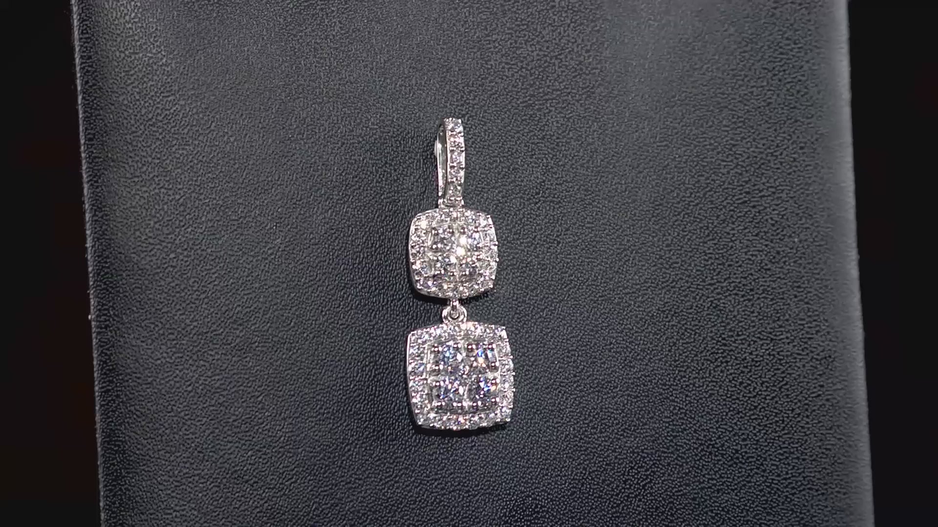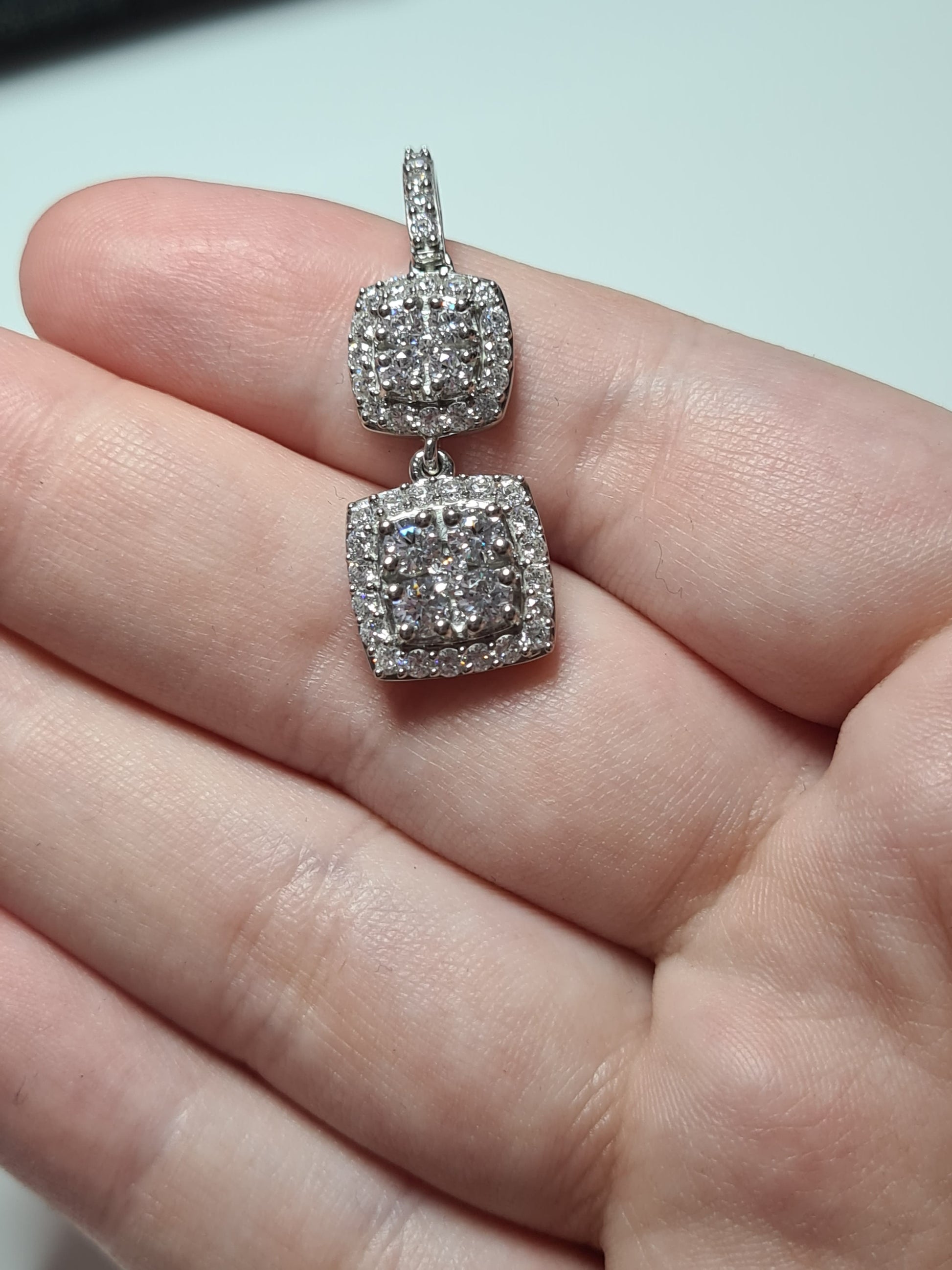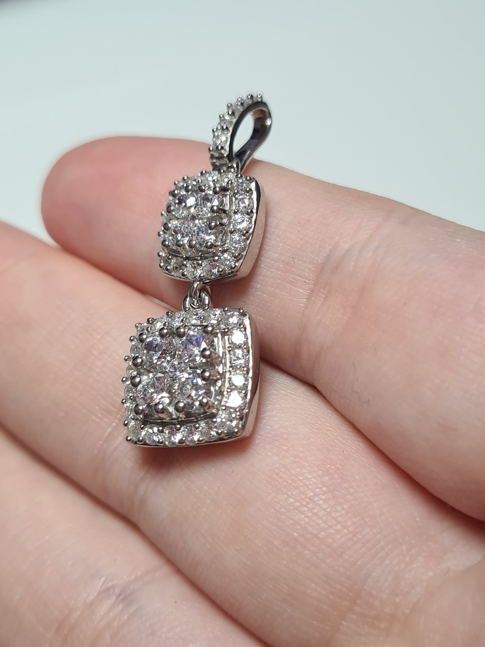 - Design: The pendant features two squares—both adorned with exquisite Swarovski Zirconia. The smaller square boasts a central halo made of four round-cut stones, while the larger bottom square dazzles with larger center stones and a surrounding halo. Additional round-cut Swarovski Zirconia stones embellish the front of the gage.