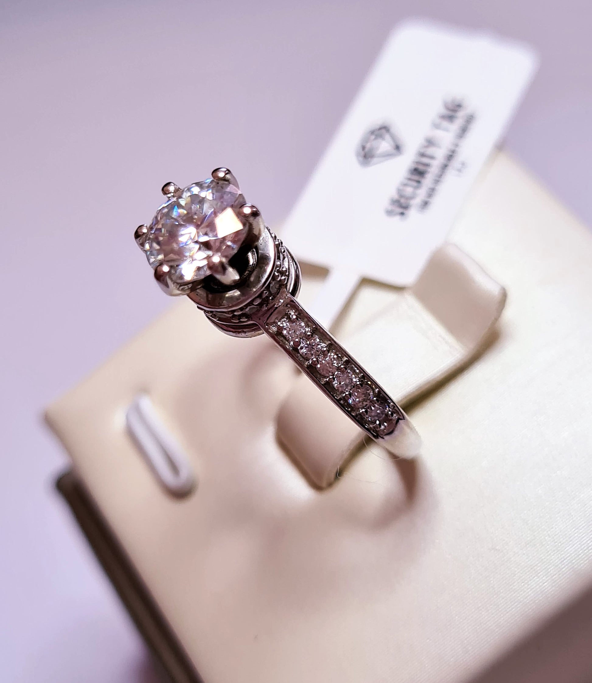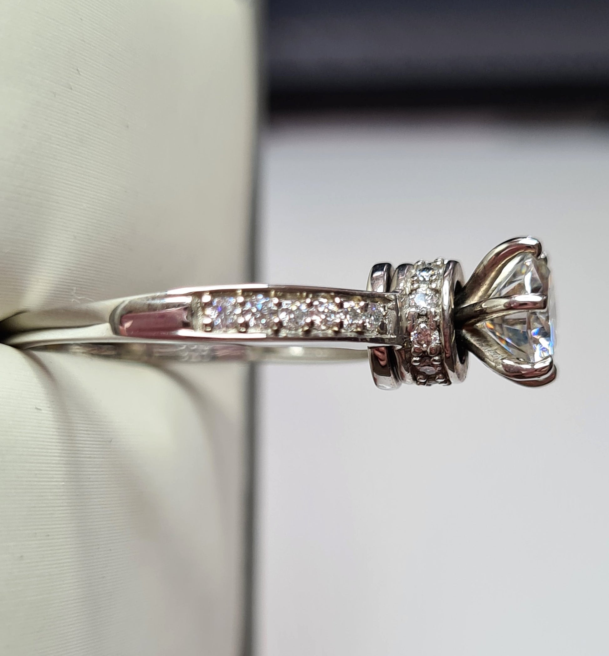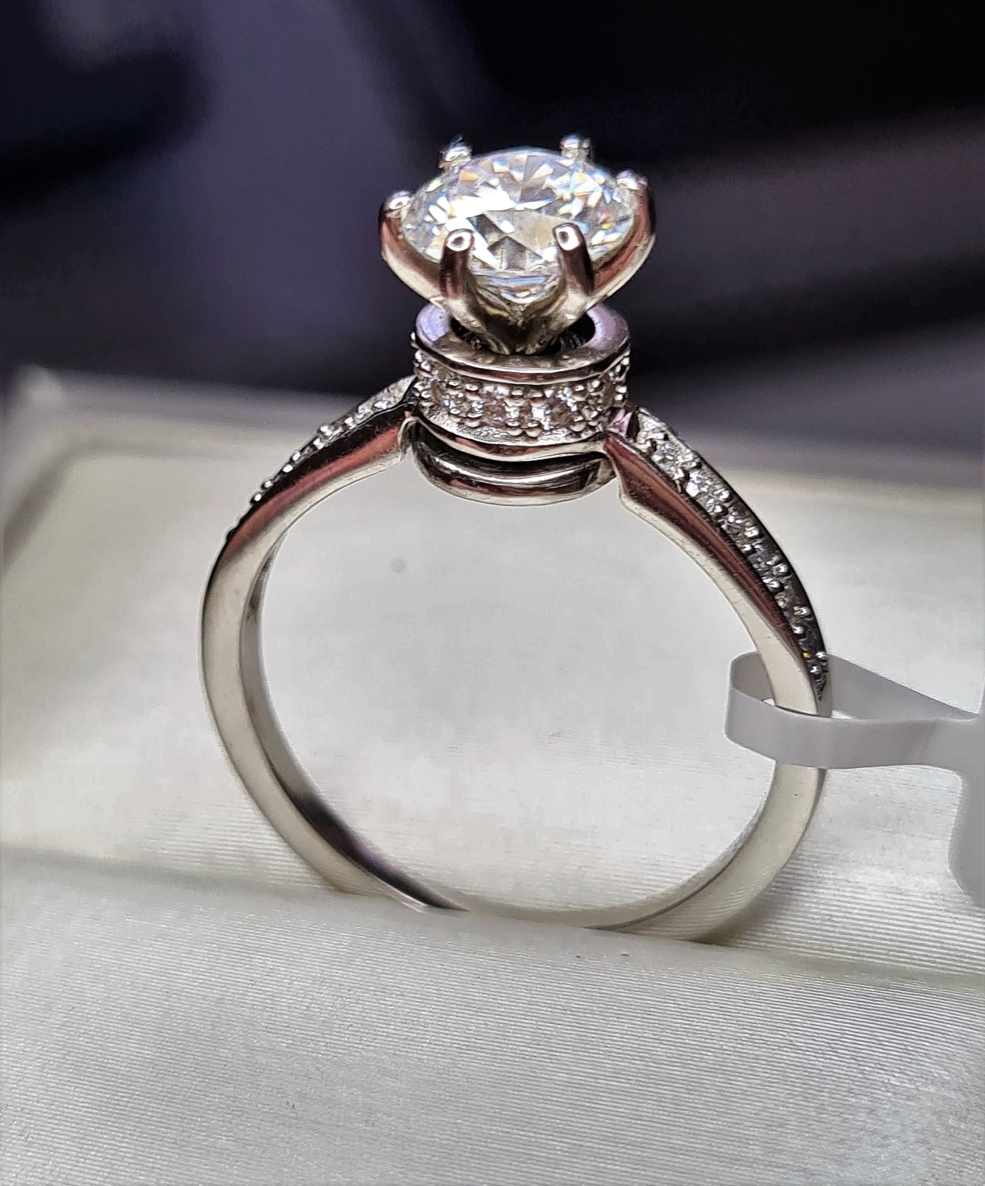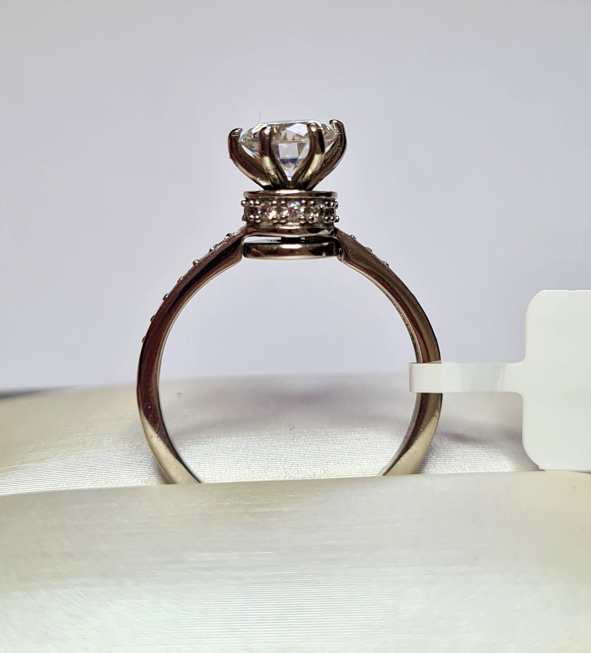 With a total carat weight of 1.17ct, the centrepiece of this ring is a Moissanite round-cut stone, measuring 6.5mm and featuring a faceted cut, with a weight of 0.800ct. What makes this engagement ring truly unique is the rotating centre stone, offering a distinctive feature that's perfect for those with anxiety and adding an interactive element to the ring.