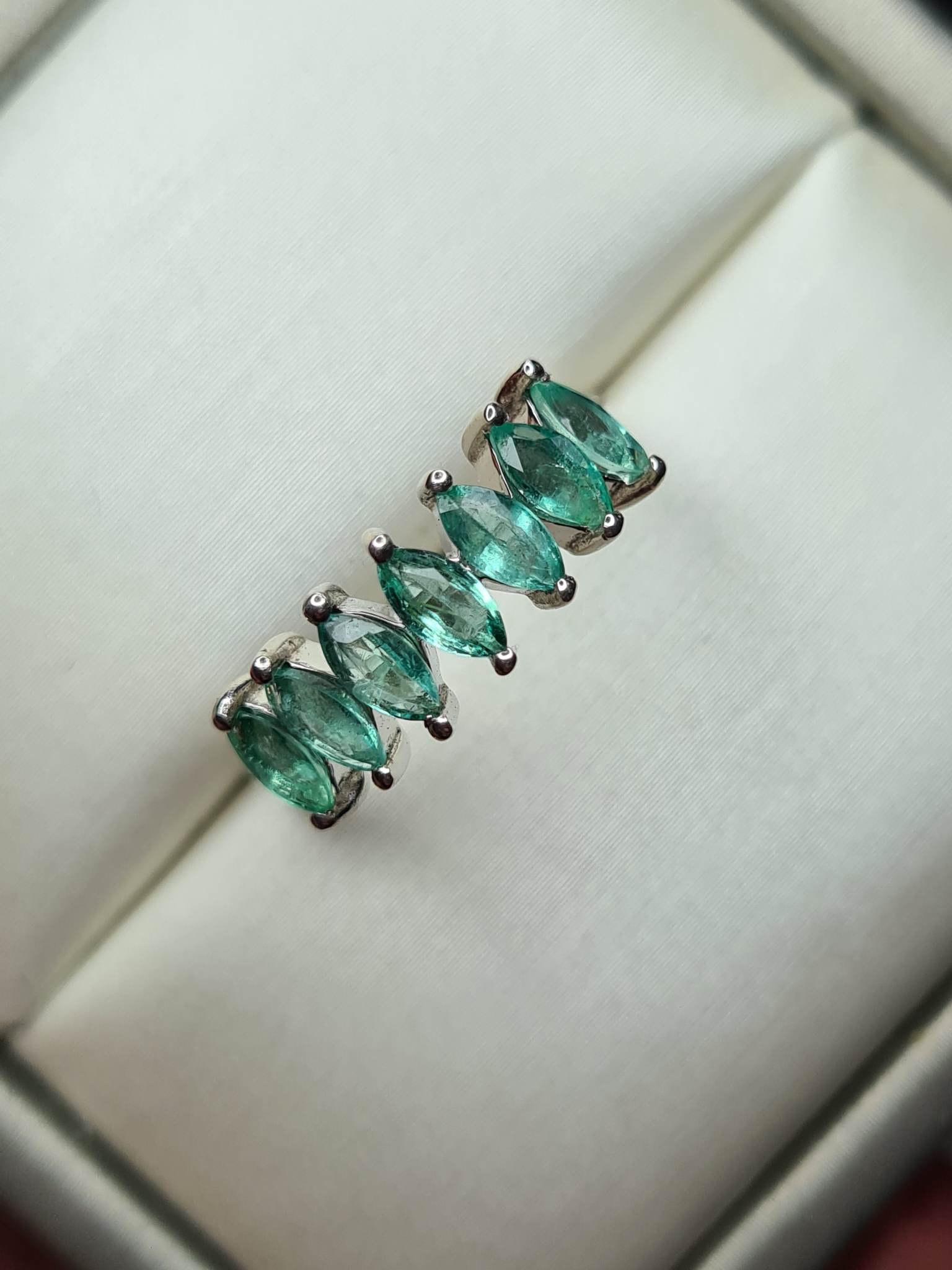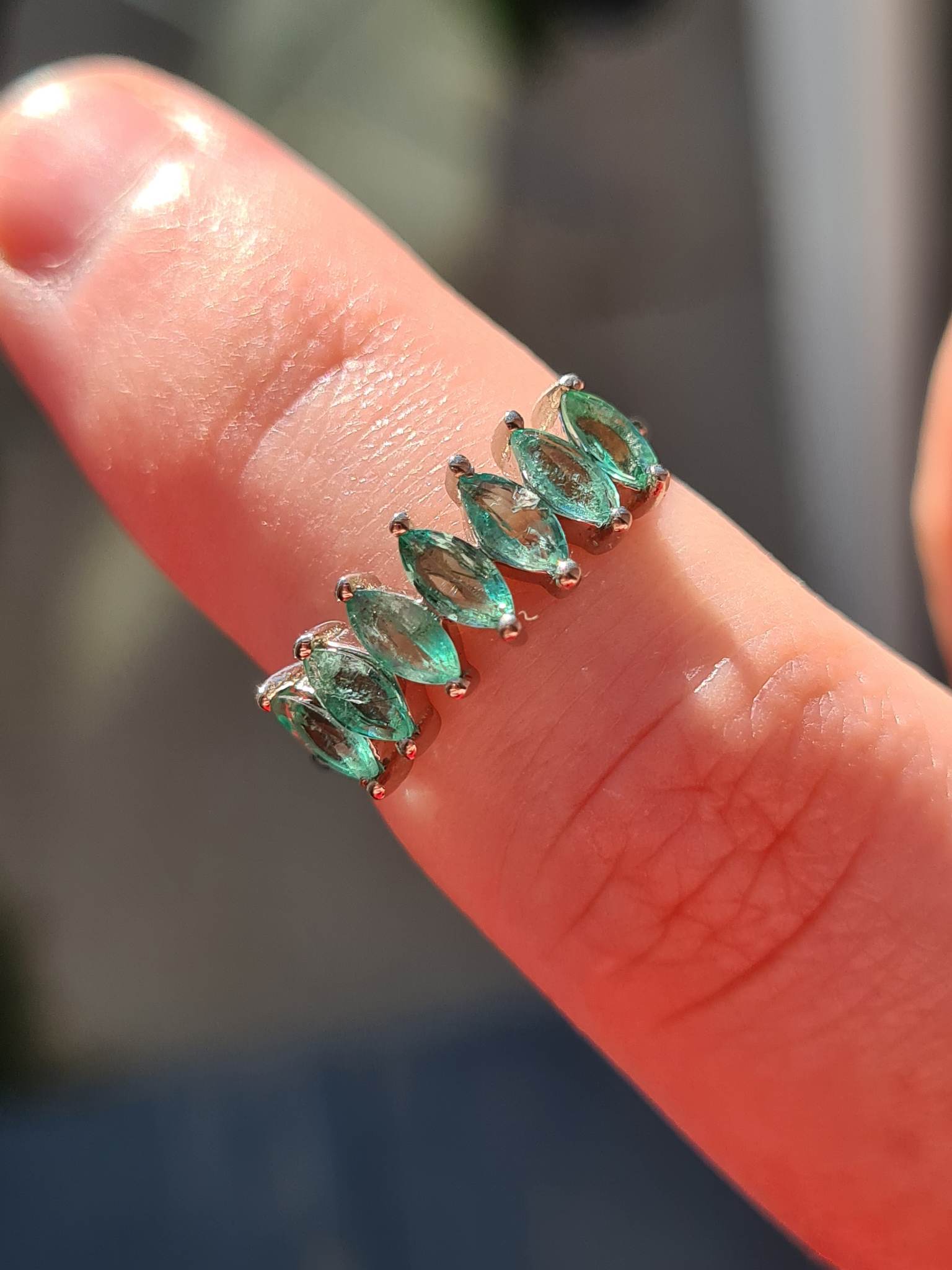 The seven marquise-cut emeralds adorning this ring are not just exquisite in their beauty but also a mark of exclusivity. Marquise cuts, known for their elegant elongated shape, are considered one of the more expensive and labor-intensive cuts due to the significant amount of material needed to craft each stone. The resulting allure, however, is unparalleled, creating a ring that is not just jewelry but a work of art.