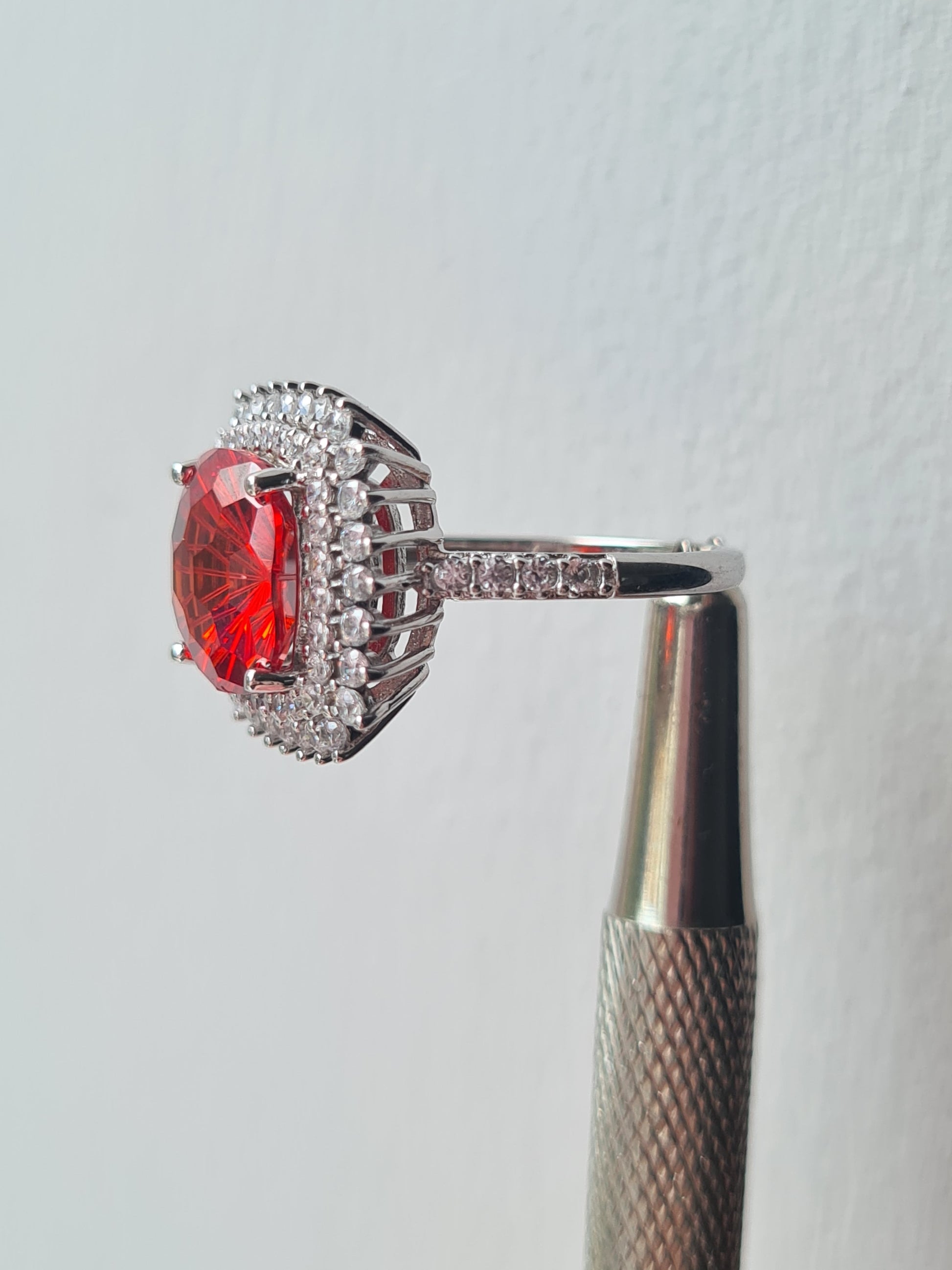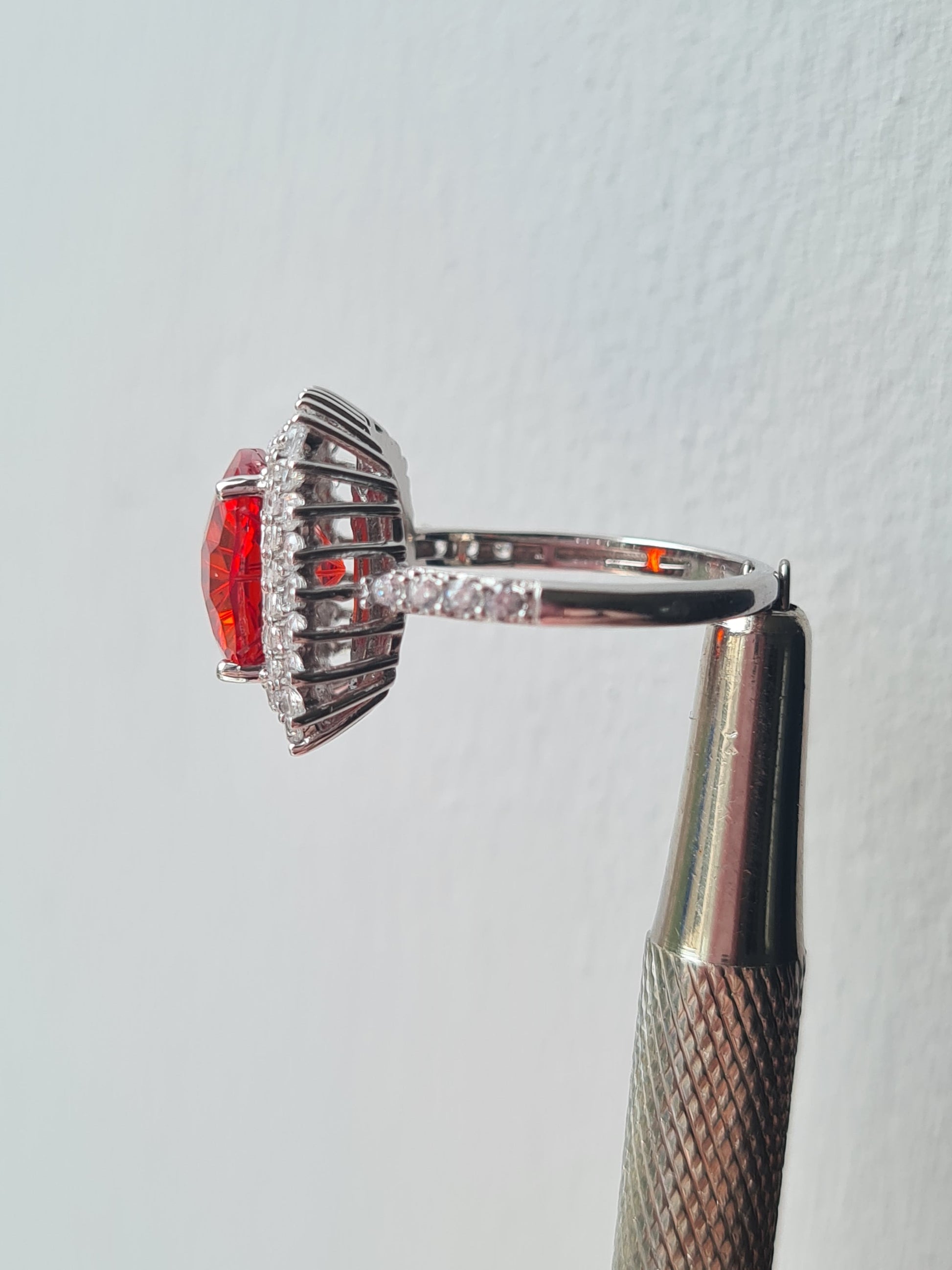 Make a statement with the Halo Simulated Orange Sapphire Ring, a trendsetting piece that effortlessly combines glamour with sophistication. Adorn your finger with this captivating ring, showcasing the brilliance of simulated orange sapphires and the sparkle of simulated white diamonds.