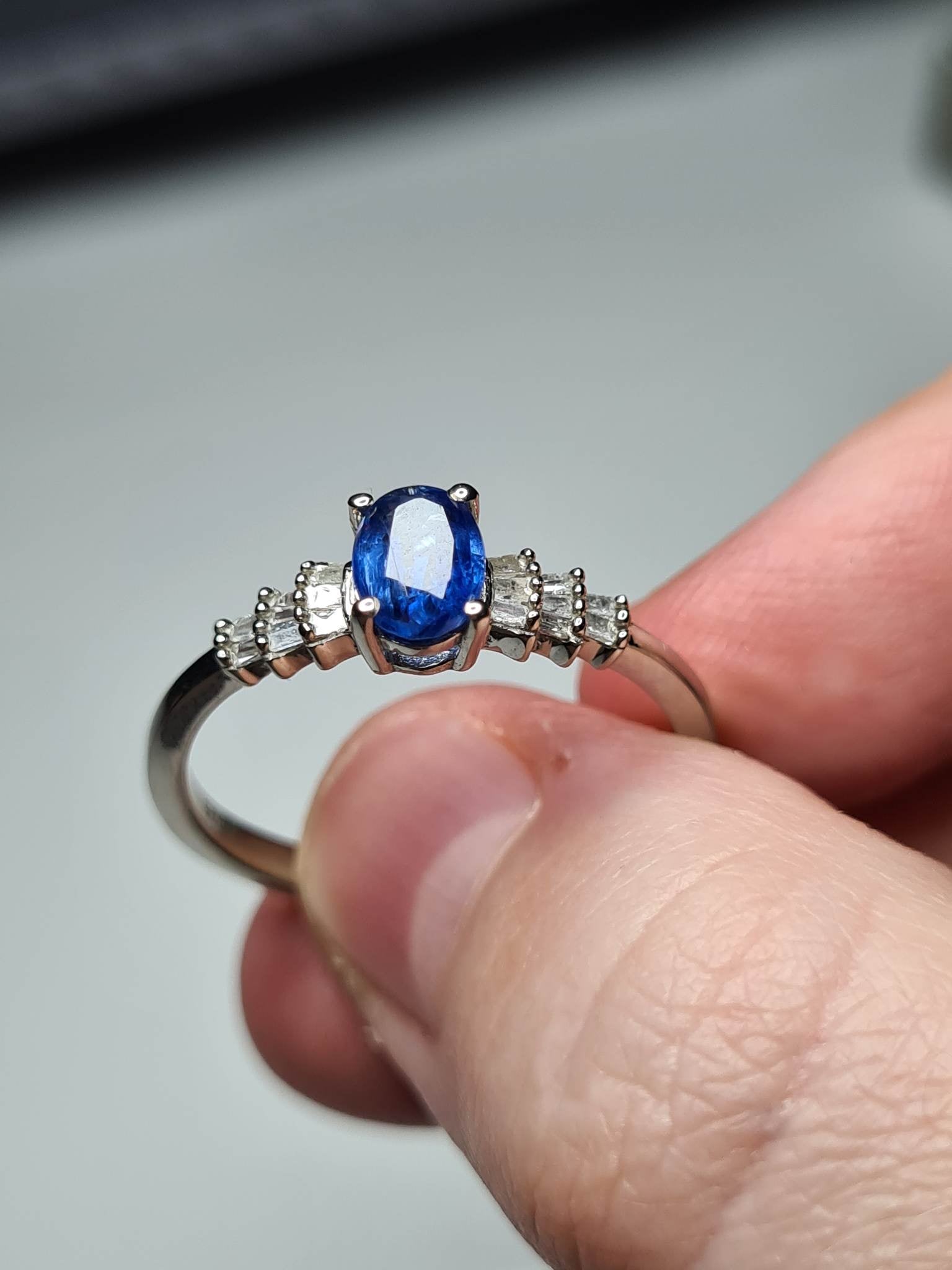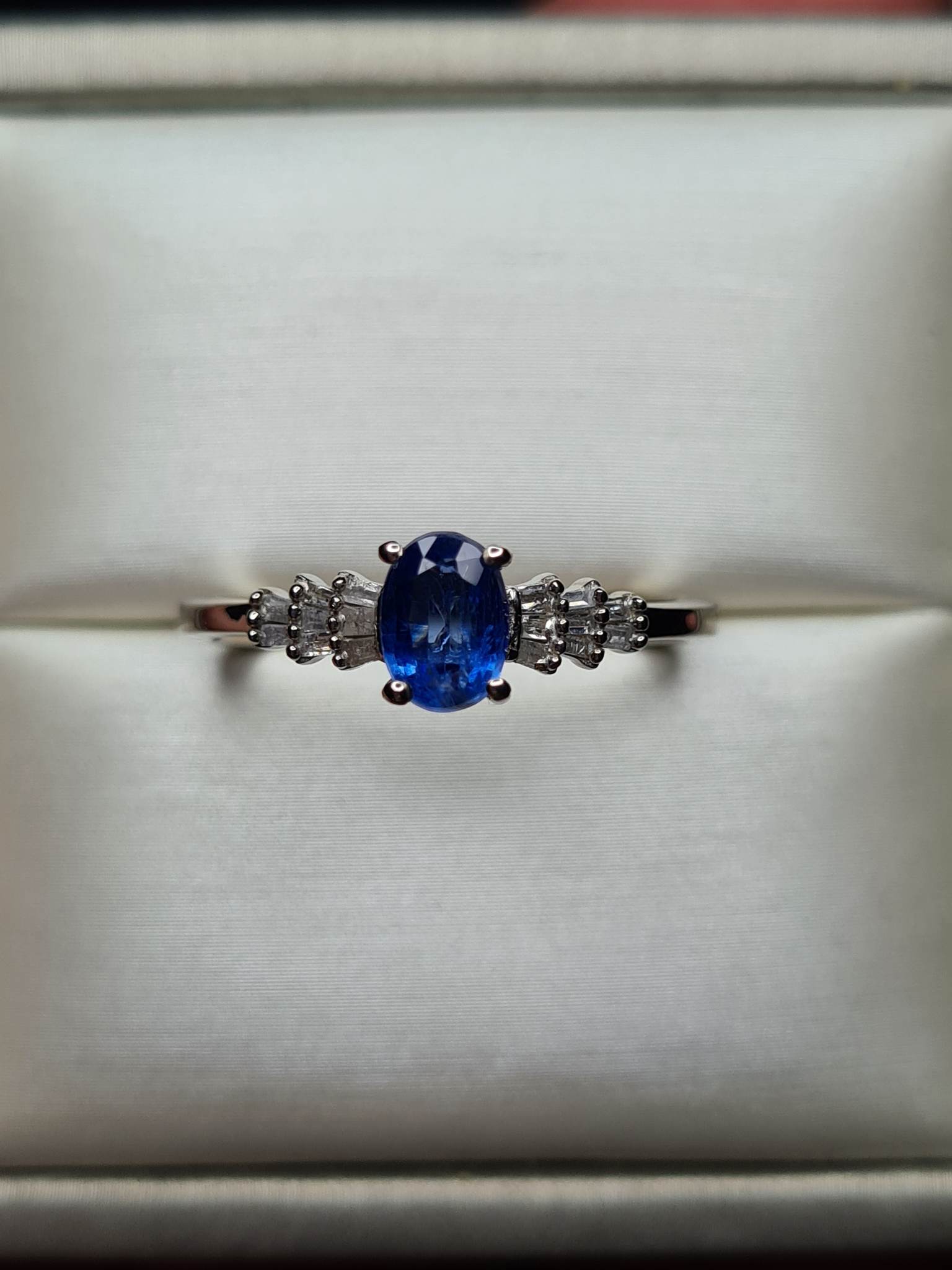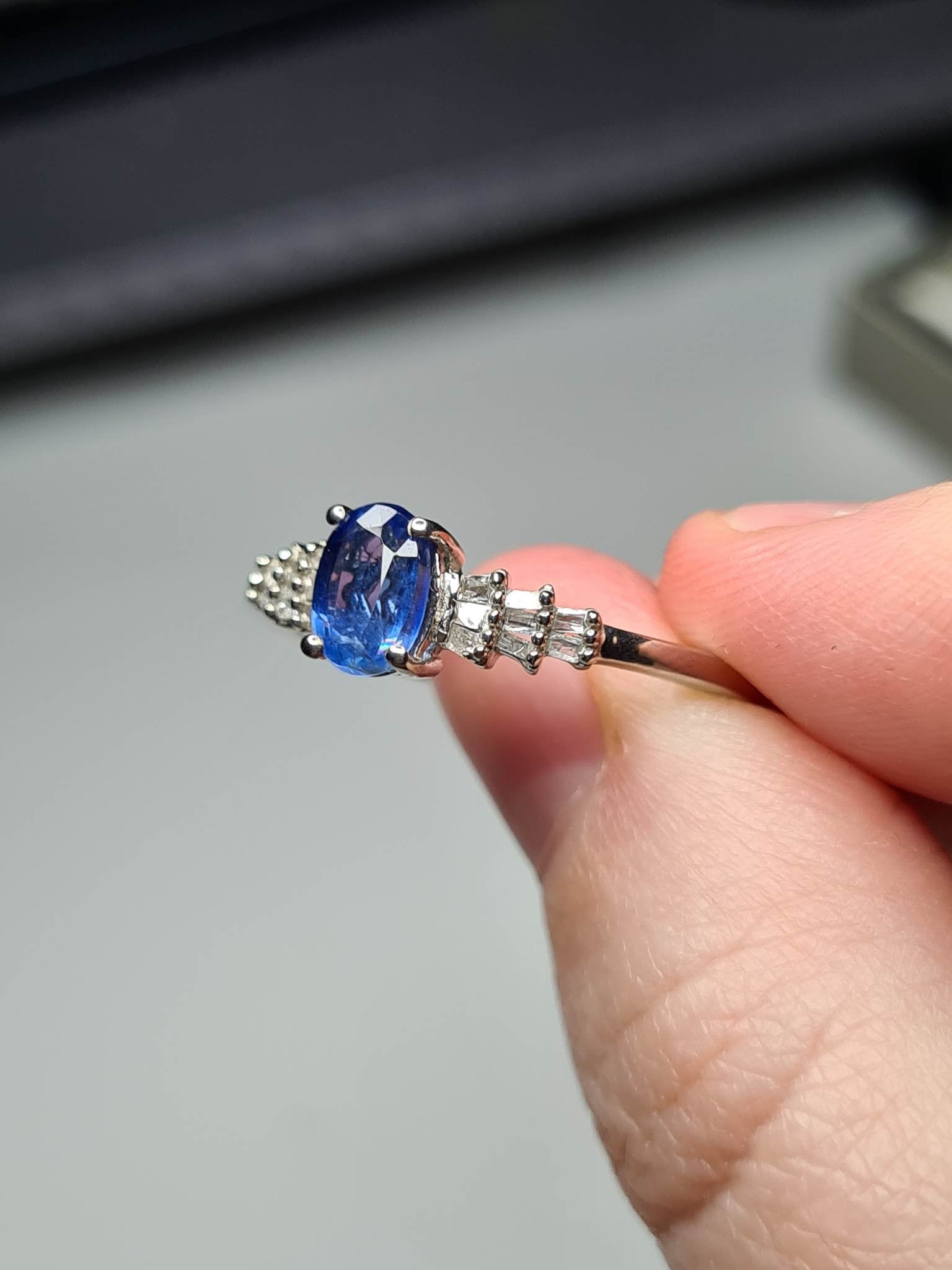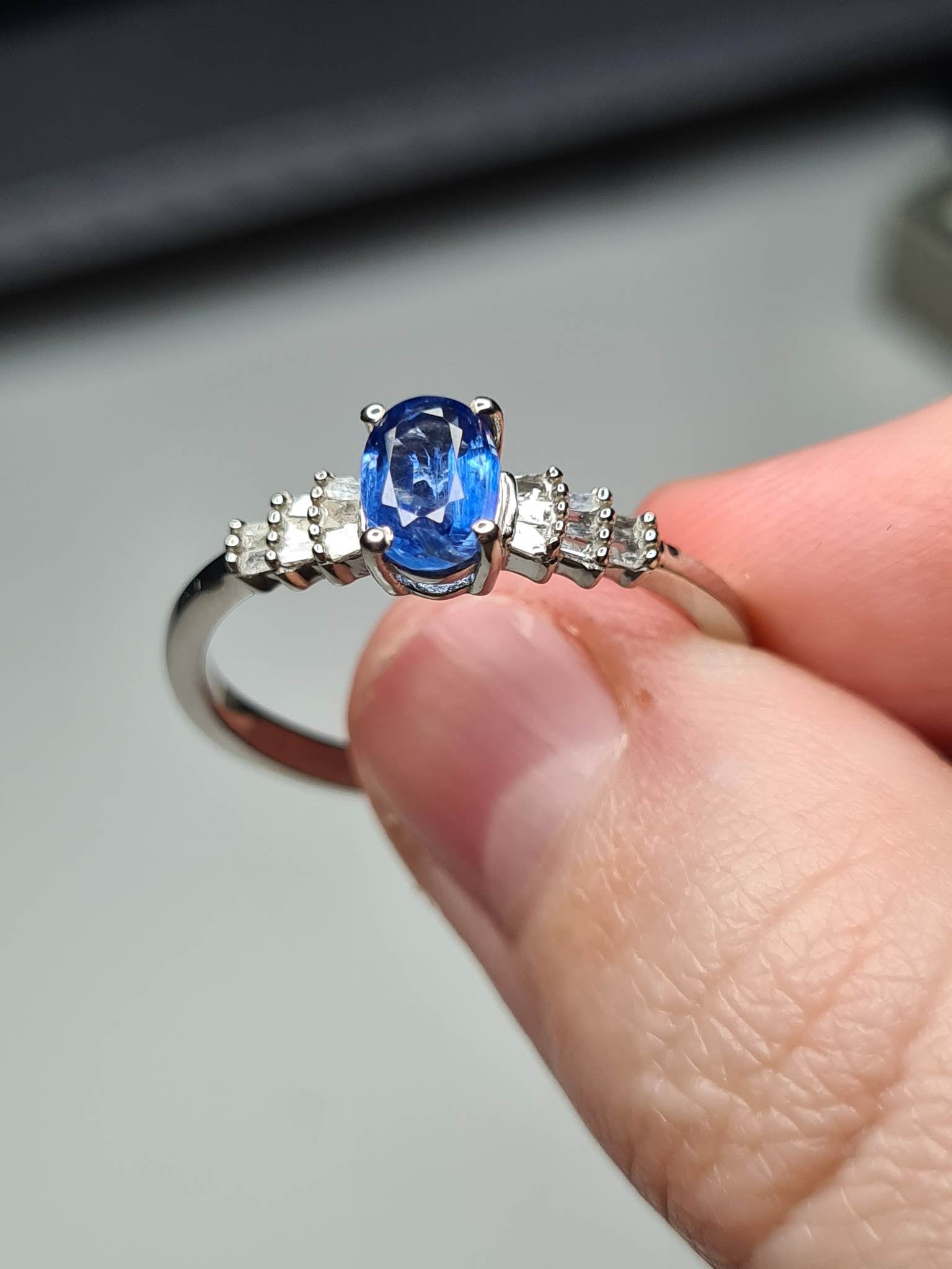 - Kashmir Kyanite Oval: The central gemstone is a captivating 7x5mm faceted cut Kashmir Kyanite, with a substantial weight of 1.040ct. Known for its alluring blue hue, the Kashmir Kyanite adds a touch of sophistication to the ring.