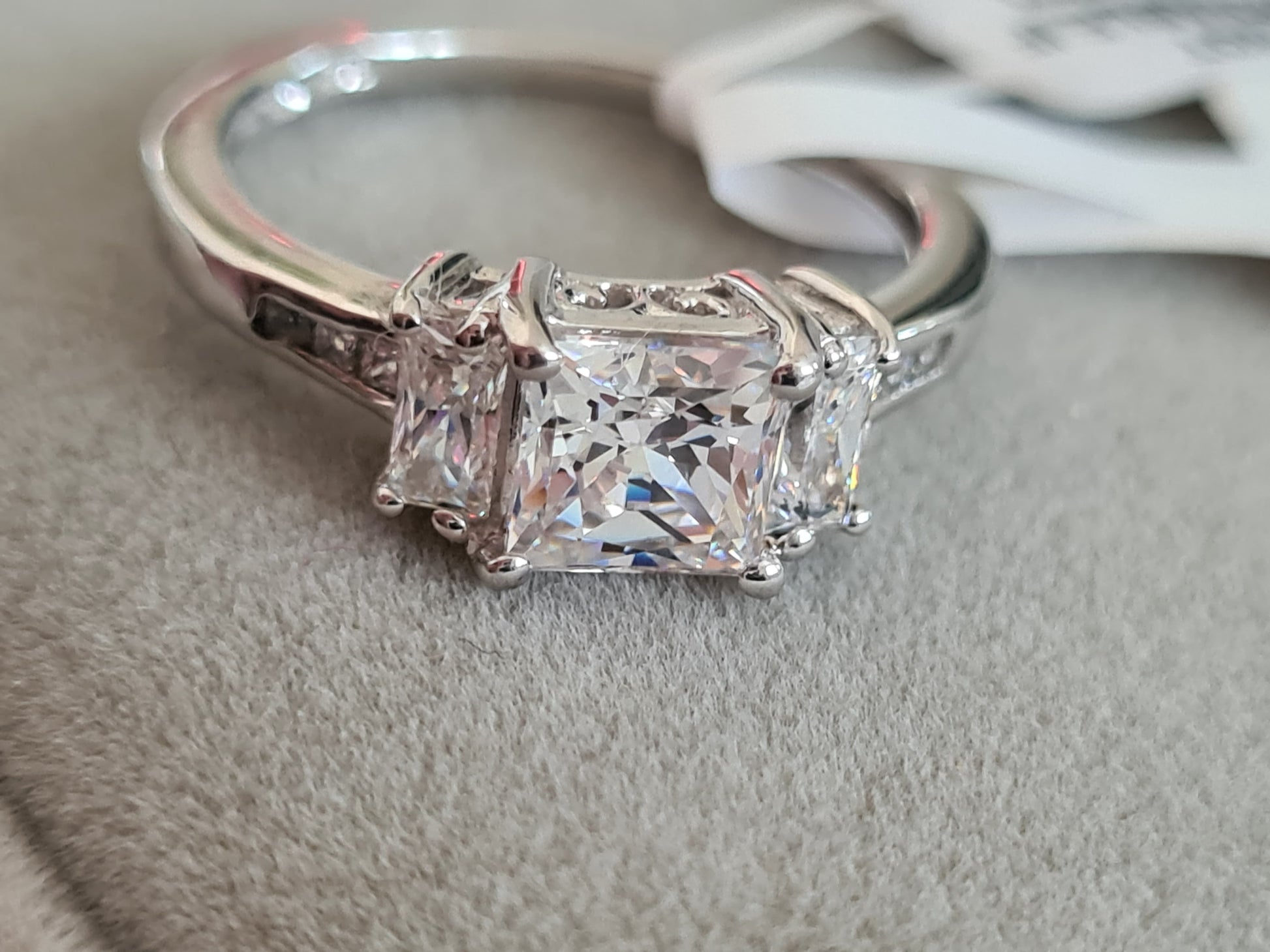 - Square cut center stone and baguette cut stones replicate the look of real flawless diamonds.