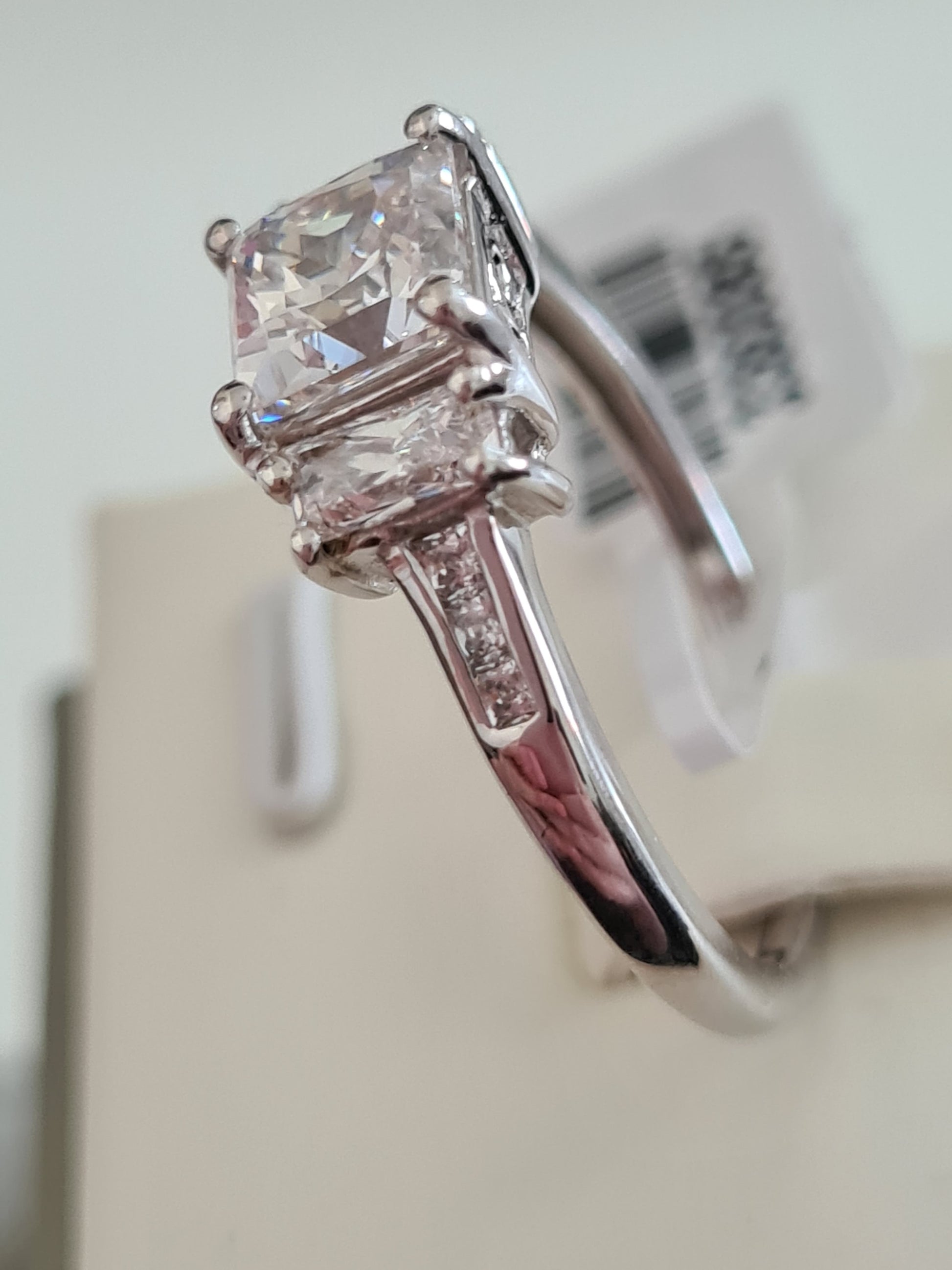 Indulge in the timeless allure of our Sterling Silver Swarovski Zirconia Ring—a radiant creation set in solid 925 sterling silver. Perfect for engagements, weddings, promises, or everyday wear, this ring features a square-cut center stone flanked by baguette-cut stones on either side and small round cut stones embedded into the shoulders, all adorned with Swarovski Zirconia.