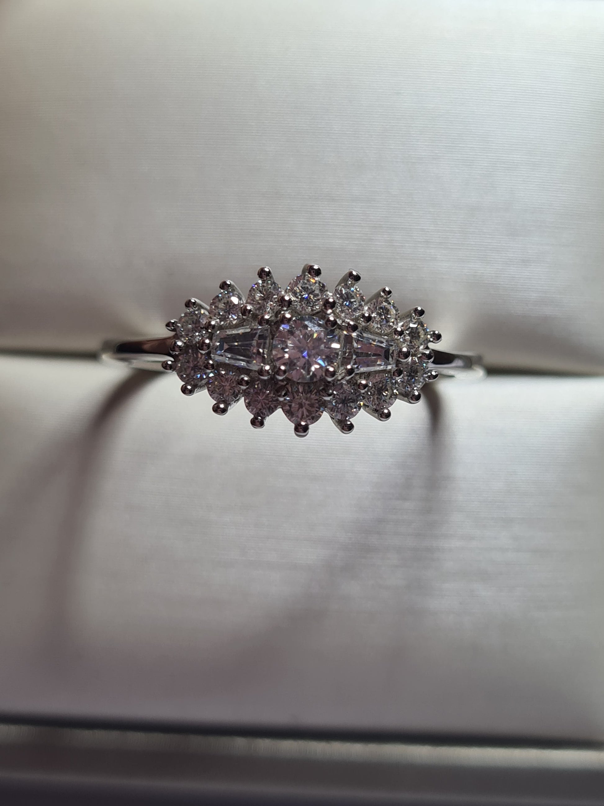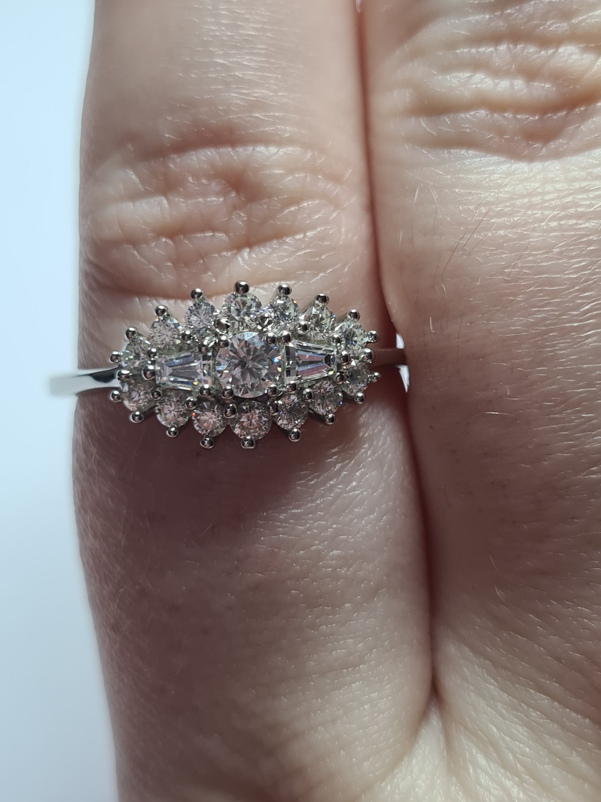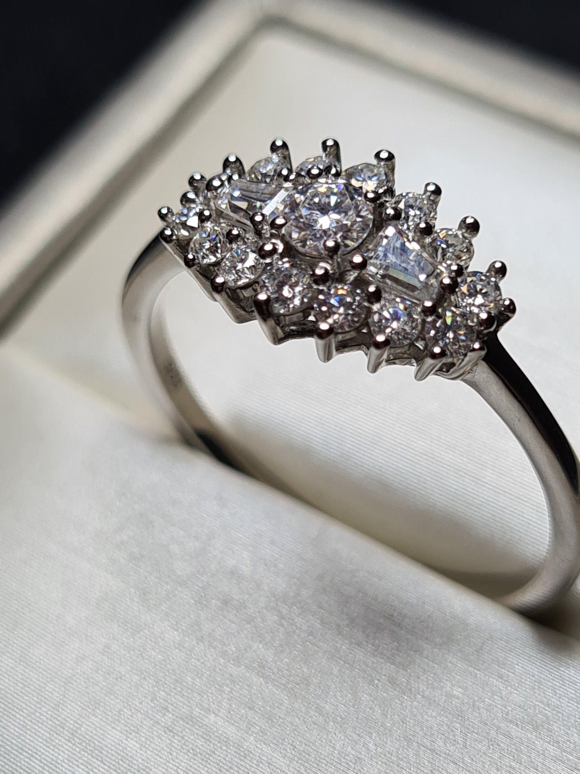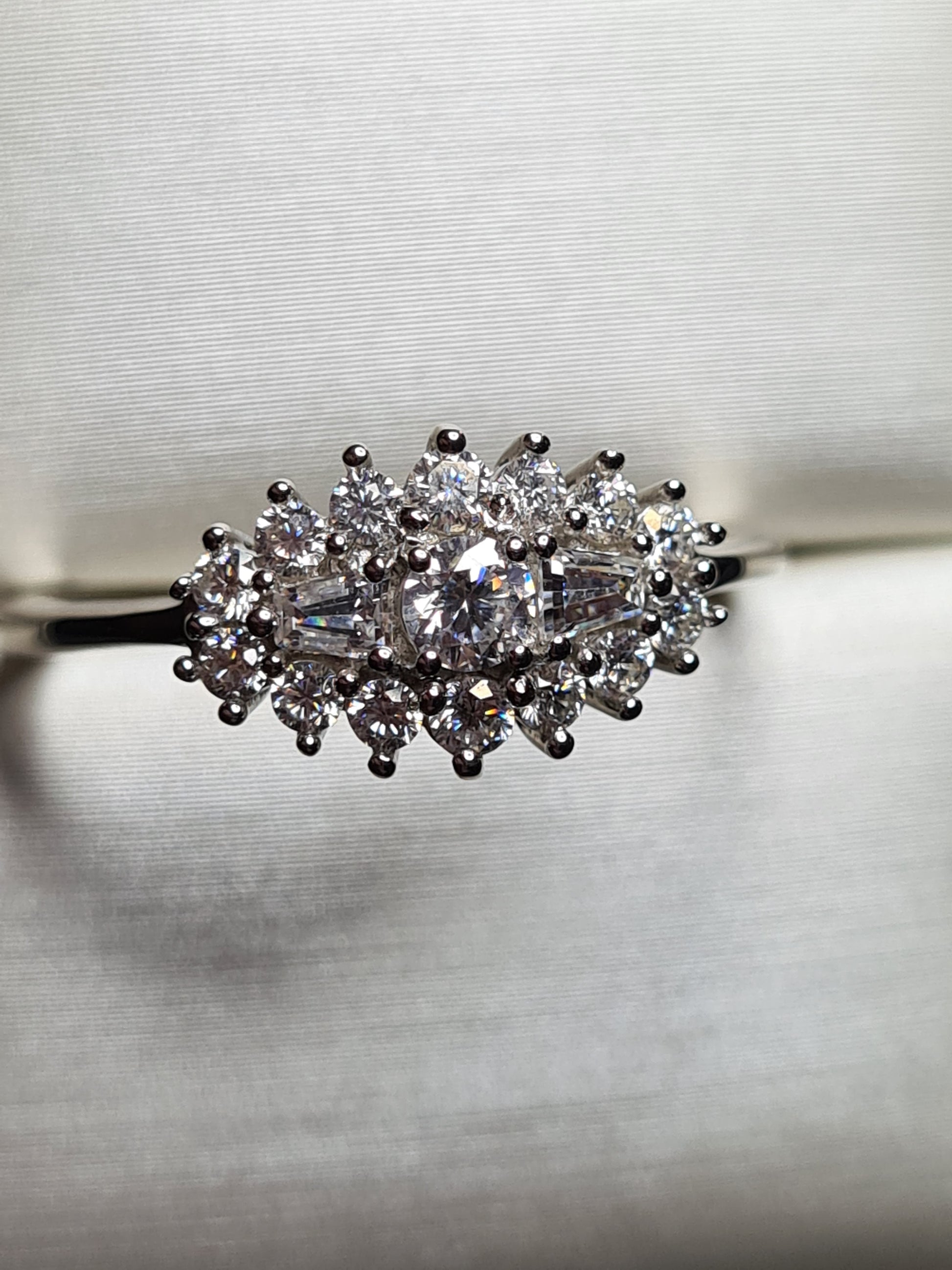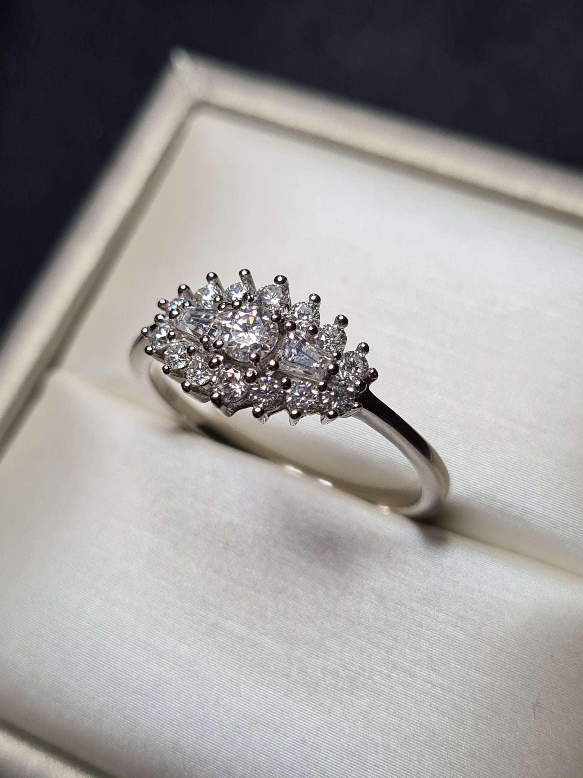 - Consists of round and baguette cut Moissanites totaling 0.780ct.