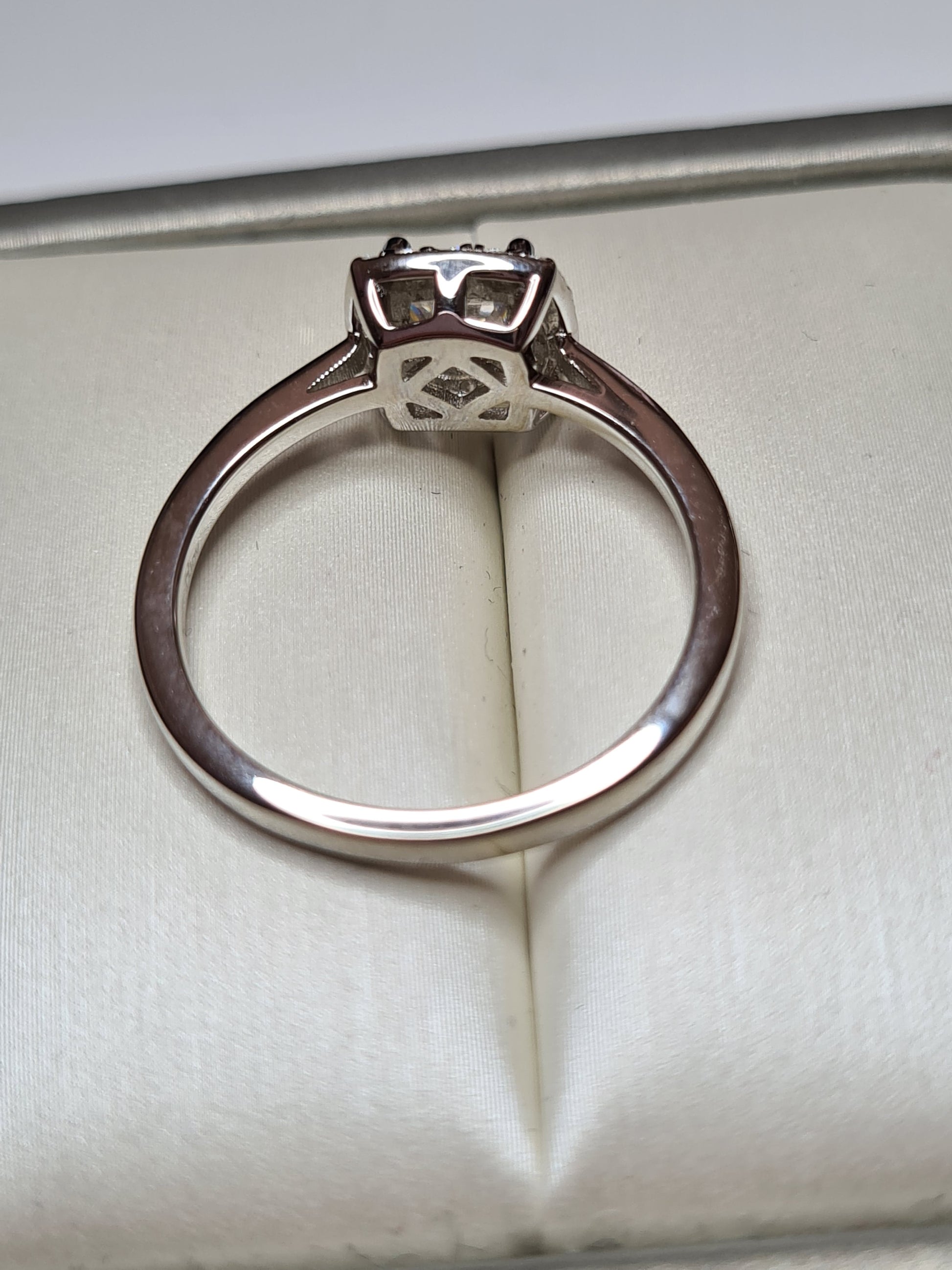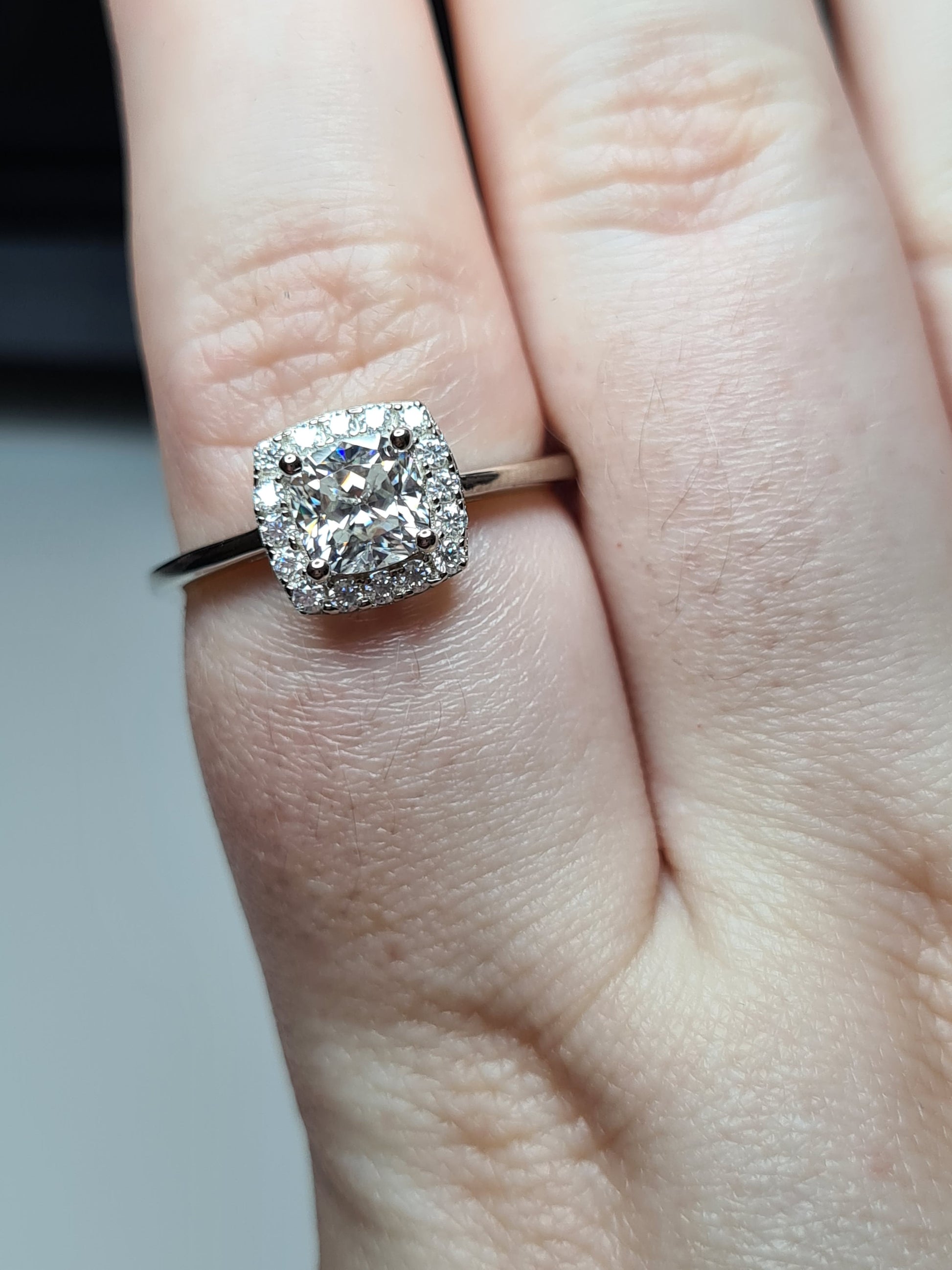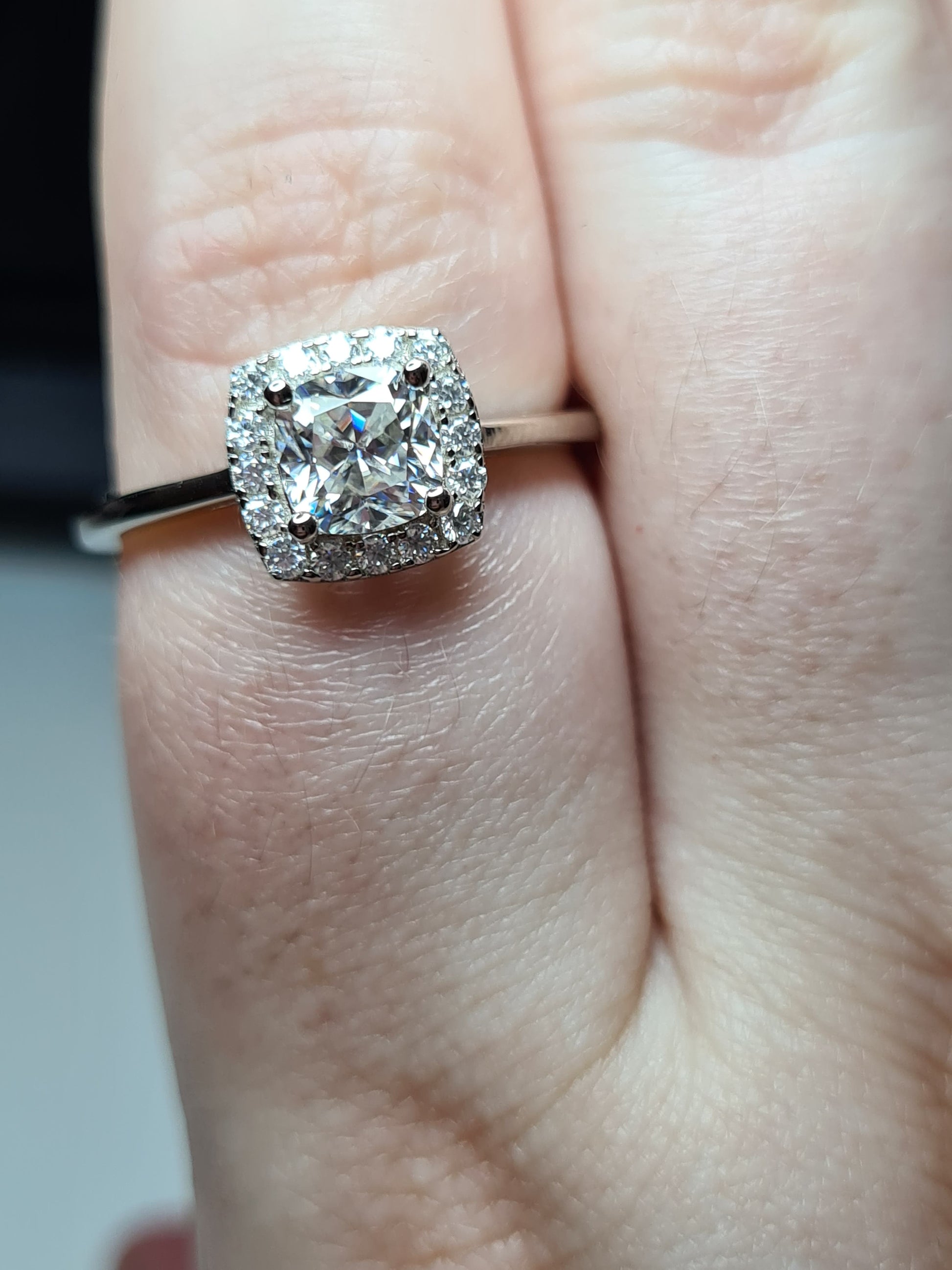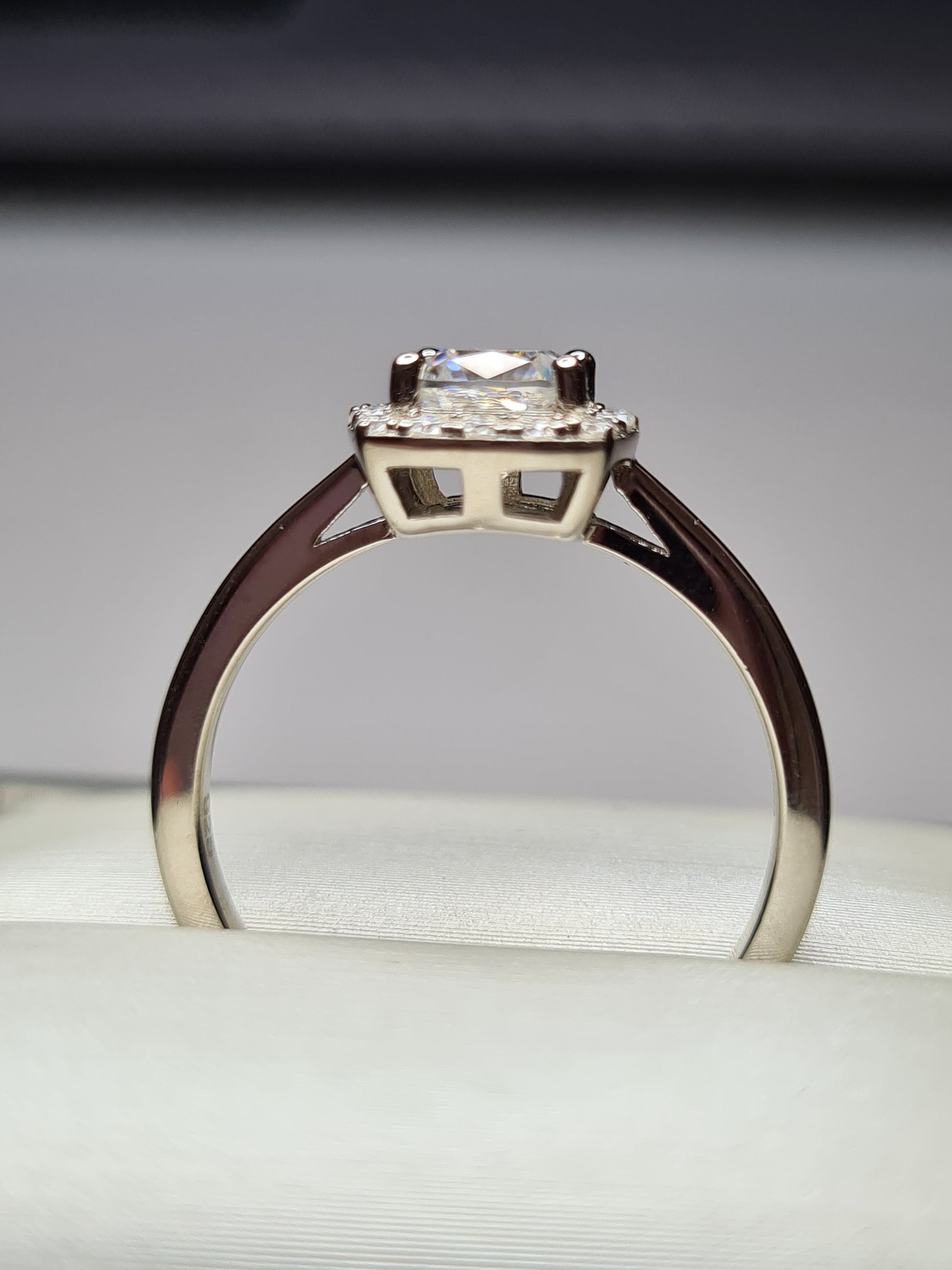 - Center Stone: Moissanite Cushion 6x6mm Faceted Cut, 1.000ct