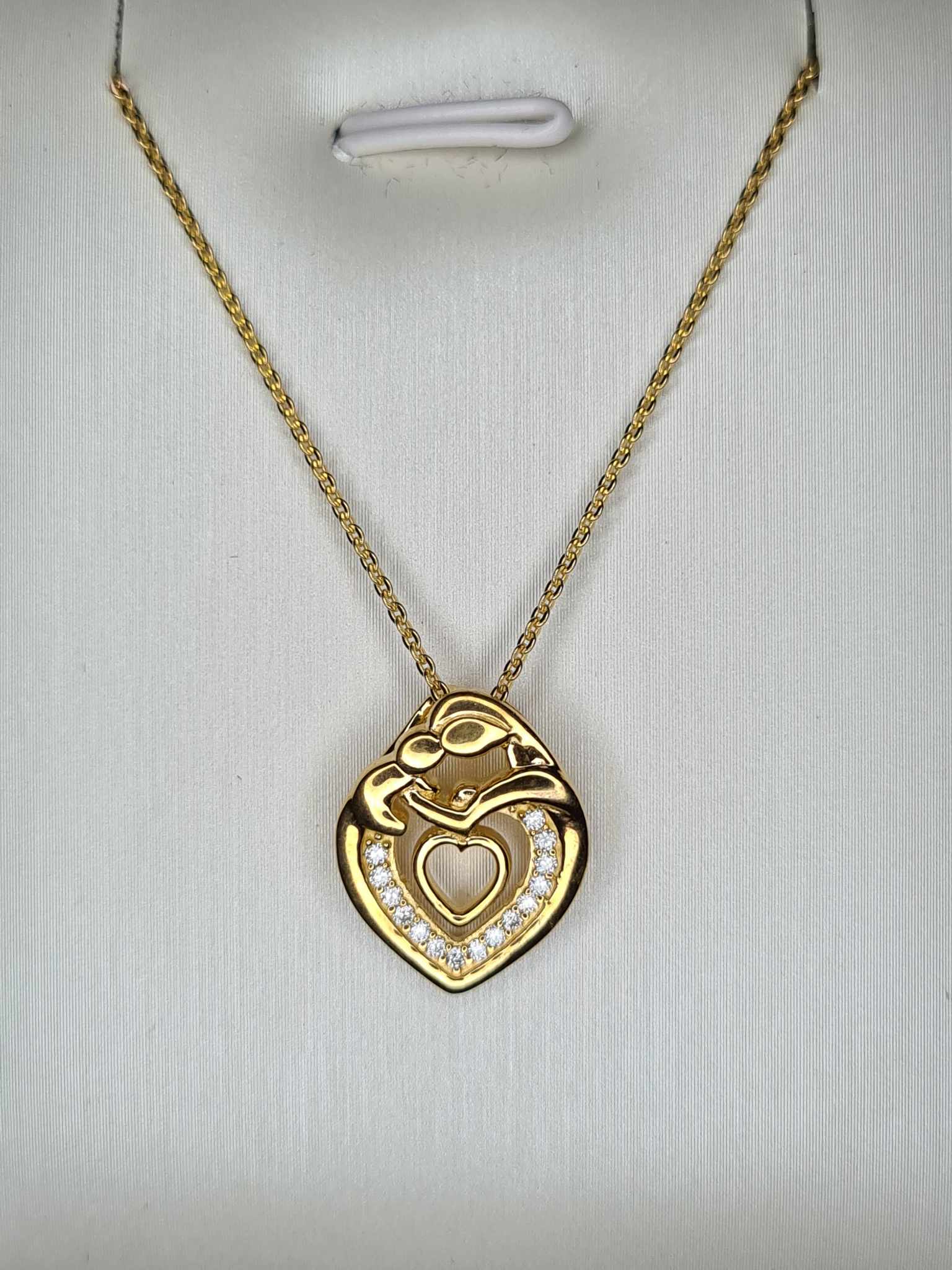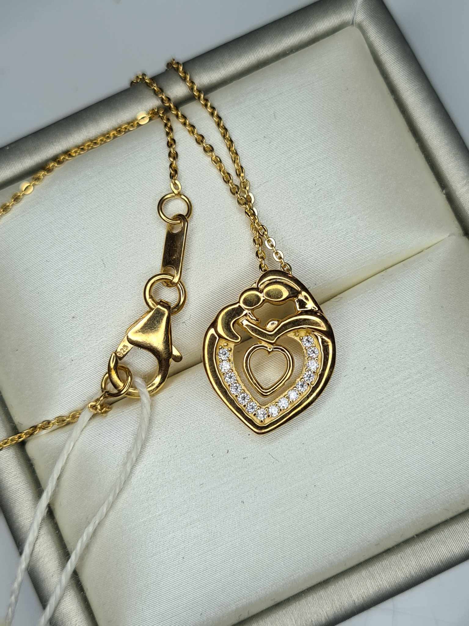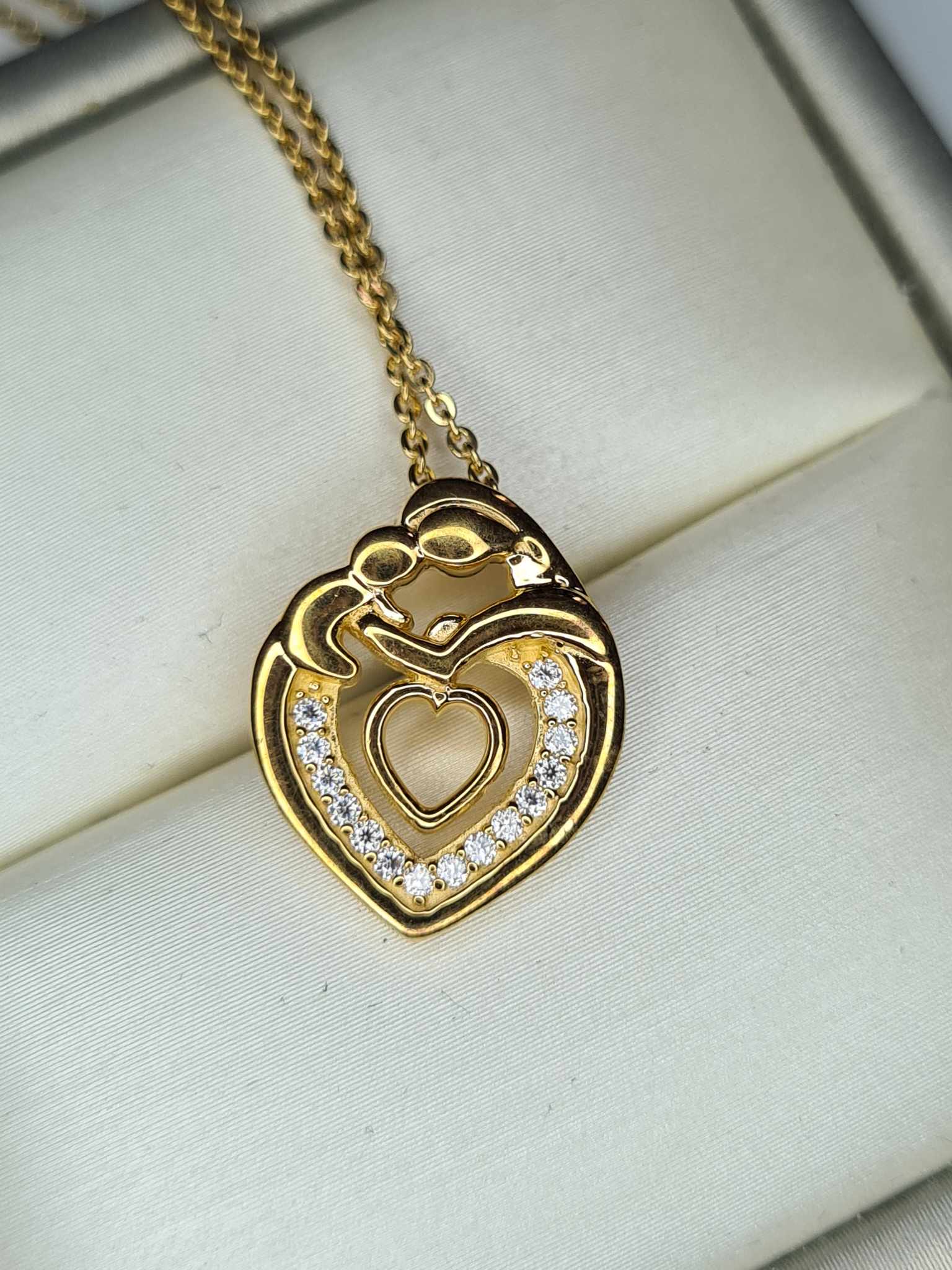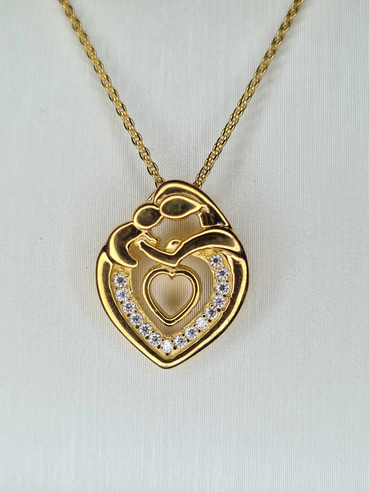 Enhance your style with our 18K Gold Overlay Moissanite Heart Mother Necklace—a stunning piece crafted in Hallmarked 925 solid sterling silver with a genuine 18k gold overlay. This necklace not only gives the look of a solid 18k gold piece but also features a unique pendant design that captures the essence of love and motherhood.