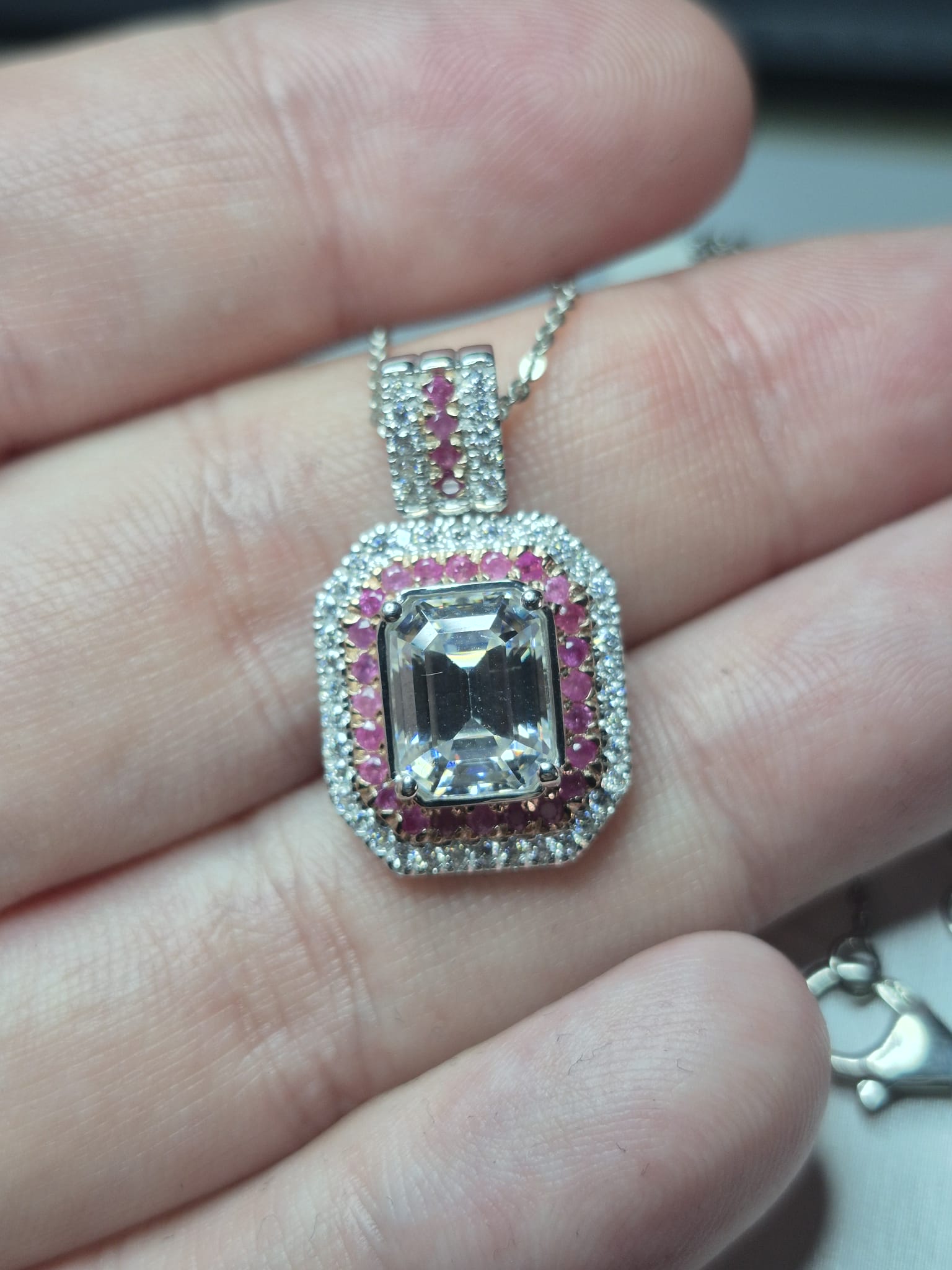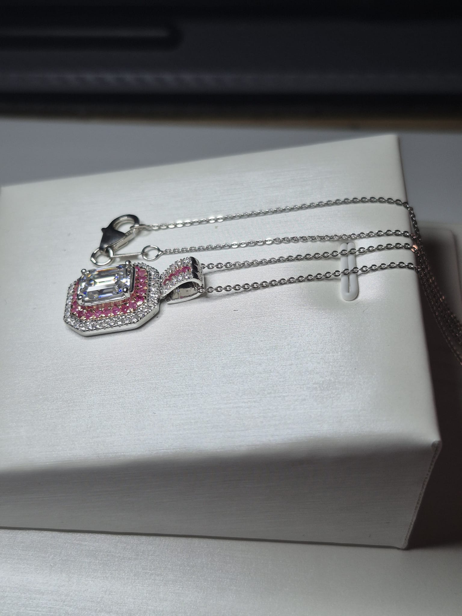 Moissanite & Pink Sapphire Necklace Rhodium Overlay 925 Sterling Silver