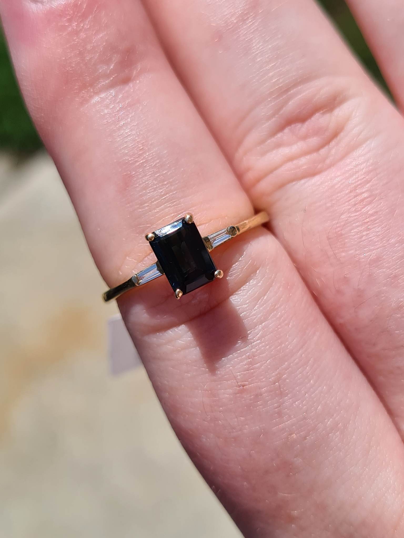 Step into a world of unparalleled elegance with our Monte Belo Indicolite and Diamond Baguette Ring. Crafted in sumptuous 14K gold, this exquisite ring features rare gemstones, creating a harmonious composition that captures attention.