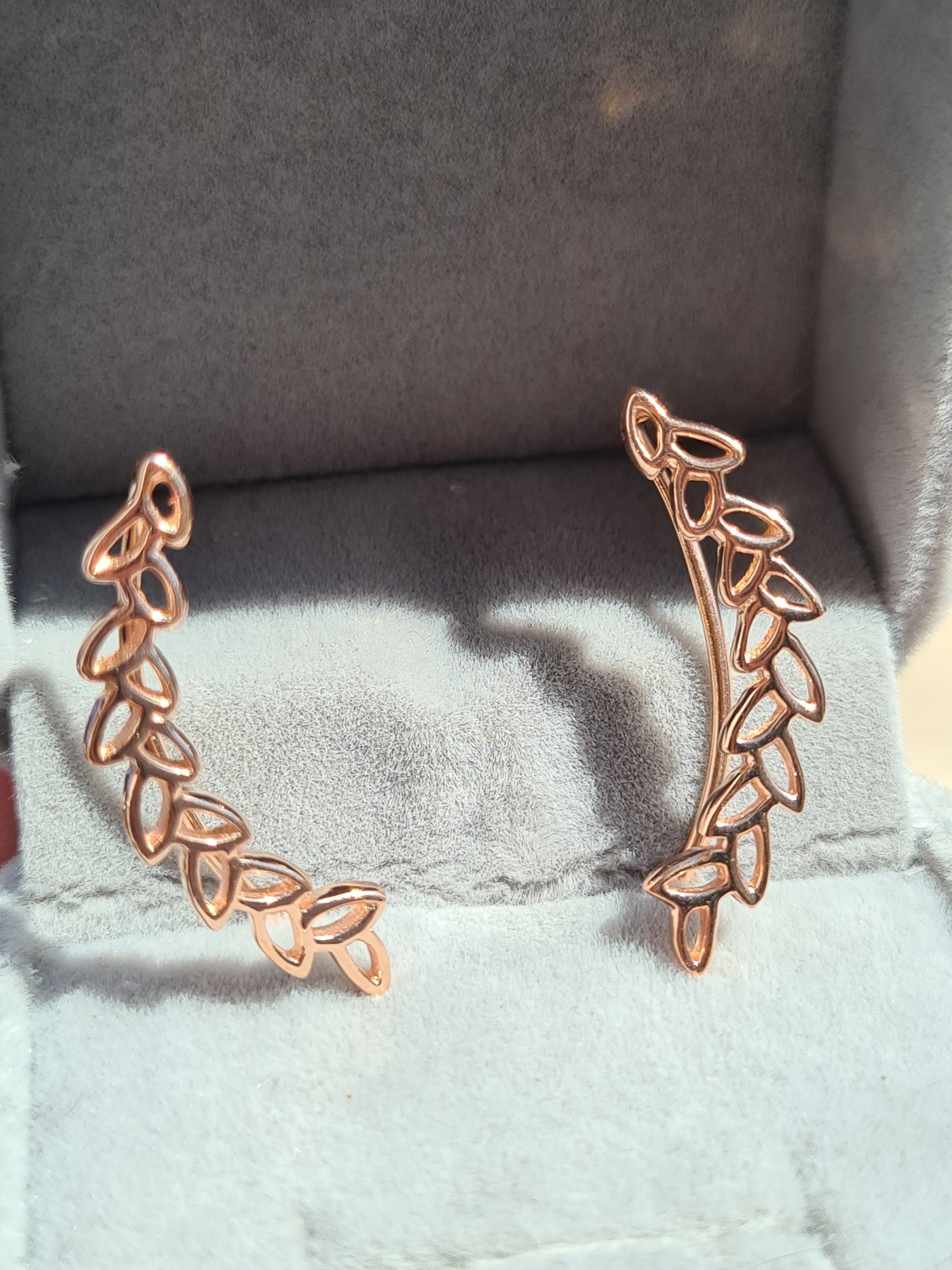 Indulge in the beauty of our Rose Gold Overlay Sterling Silver Wheat-inspired Earrings. Crafted in hallmarked 925 sterling silver with a glowing rose gold tone, these earrings feature a unique climber concept, allowing for versatile styling. The wheat-inspired design adds a touch of cool sophistication to these delightful earrings.